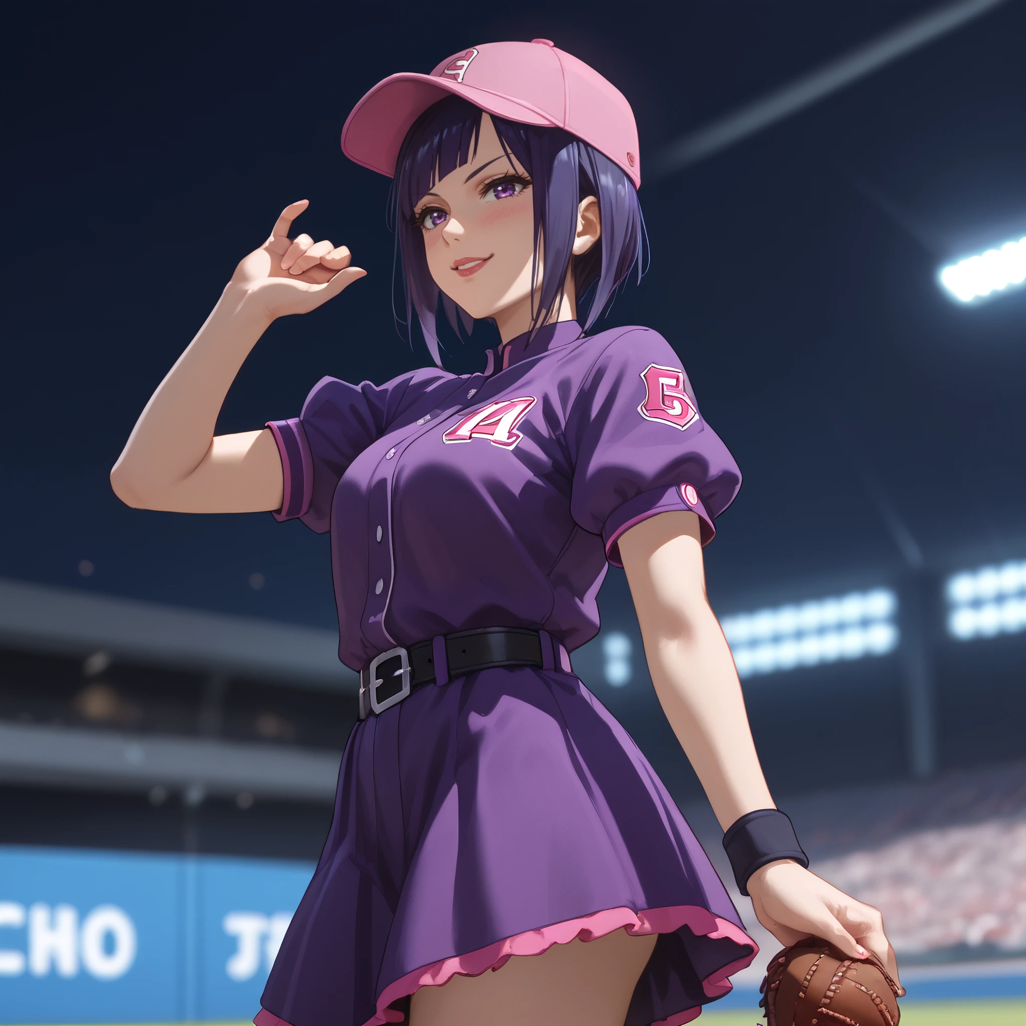 RankoBaseball, hat, short sleeves, puffy sleeves, belt, purple skirt, purple shirt, pink headwear, shirt,