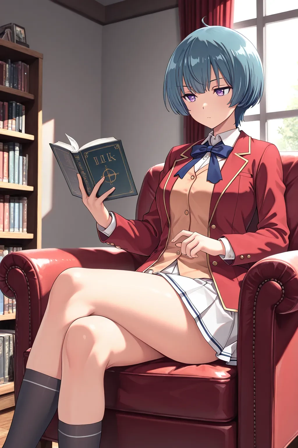 school uniform, neck ribbon, red jacket, pleated skirt, socks, loafers,