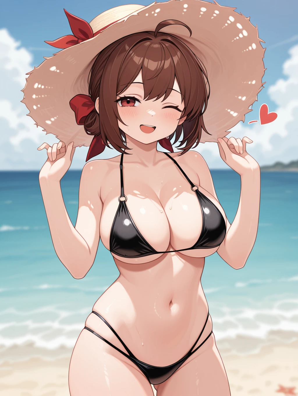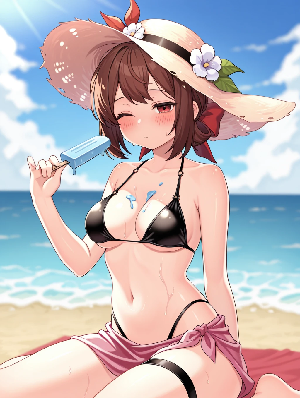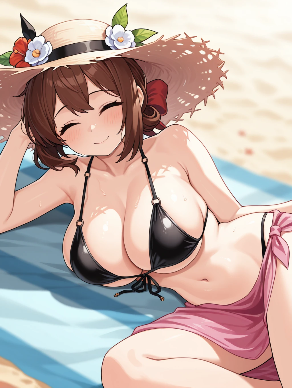 summer_loraine, 1girl, solo, large breasts, brown hair, hat, navel, cleavage, swimsuit, closed eyes, flower, black bikini, on side, sun hat, straw hat, hat flower, sarong