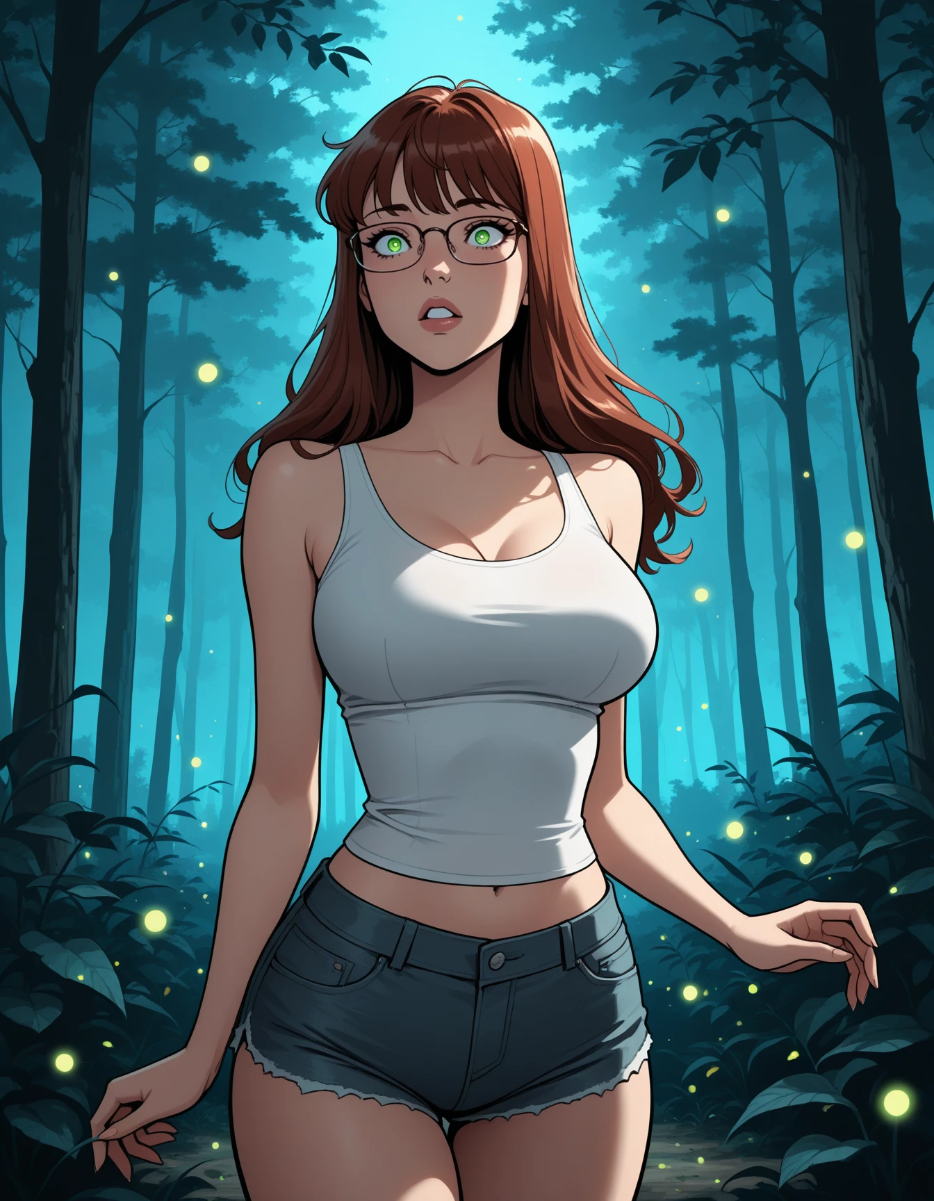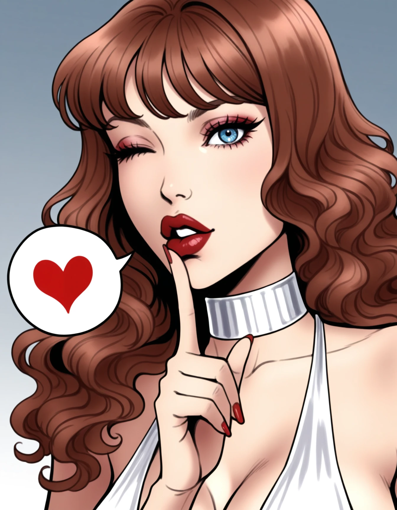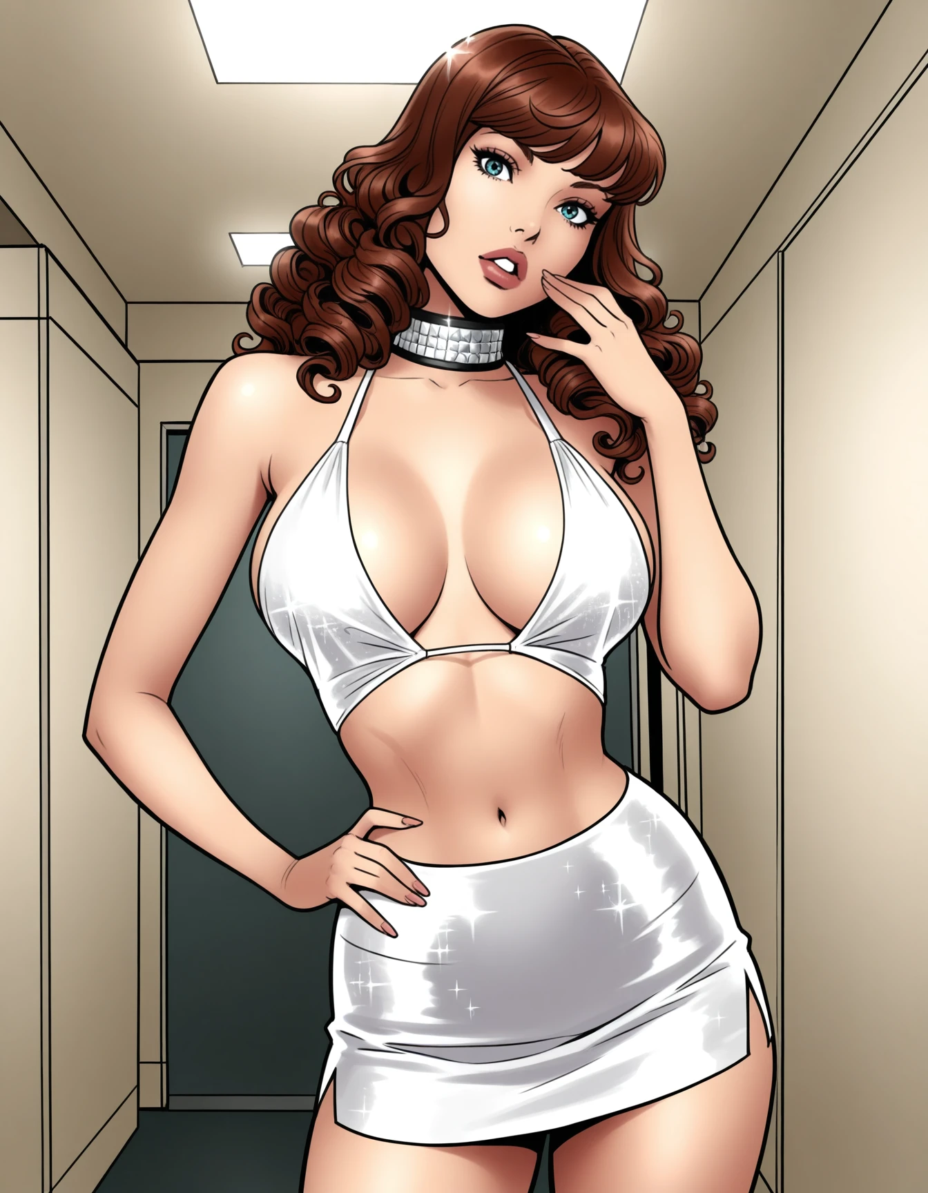 Vamped out syd-v4mp, blue eyes, brown hair, eyelashes, red lips, makeup, wavy hair, luminescent clothing, choker, white halterneck top, revealing clothes, cleavage, breasts apart, slit miniskirt, midriff, navel, white heels, strappy heels