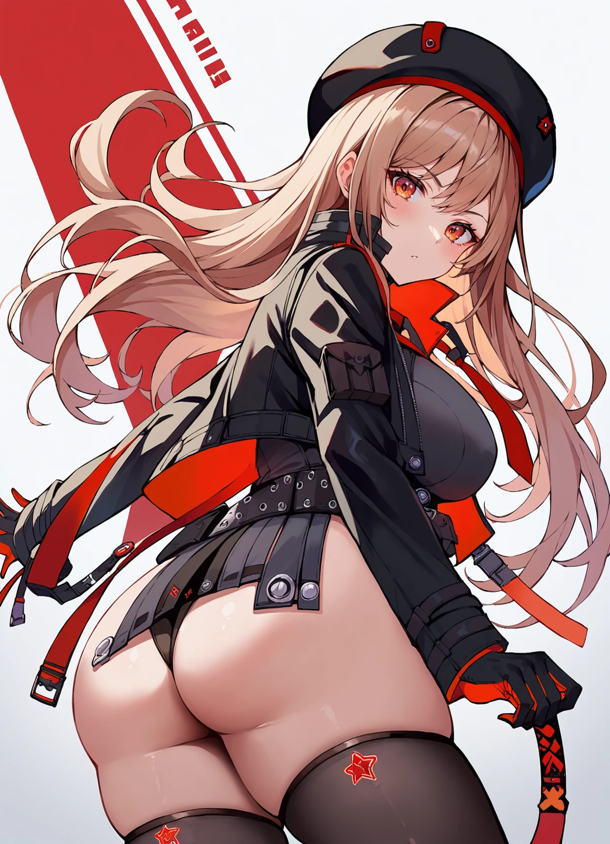 rapi \(nikke\), rapi main, cropped jacket, black leotard, red tie, beret, thighhighs, black gloves, belt