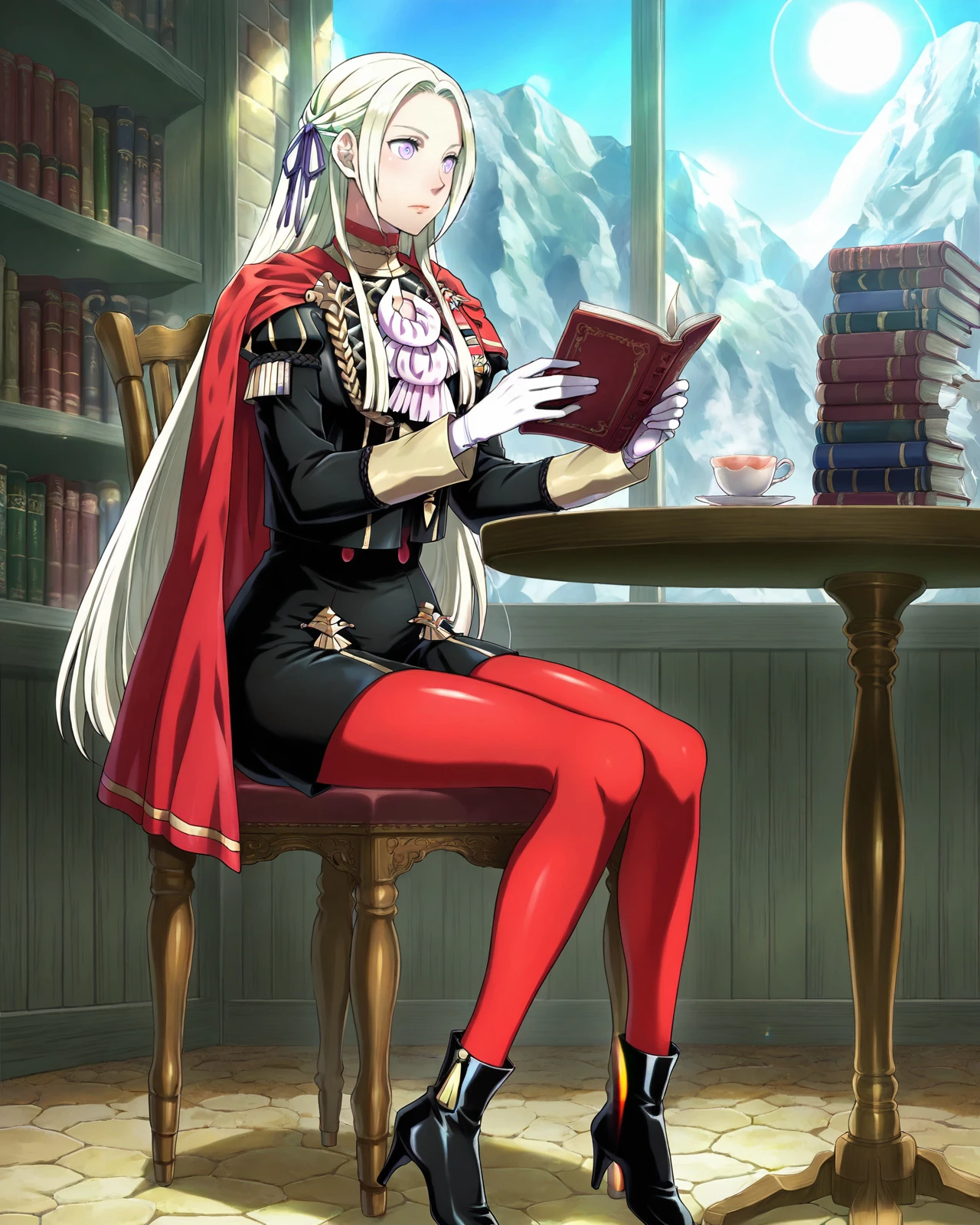 long sleeves, hair ornament, hair ribbon, pantyhose, white gloves, black footwear, cape, high heels, uniform, lips, ascot, high heel boots, purple ribbon, red cape, ankle boots, Garreg Mach monastery uniform, red pantyhose, short dress