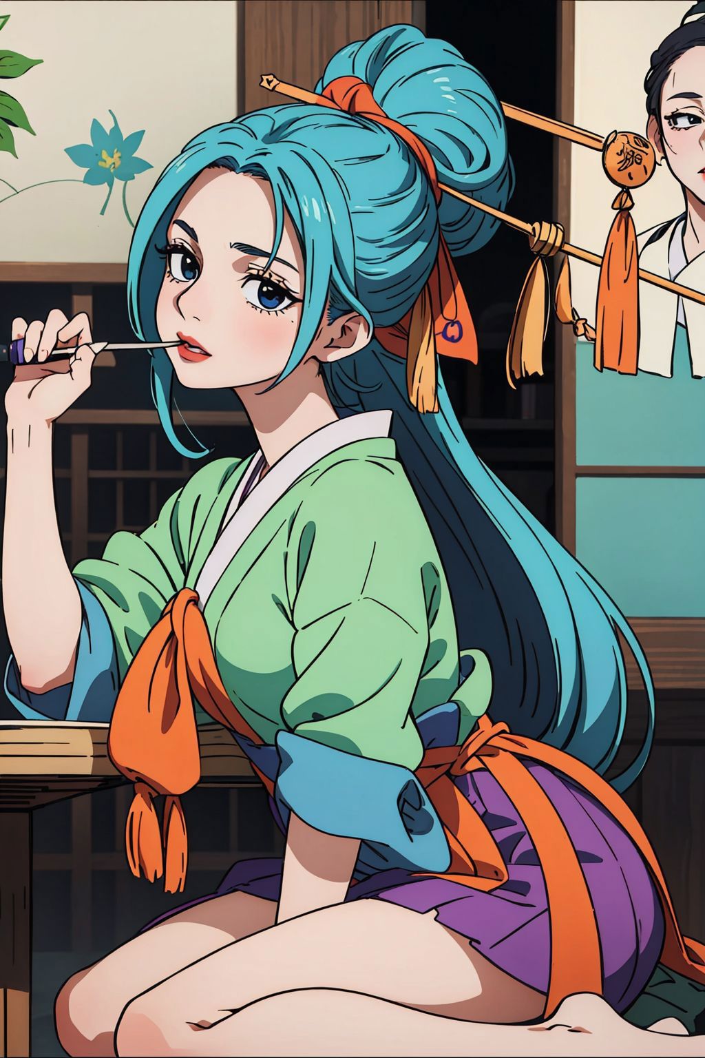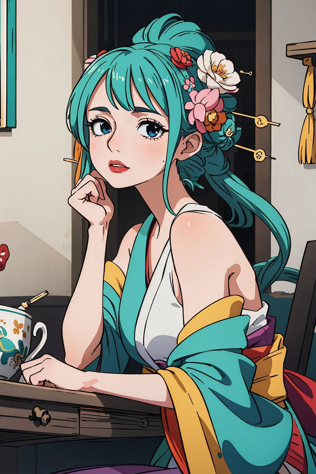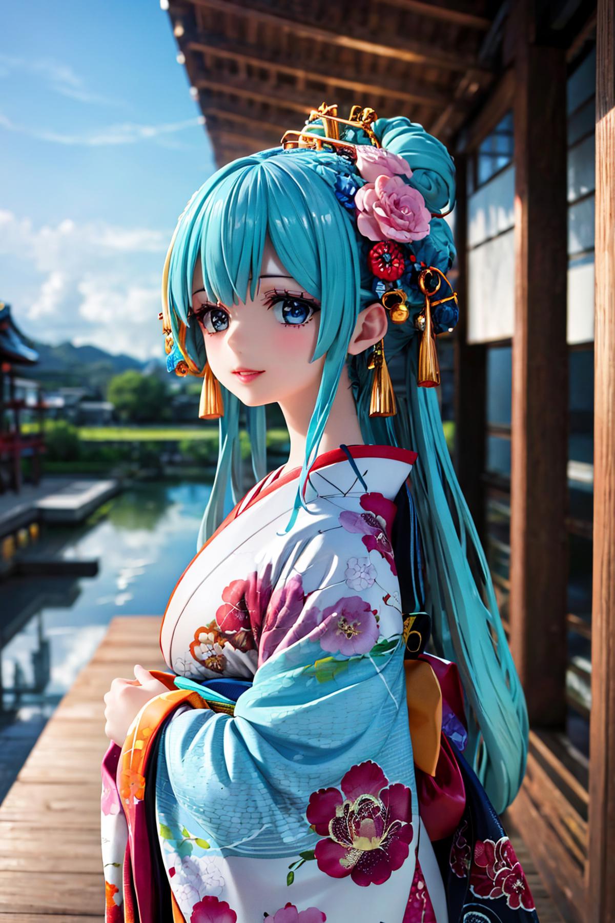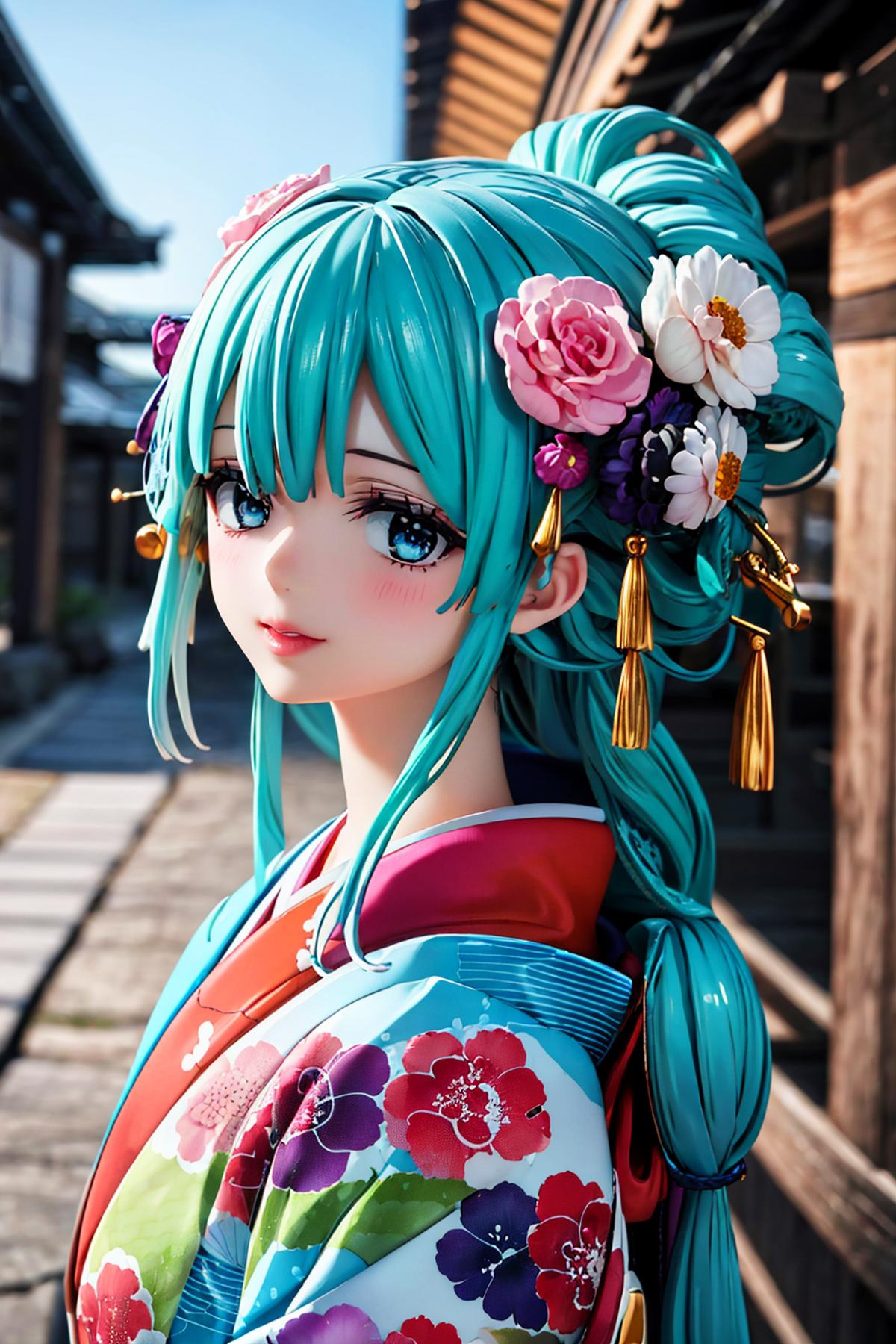 📌Prompt:Kozuki Hiyori, aqua hair, aqua eyes, long hair, hair ornament, flower ornament, hair flower, bangs, hair stick, hair rings