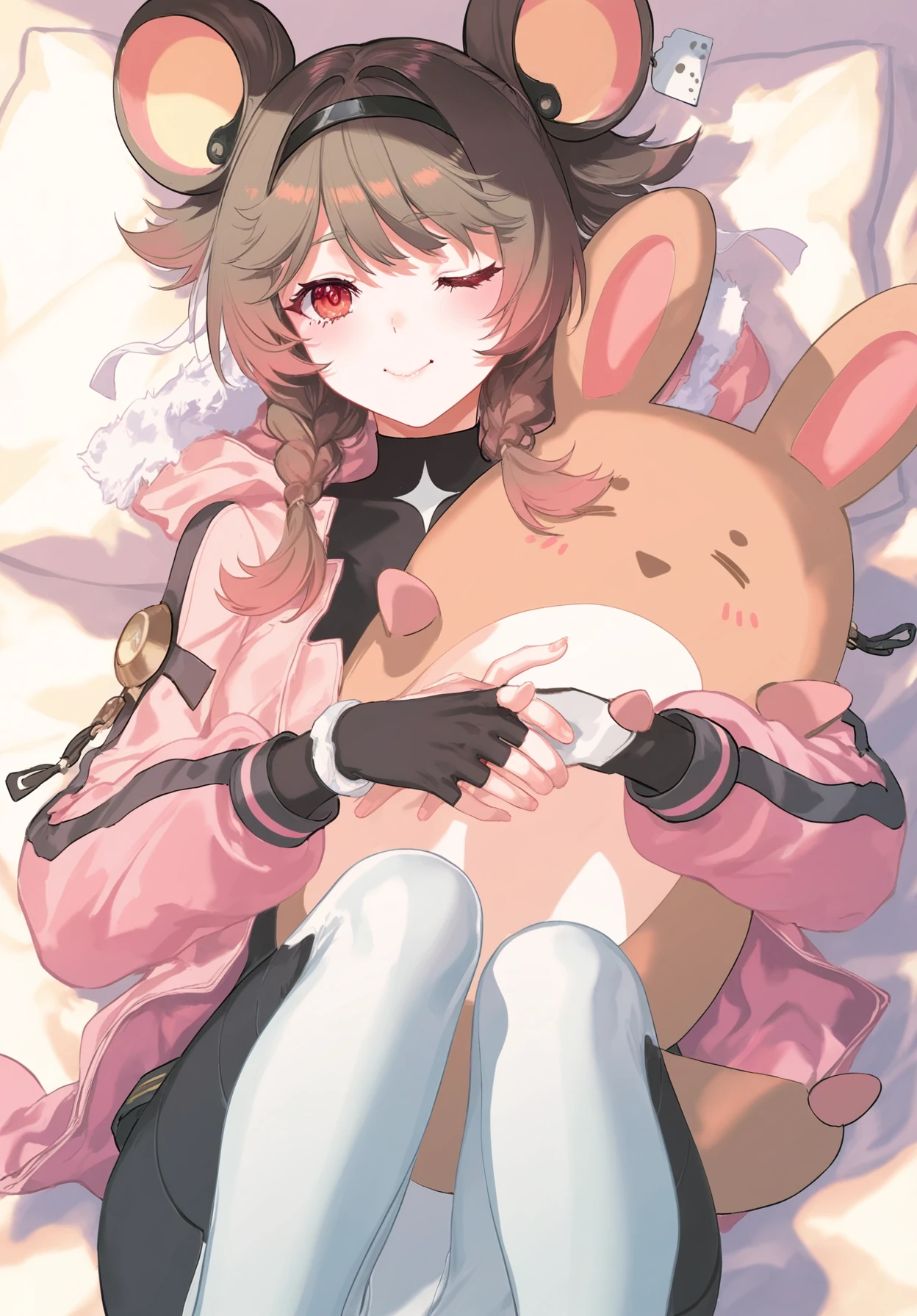 lumi_(wuthering_waves),fingerless gloves,fur trimmed jacket,mouse ears,brown hair,white bodysuit