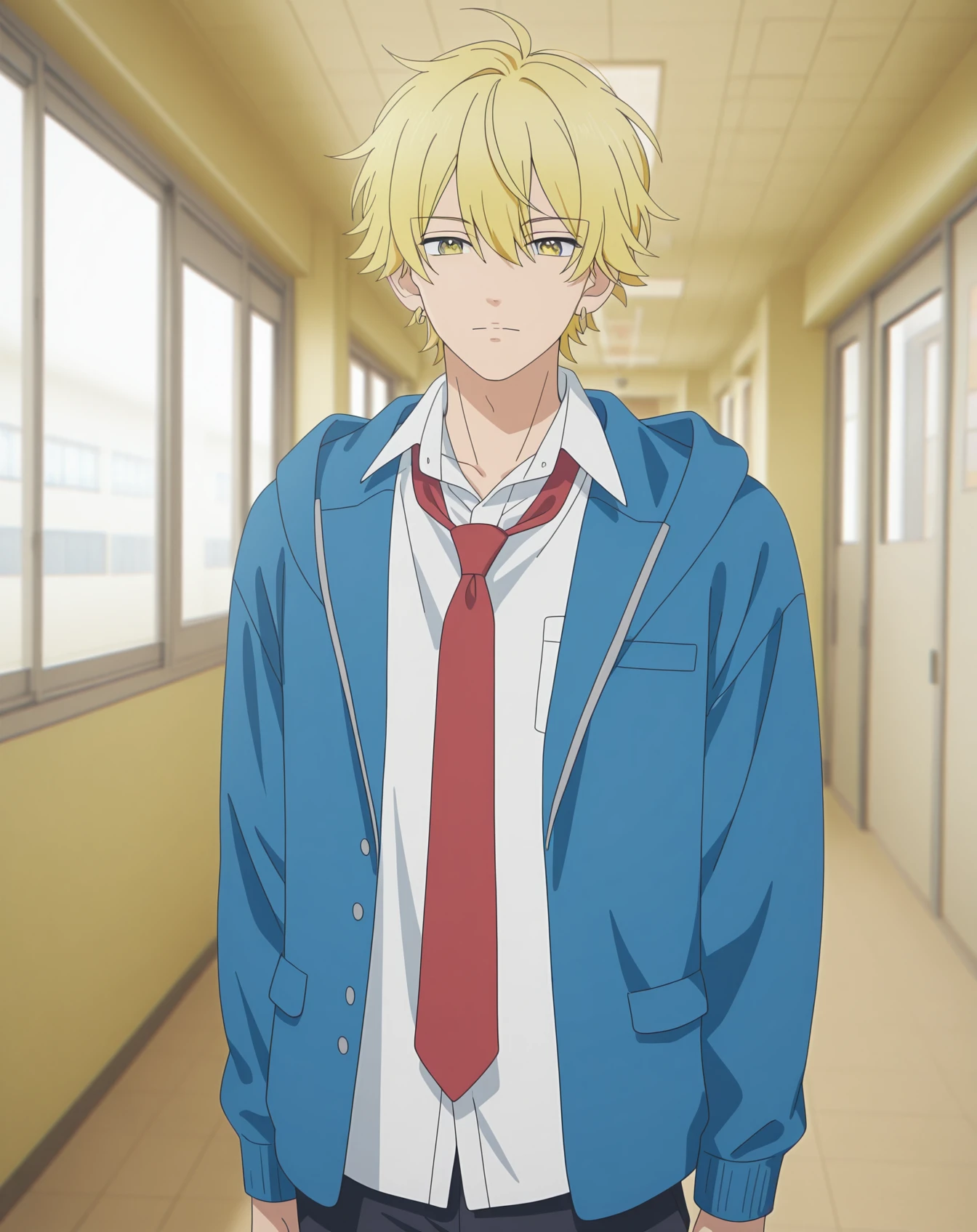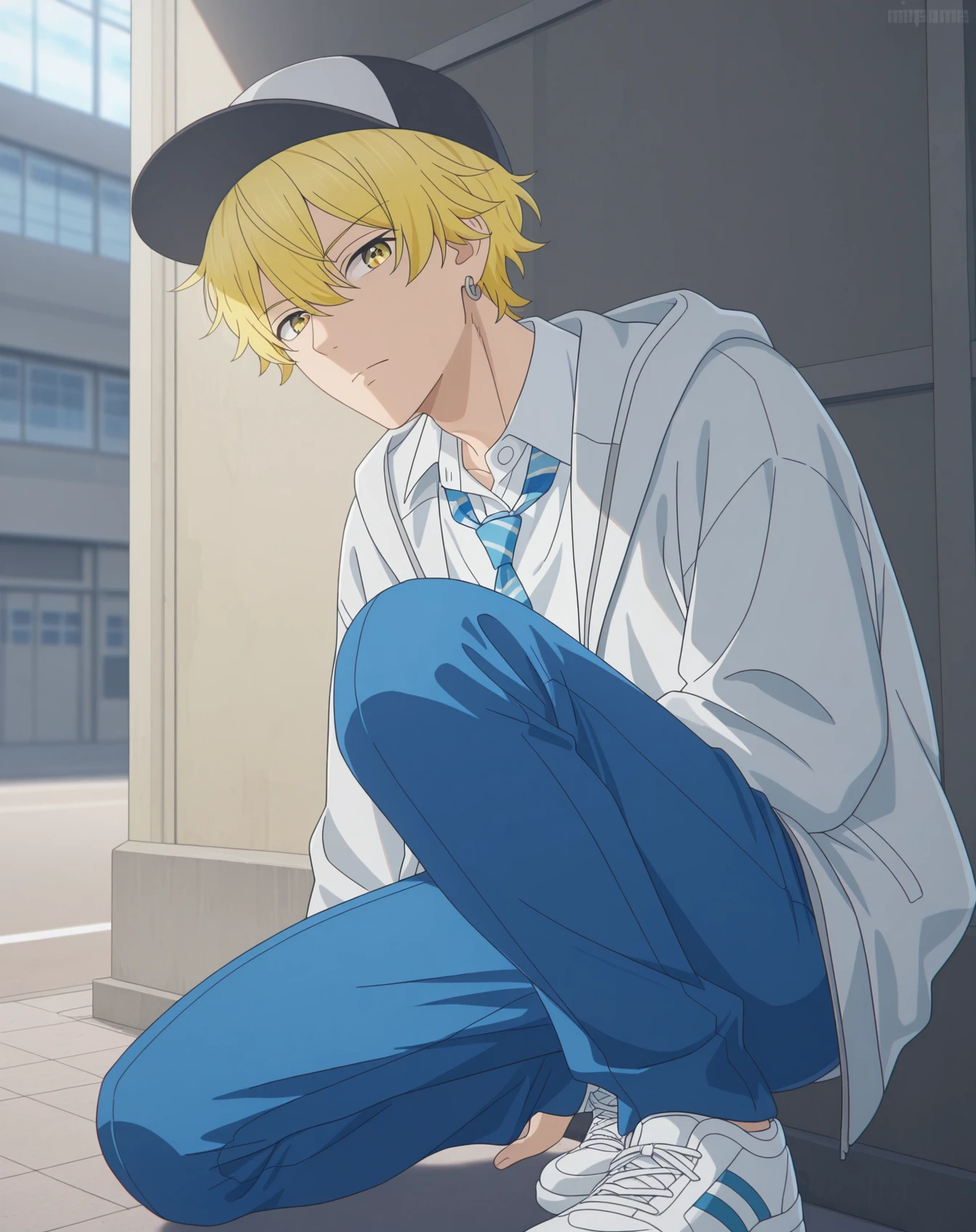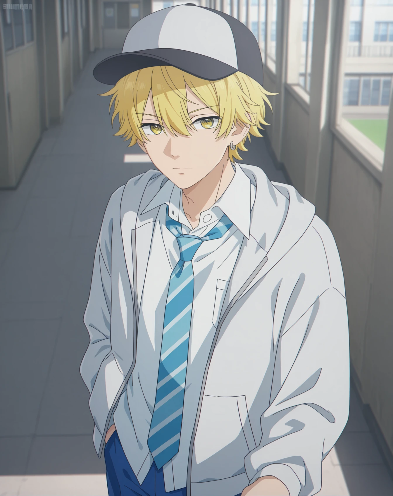 school uniform, baseball cap, white jacket, white shirt, blue necktie, striped necktie, blue pants, sneakers, white footwear,