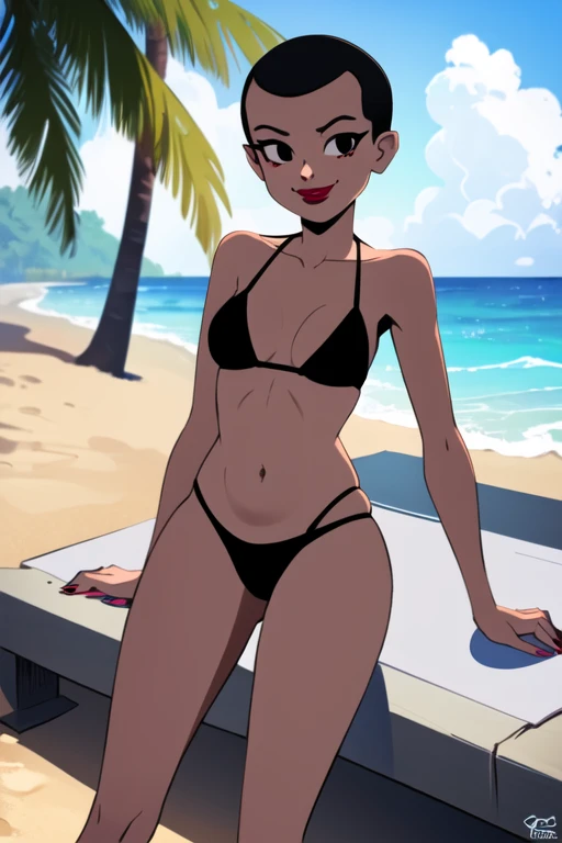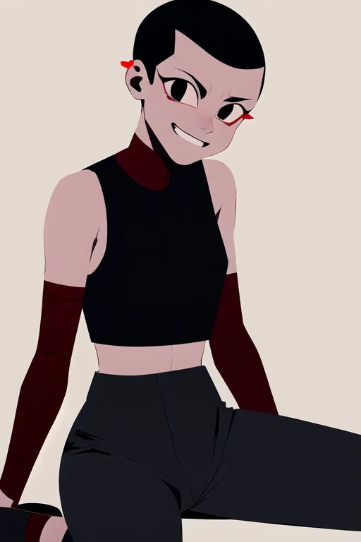 1girl, solo, black hair, short hair, black eyes, makeup, evil smile, small breastWould you like to have a model of a character, object, or concept? Contact me; I can assist you