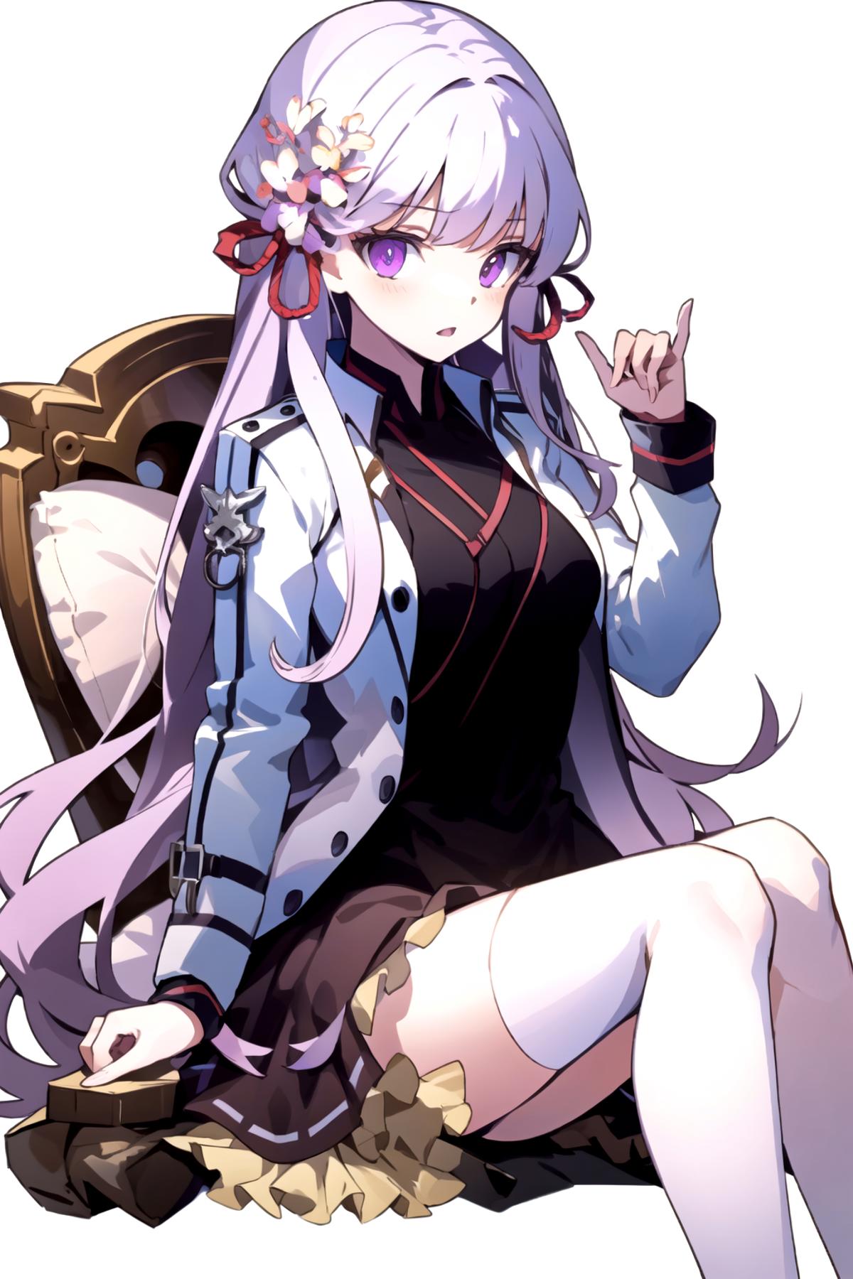 Can use followed prompt to support generate : hair_ornament, hair_ribbon,white hair flower, long purple hair, purple_eyes