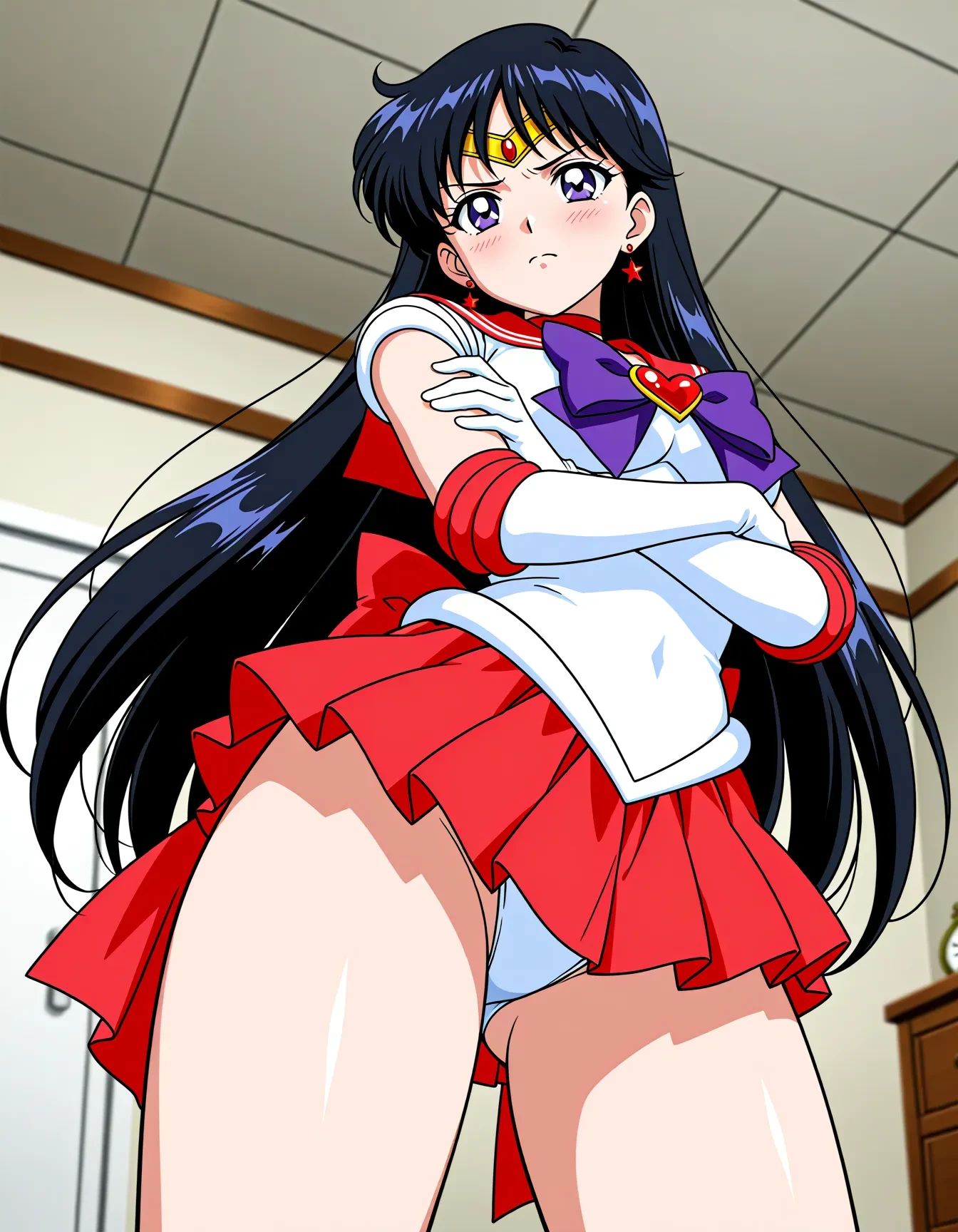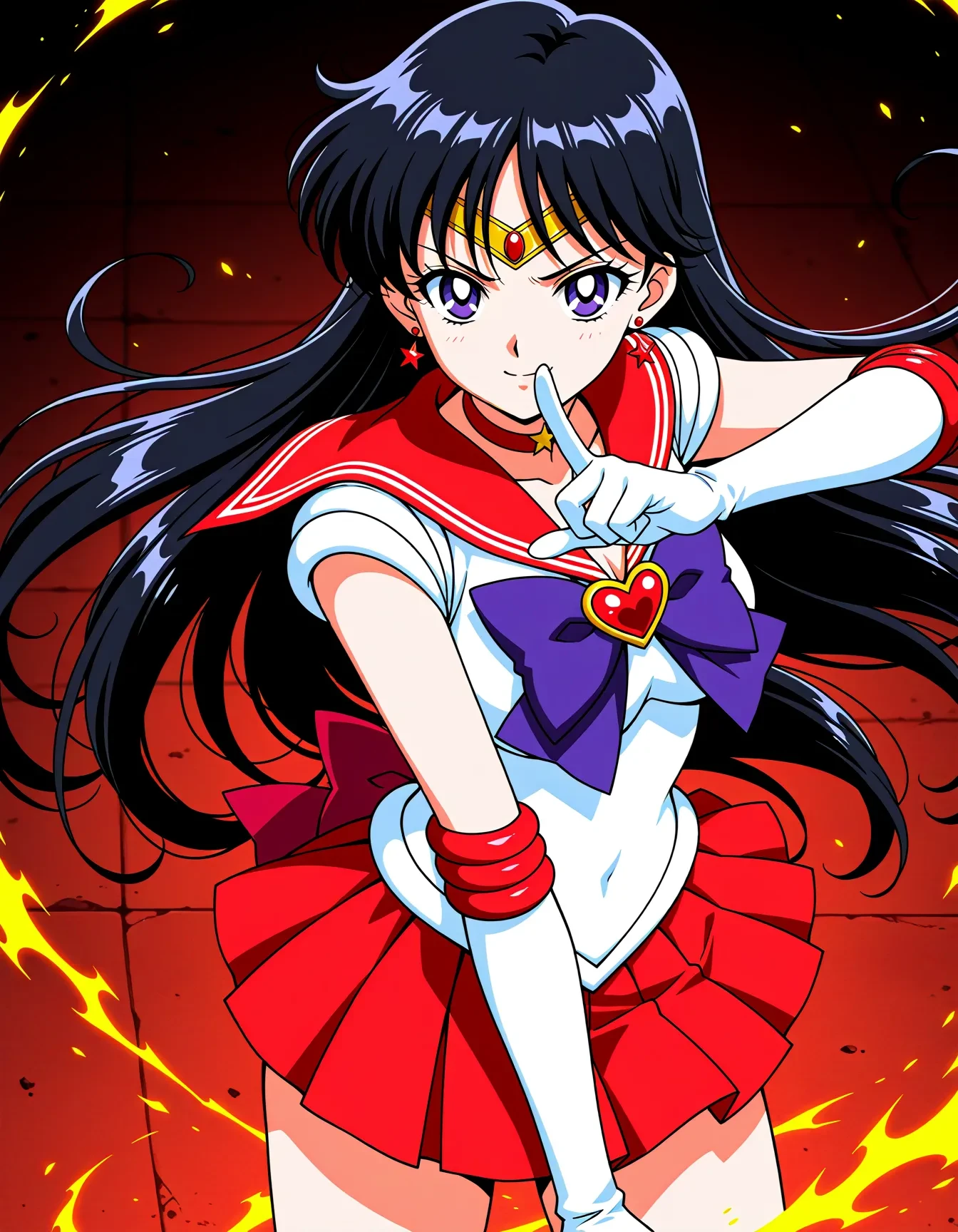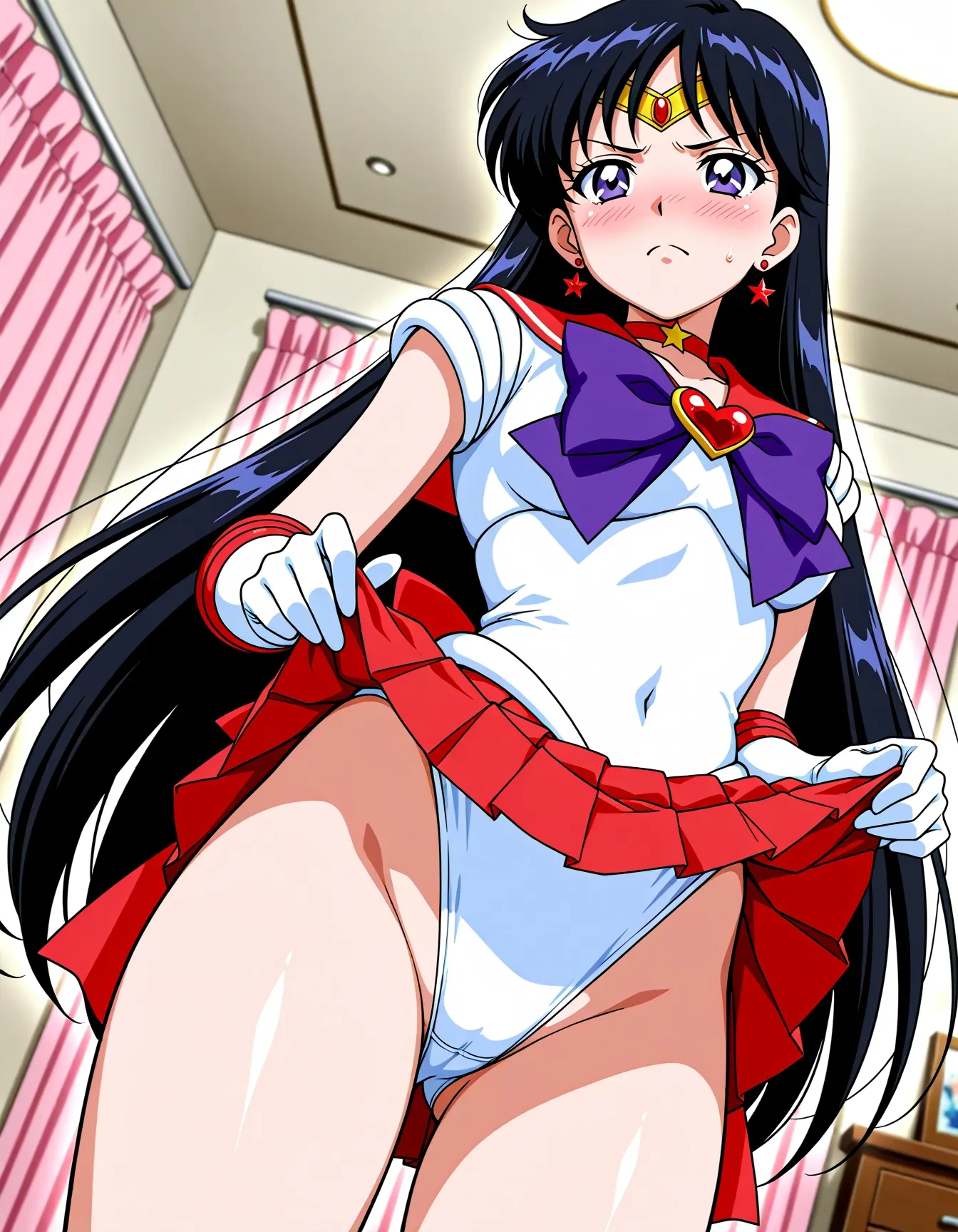 triggerWord: hino rei,solo,black hair,diadem,long hair,purple eyes,parted bangs,gloves,magical girl,microskirt,pleated skirt,red skirt,skirt,leotard,sailor senshi uniform,white gloves,bow,purple bow,sailor collar,red sailor collar,