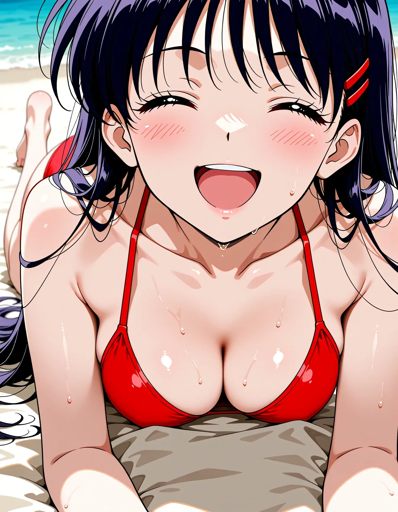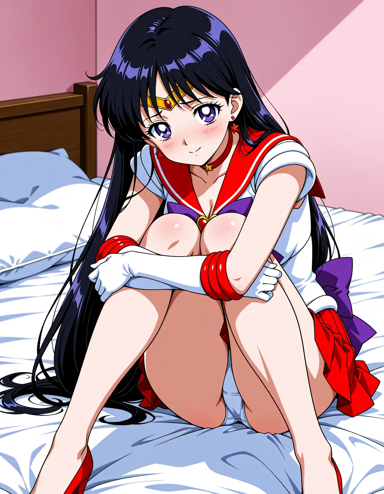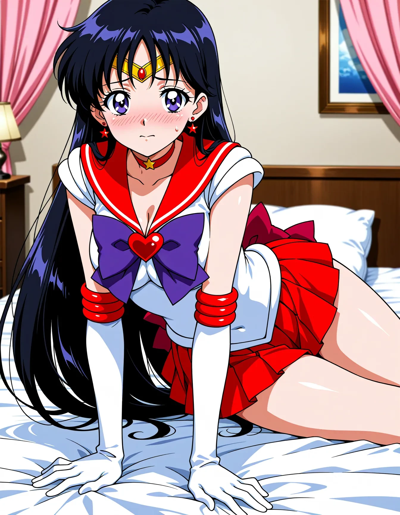 triggerWord: hino rei,solo,black hair,diadem,long hair,purple eyes,parted bangs,gloves,magical girl,microskirt,pleated skirt,red skirt,skirt,leotard,sailor senshi uniform,white gloves,bow,purple bow,sailor collar,red sailor collar,