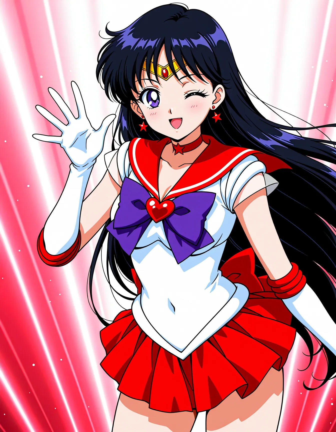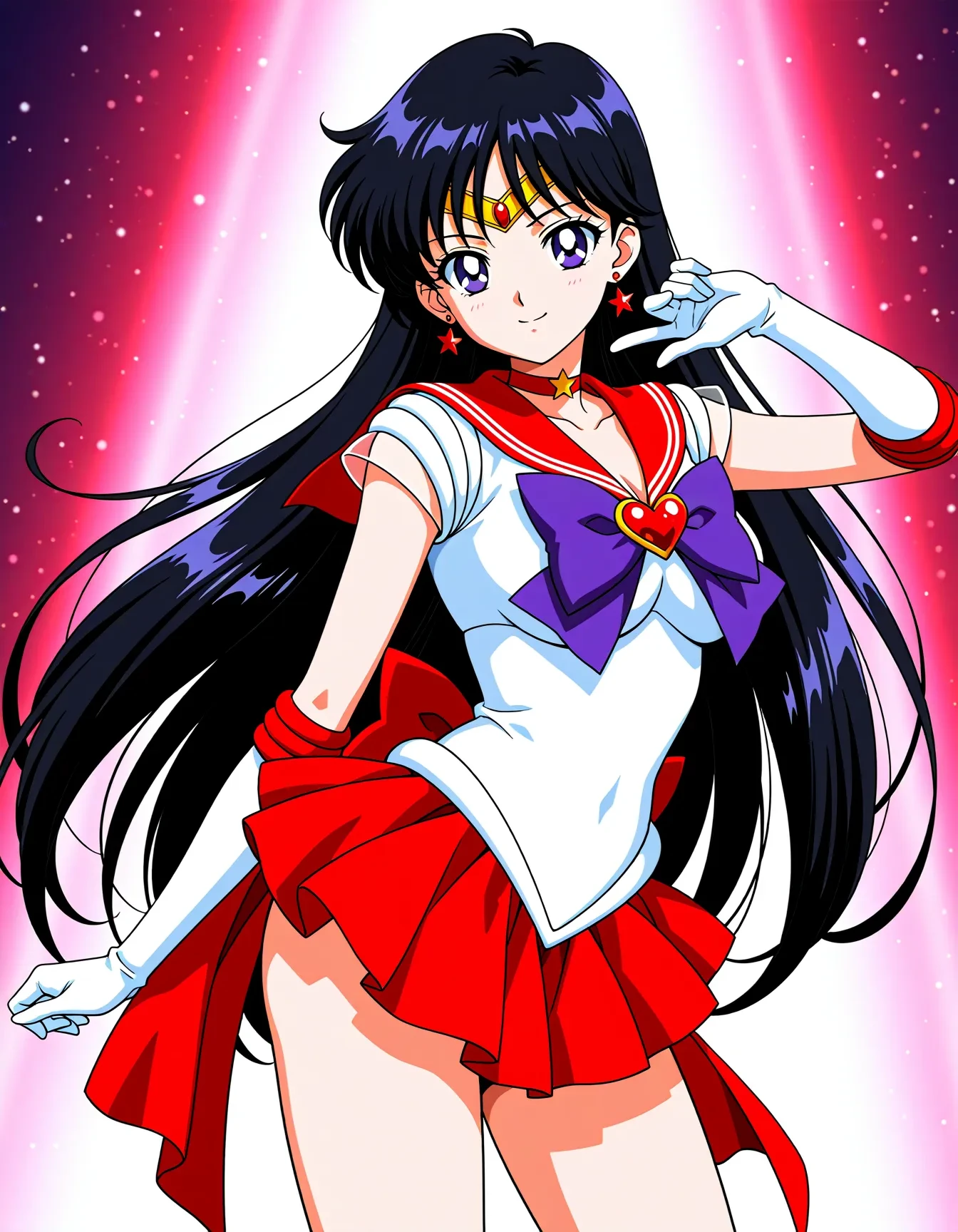 sailor mars,super sailor mars,solo,black hair,diadem,long hair,purple eyes,sailor senshi uniform,sailor collar,magical girl,red sailor collar,heart brooch,microskirt,pleated skirt,red skirt,skirt,leotard,purple bow,red backbow,red back long bow,bow,white gloves,gloves,