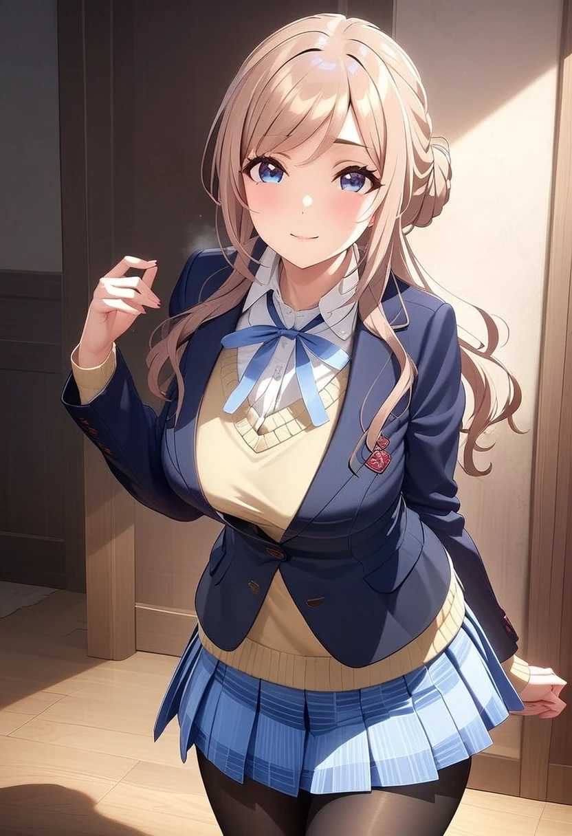 Trigger words: rinami_a_xl, light brown hair, single hair bun, swept bangs, sidelocks, long hair, blue eyes, school uniform, blue jacket, blazer, buttons, neck ribbon, blue ribbon, yellow sweater vest, collared shirt, white shirt, long sleeves, pleated skirt, blue skirt, plaid skirt, black pantyhose,