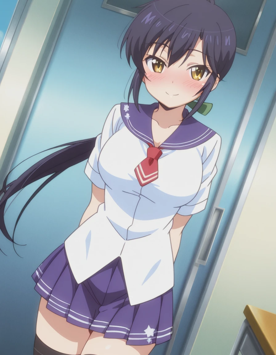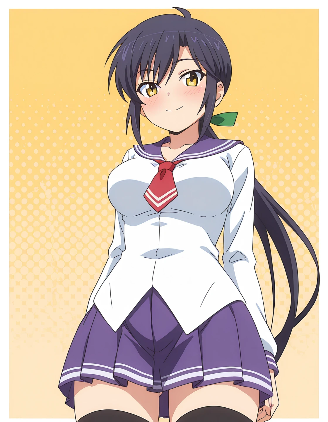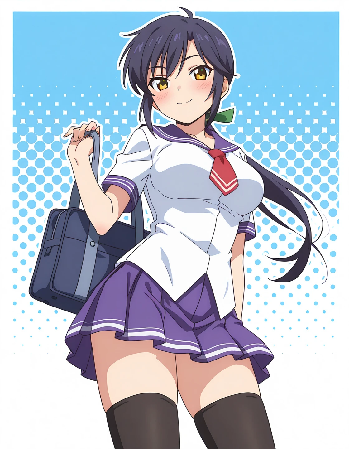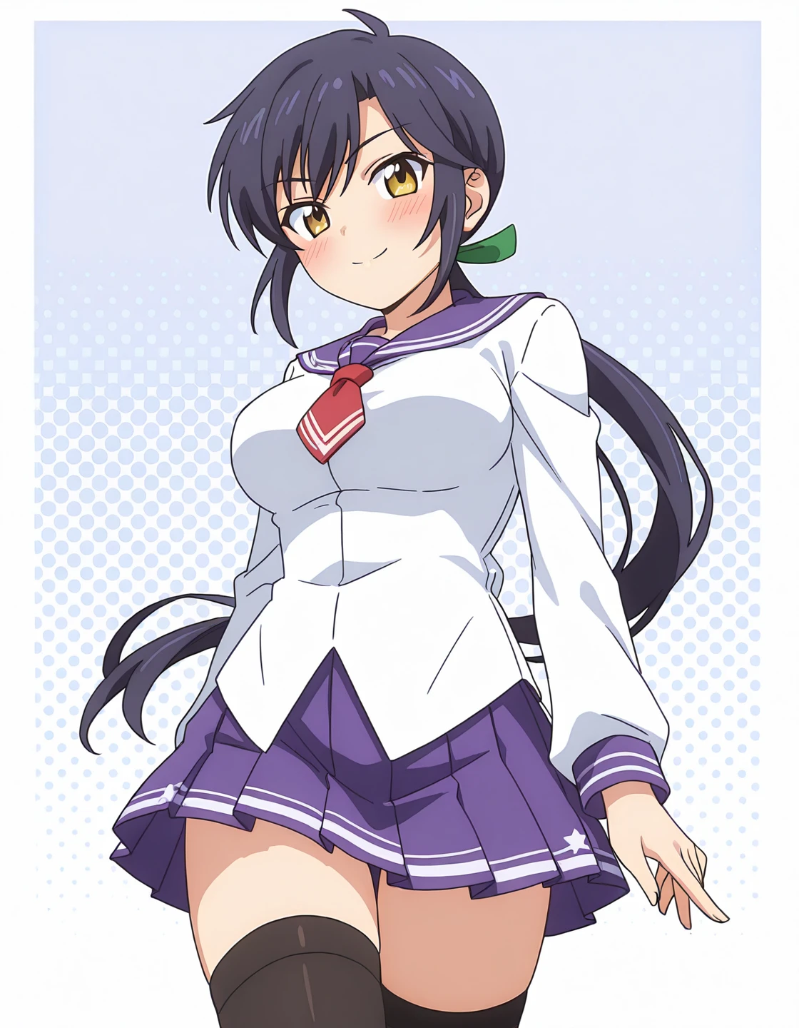 She has short, dark navy hair tied in a long side ponytail with a green ribbon, and striking amber-gold eyes that convey both determination and warmth. Her style ranges from her classic sailor school uniform to casual outfits, yukata, and cute loungewear, each highlighting a different facet of her personality.