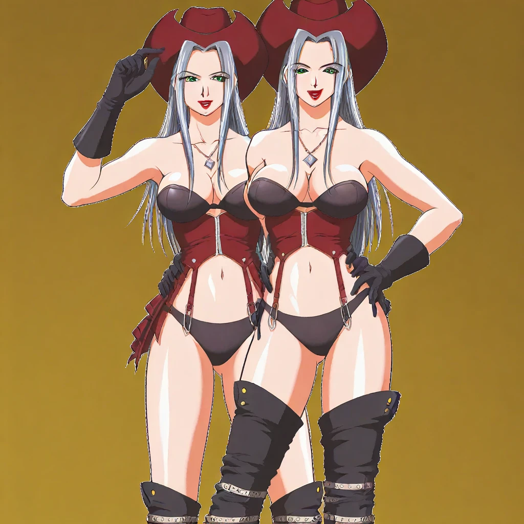 rodei-oufit, cowboy hat, necklace, strapless bra, red corset, black panties, black gloves, black thigh boots,