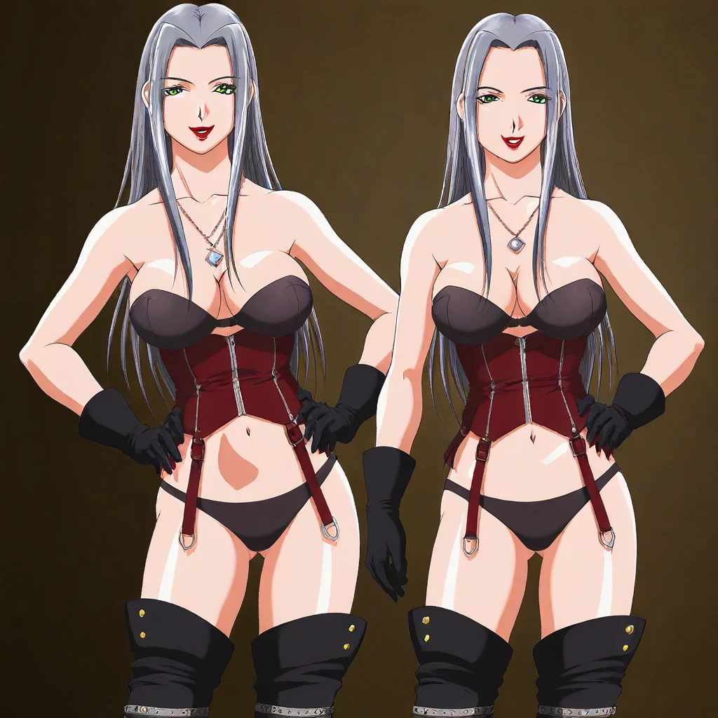 grey hair,long hair, parted hair, sidelocks, green eyes, large breasts, lipstick,