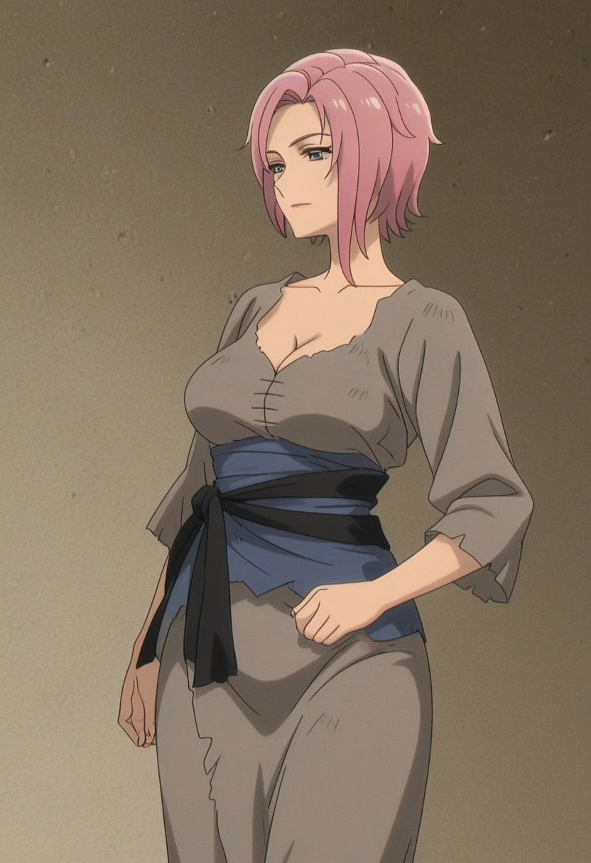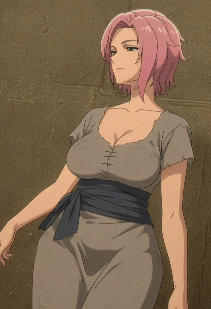 {mithilda}, anime style, late 1990s to early 2000s, mithilda, 1woman, solo, (mithilda detailed figure: elegant mature woman, plush feminine, modest torso, petite frame, curvy slender build, graceful figure, Soft body, realistic feminine woman figure, mature sagging , short hair, pink hair, (wide :1.2), feminine mature),,,