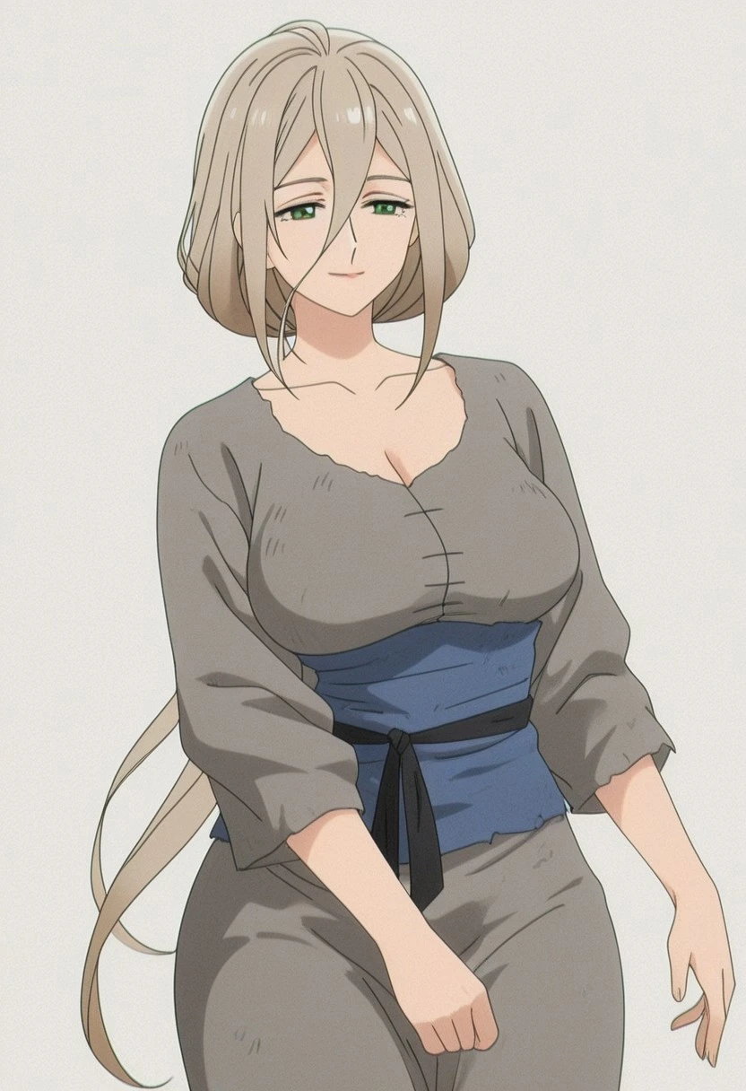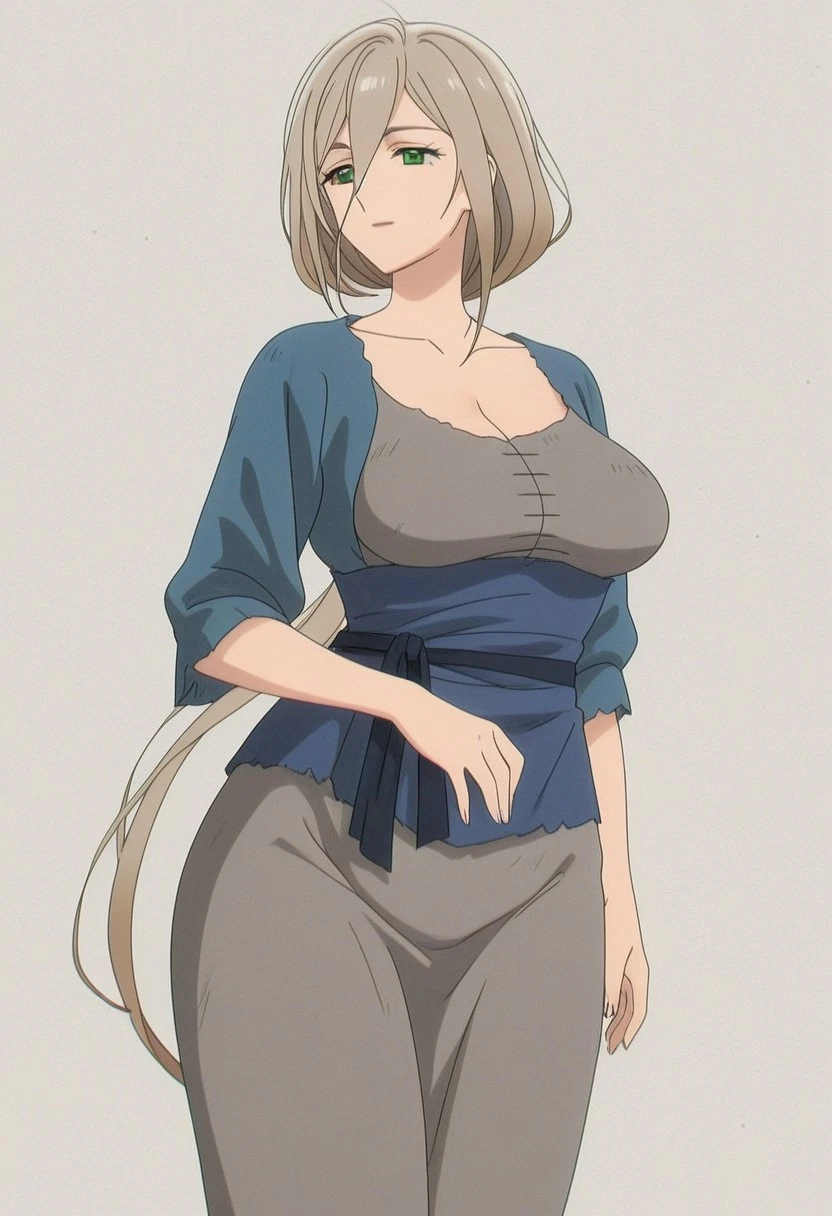 {theresia}, anime style, late 1990s to early 2000s, theresia, 1woman, solo, (theresia detailed figure: elegant mature woman, plush feminine, modest torso, petite frame, curvy slender build, graceful figure, Soft body, realistic feminine woman figure, sagging , very long hair, golden-brown hair,low ponytail, green eyes, (wide :1.2), feminine mature),,