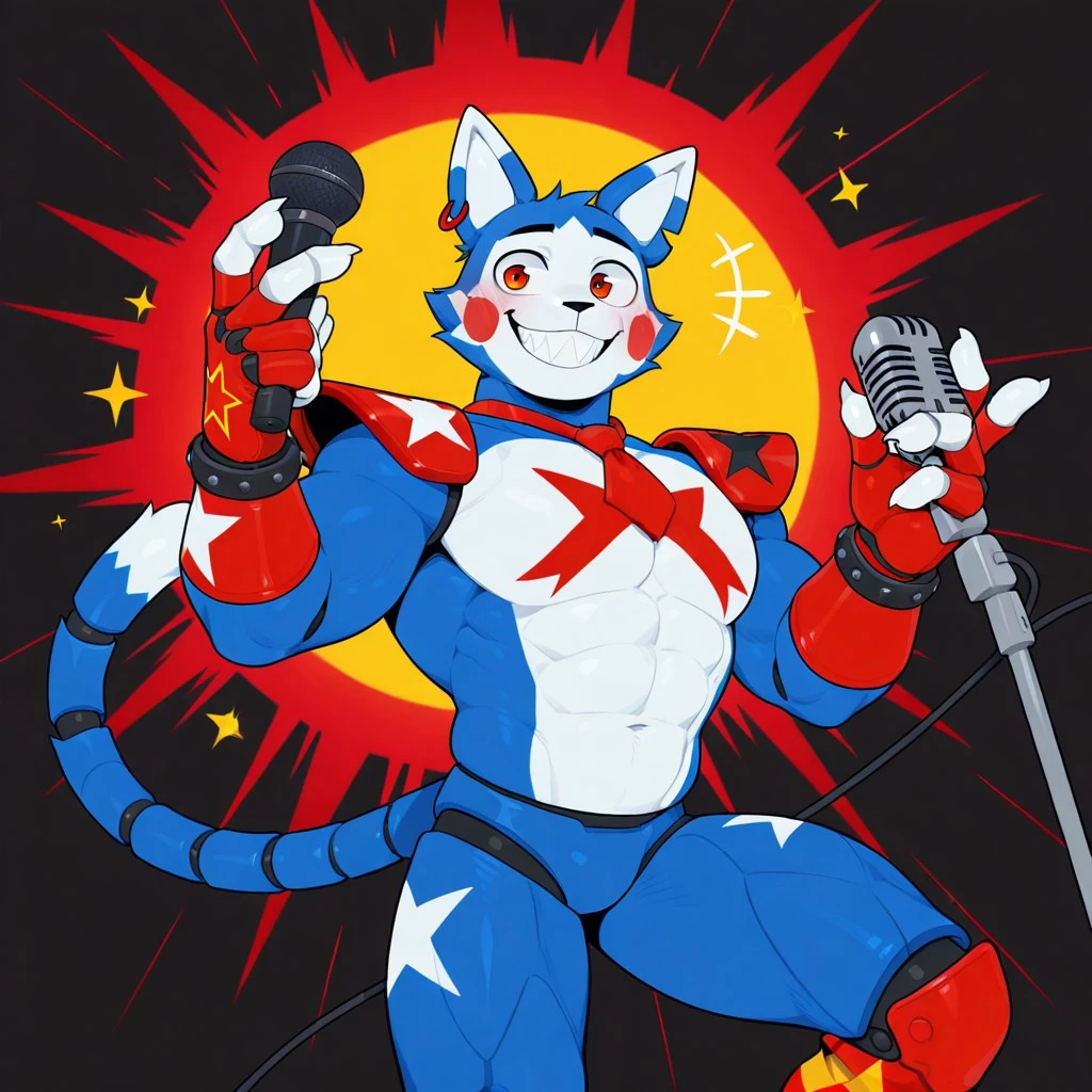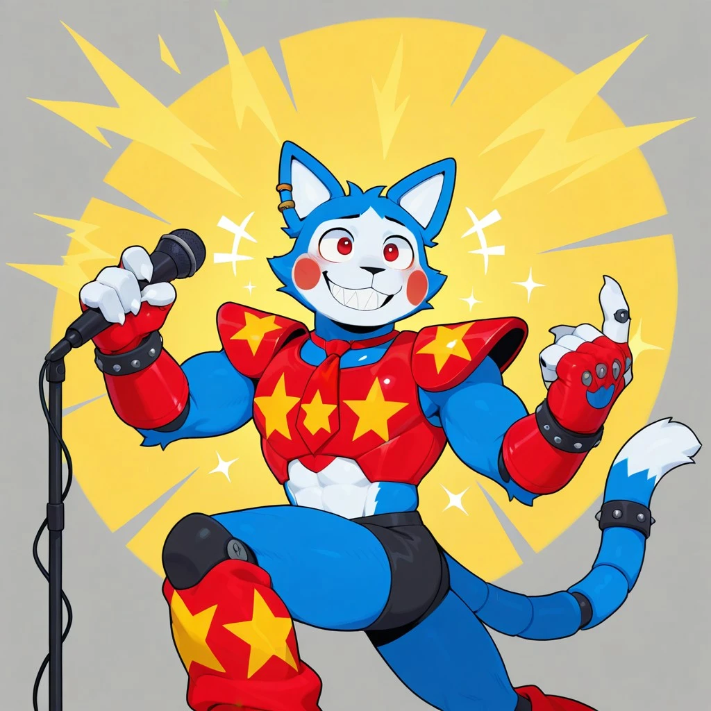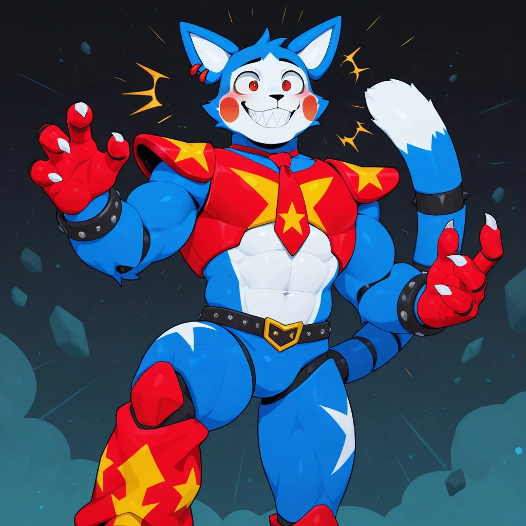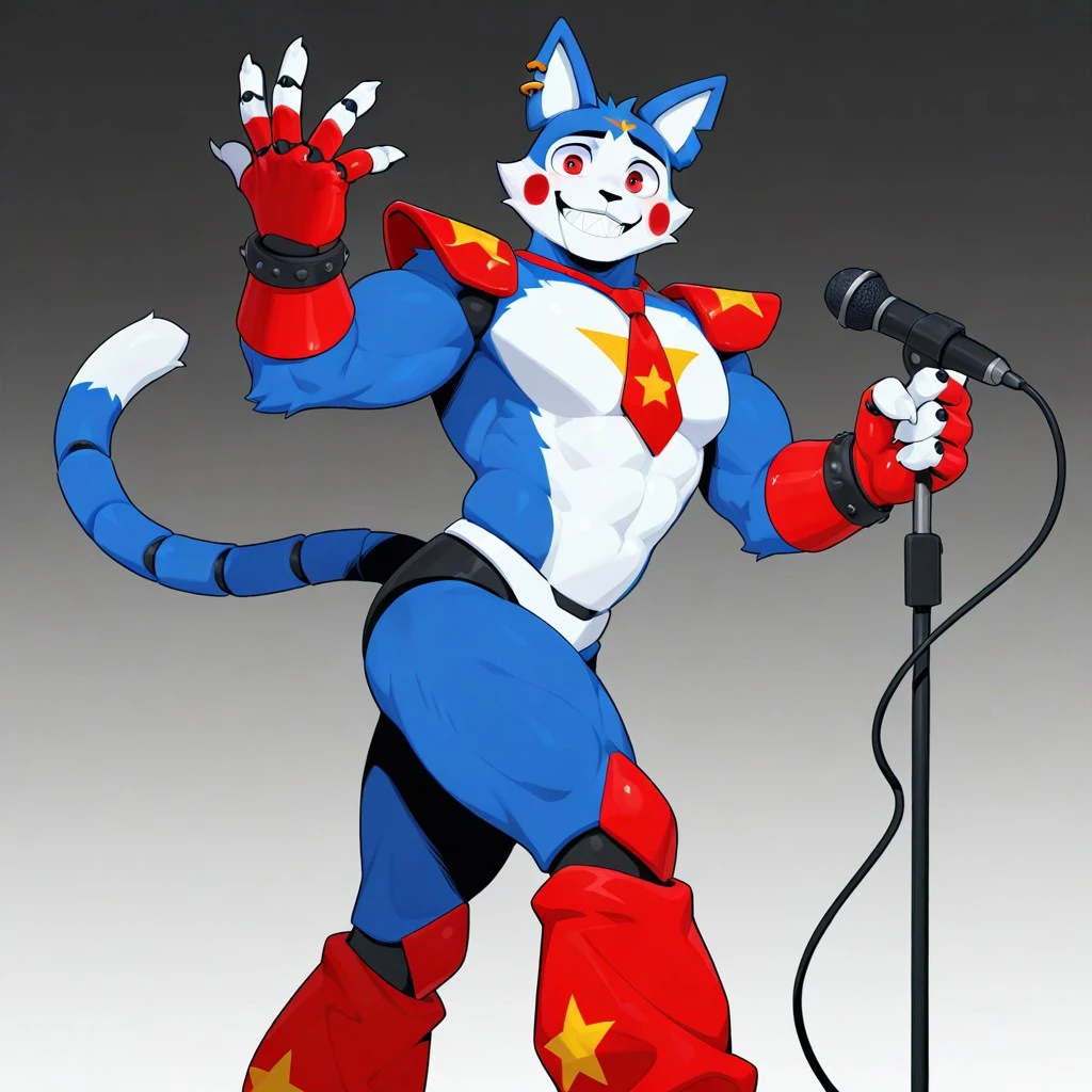 Solo,Male,Anthro cat,blue fur,white stomach,White mouth, White face,White cheeks,red eyes,Red Tie,Red Cheeks,Red shoulder pads, Red leg warmers,long tail,white tip tail,Bracelet,red percing ear,red biker gloves,White hands, glamrock_candy, muscular, black nose, White inner ears