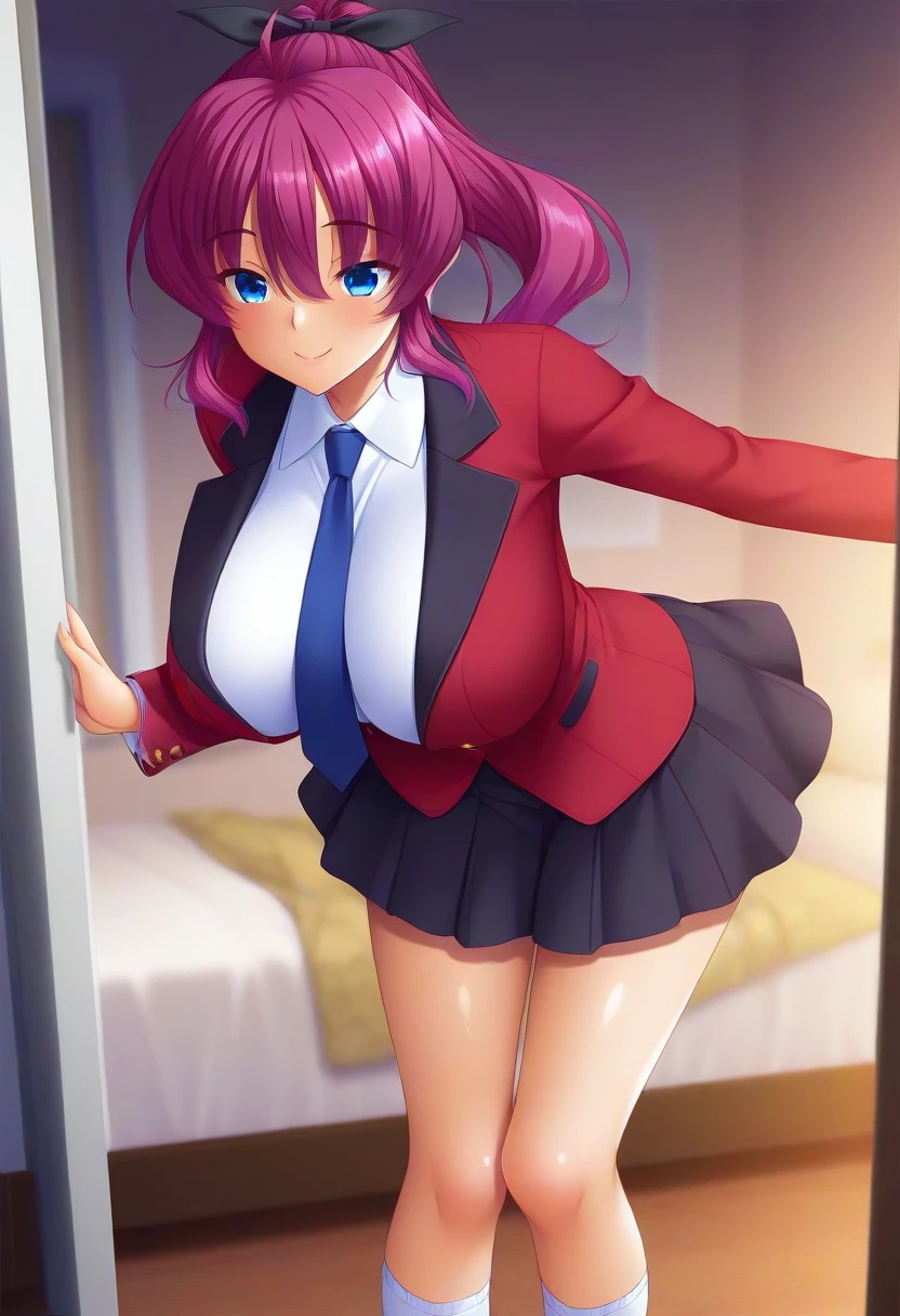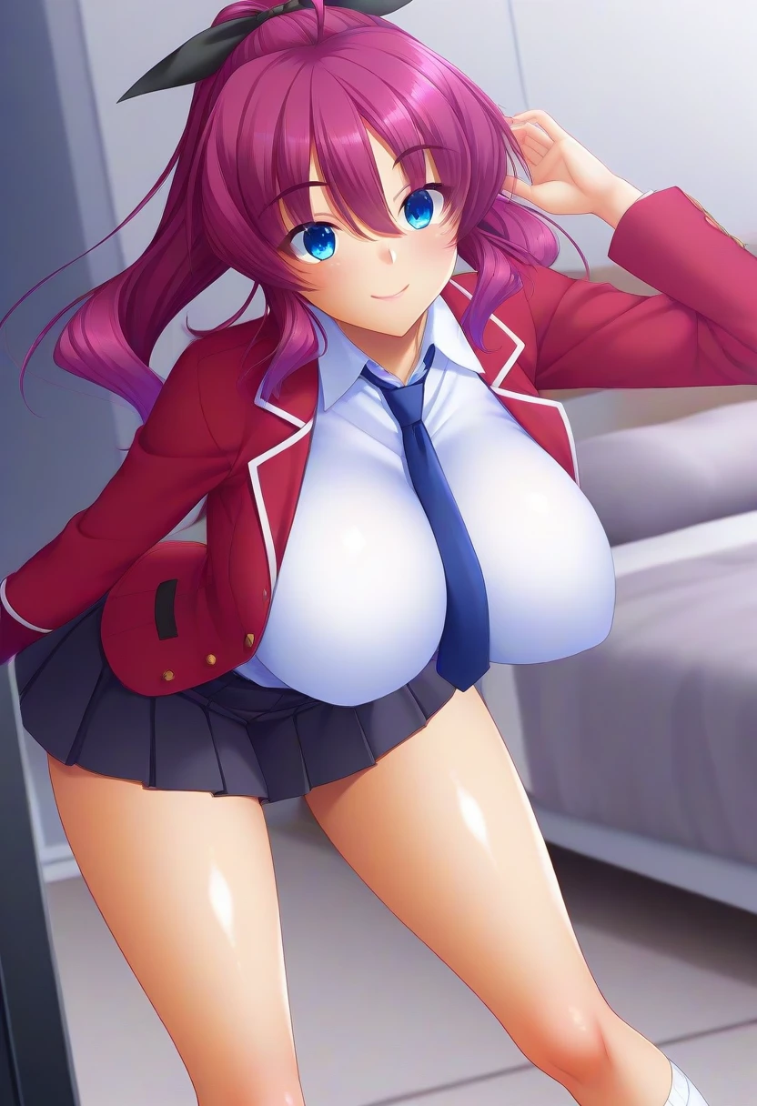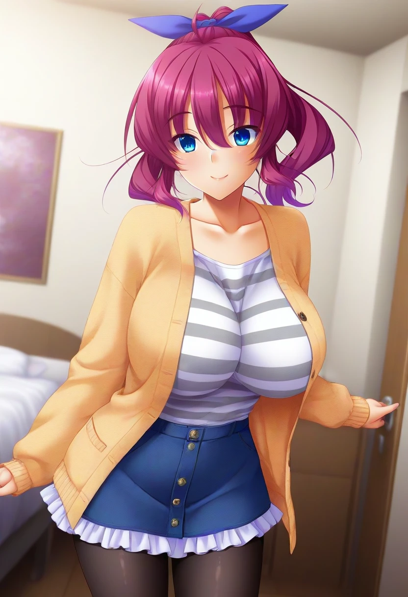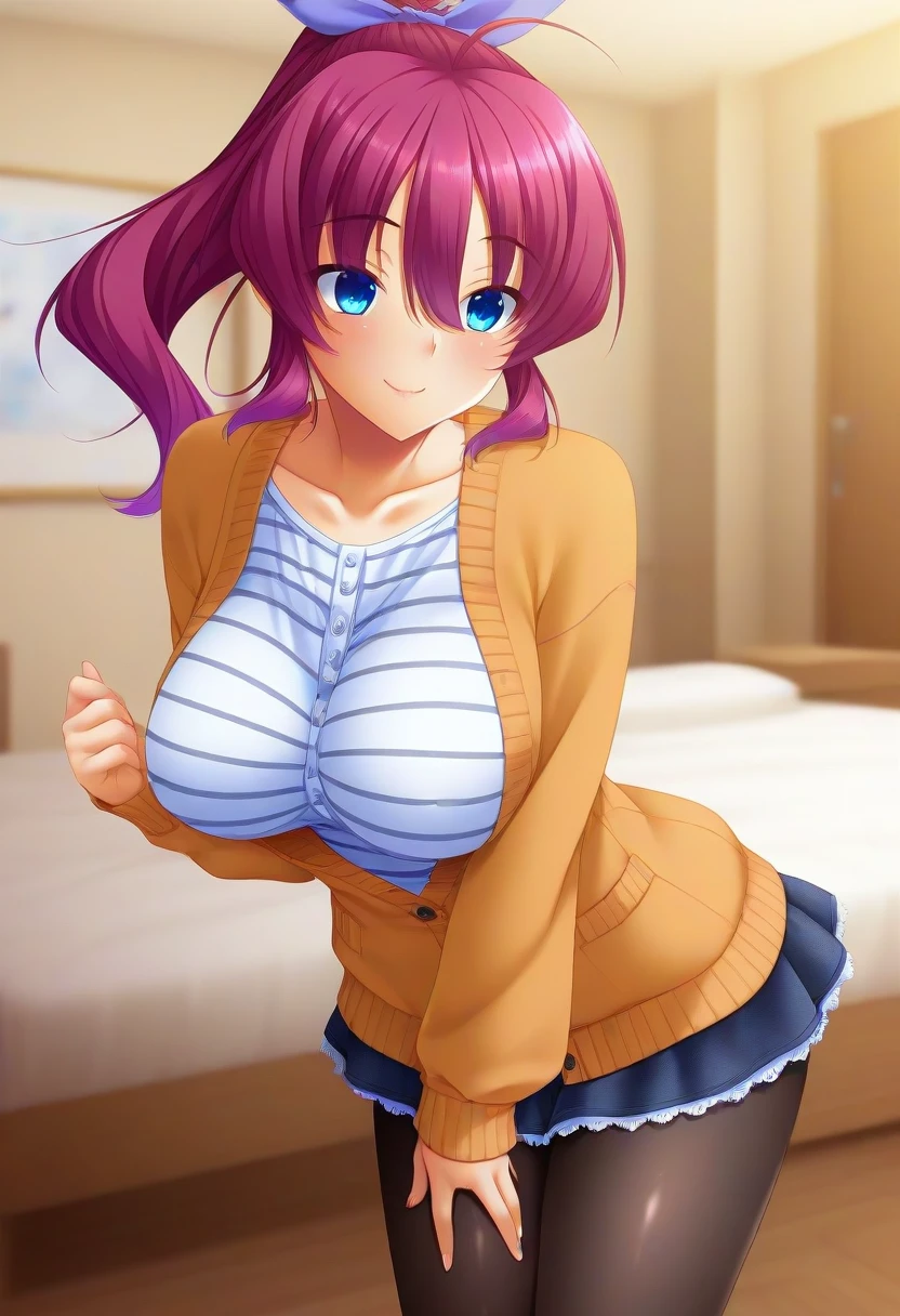 Fuuka Watase, blue eyes, violet hair, long hair, ponytail, hair ribbon, ahoge,