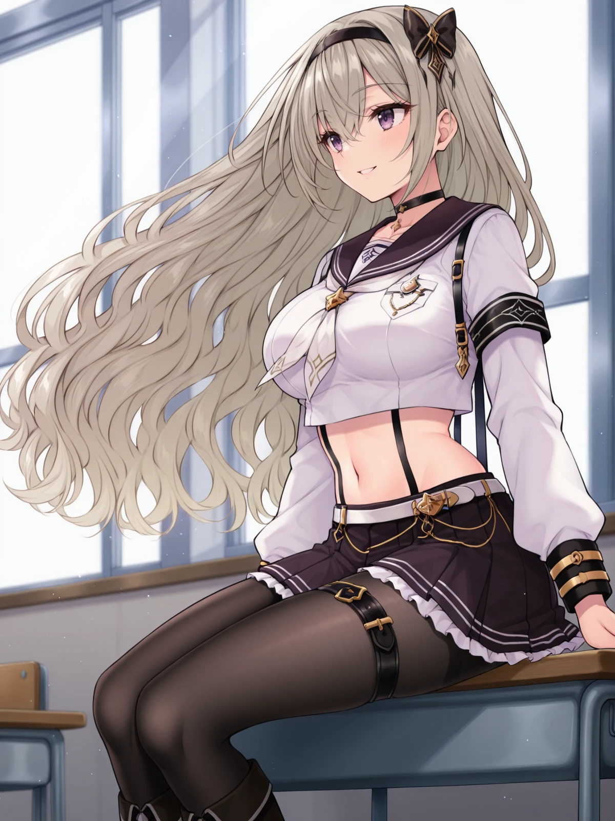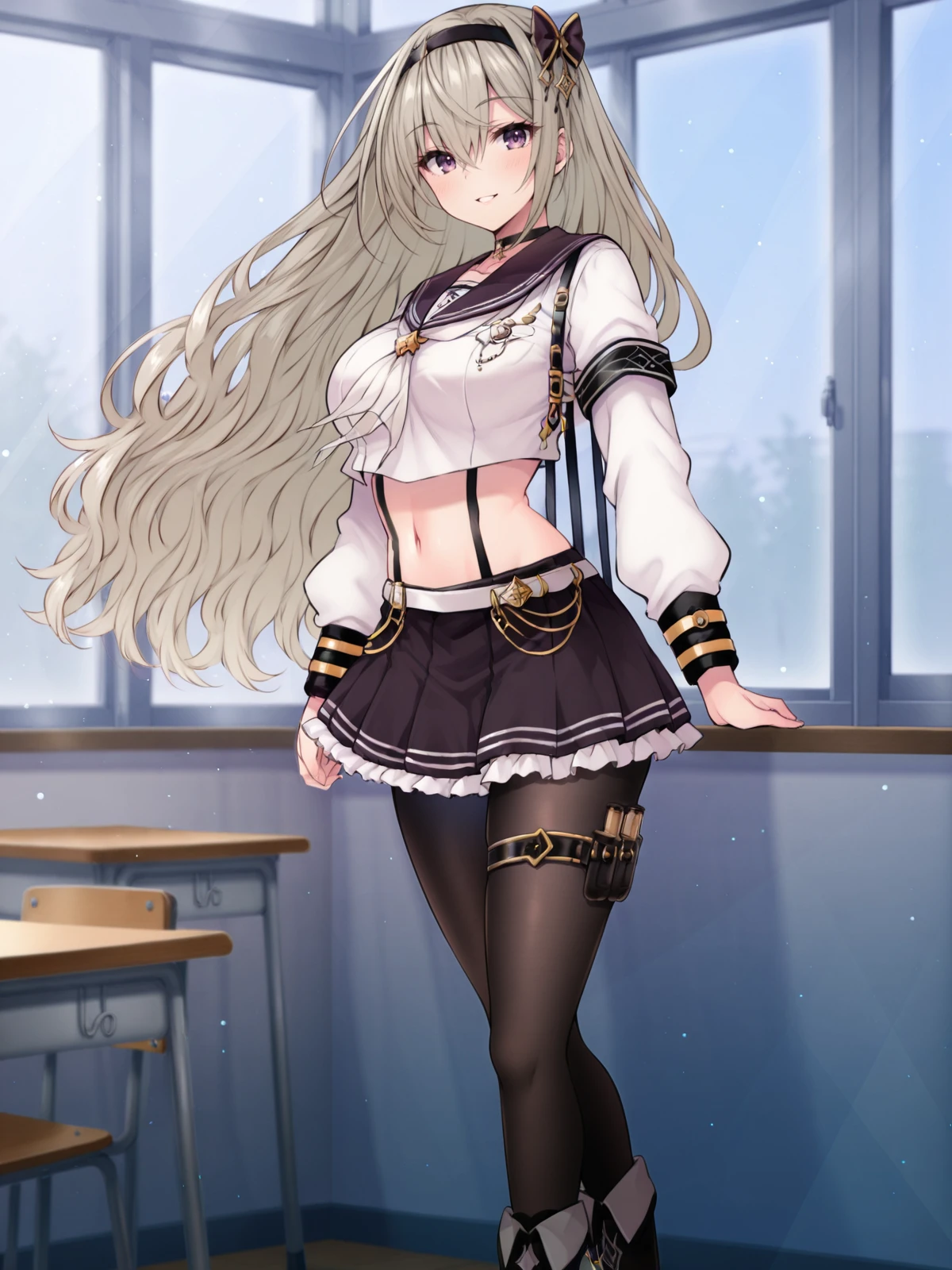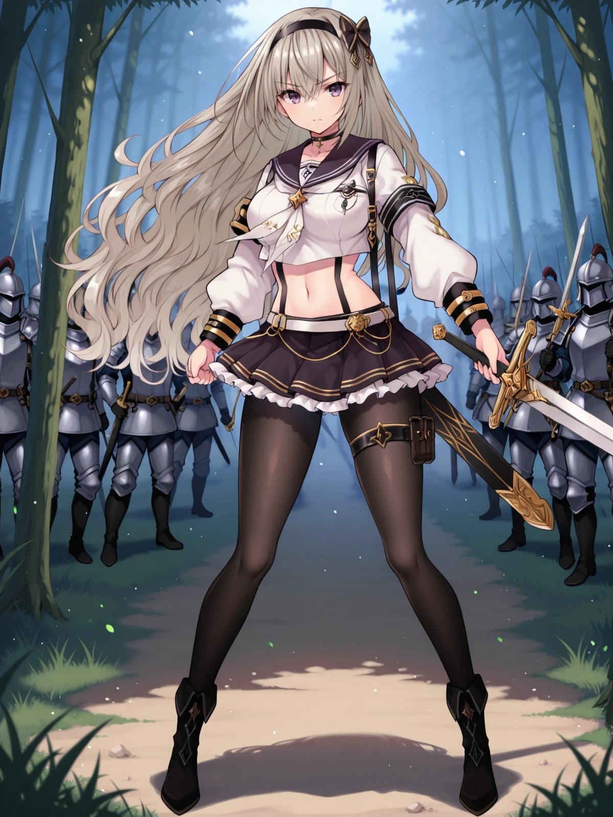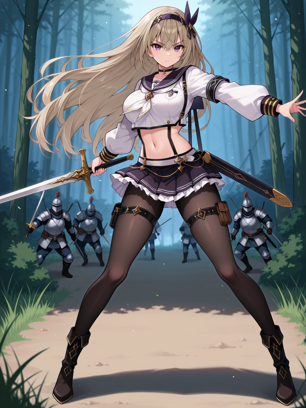 Ayane, 1girl, solo, long hair, large breasts, skirt, sword, suspenders, hairband, navel, full body, black pantyhose, purple eyes, choker, boots, thigh strap,