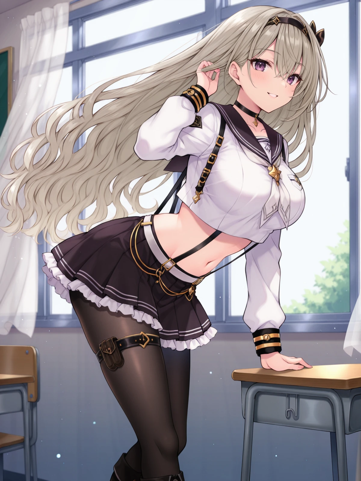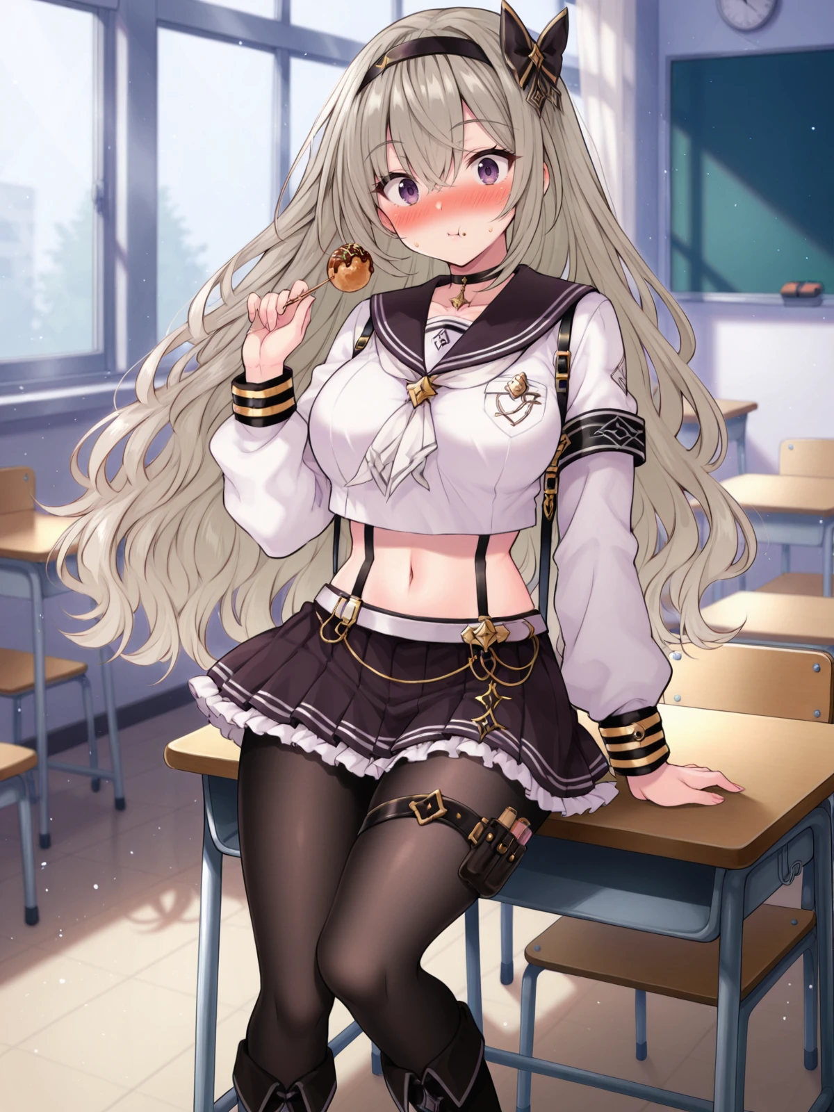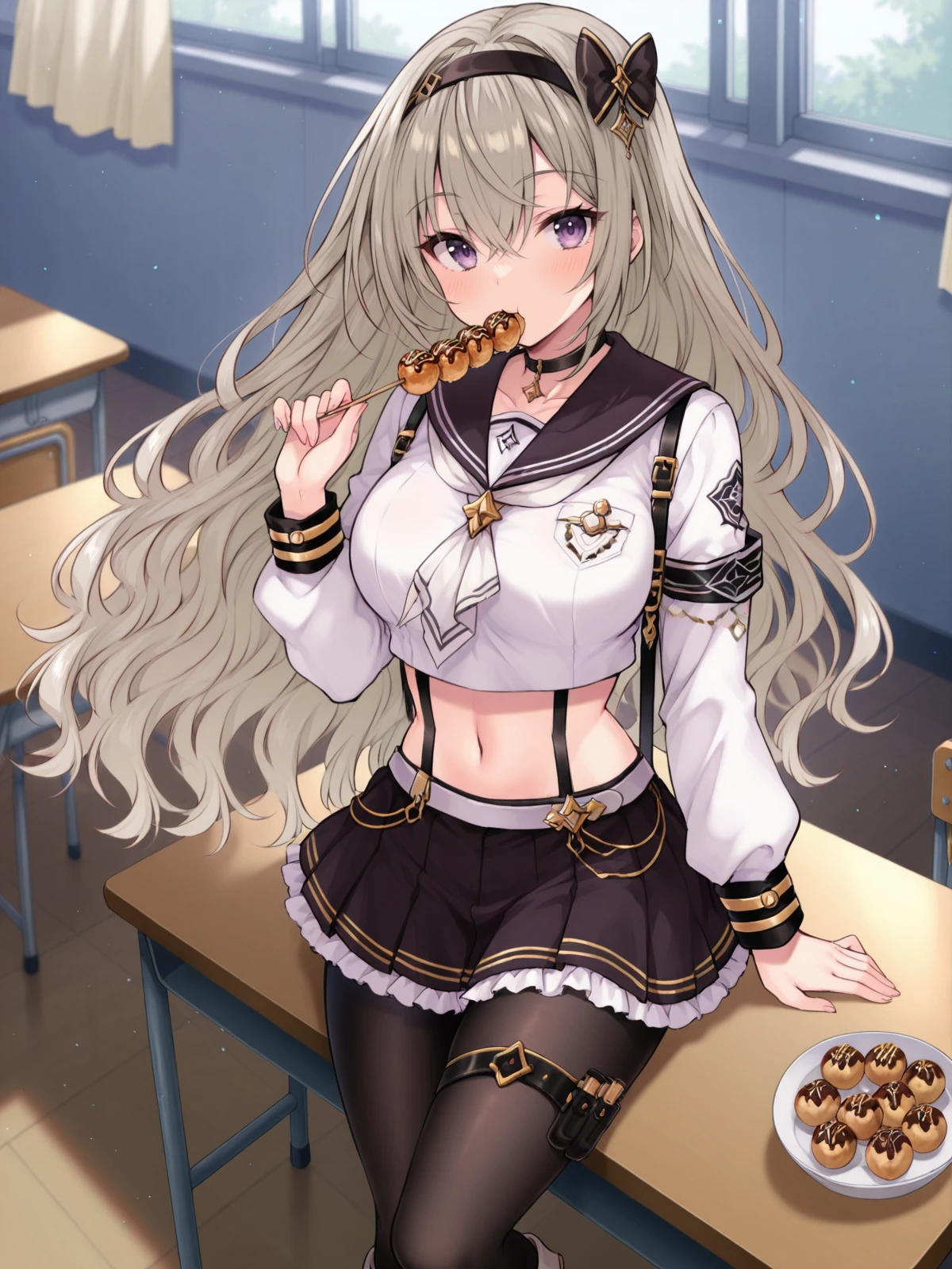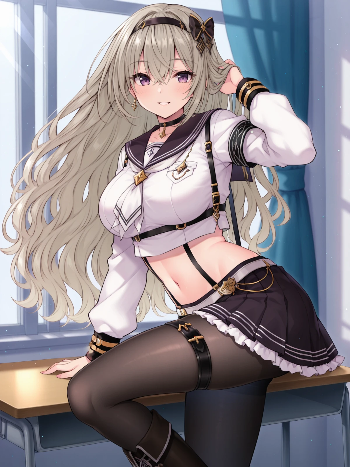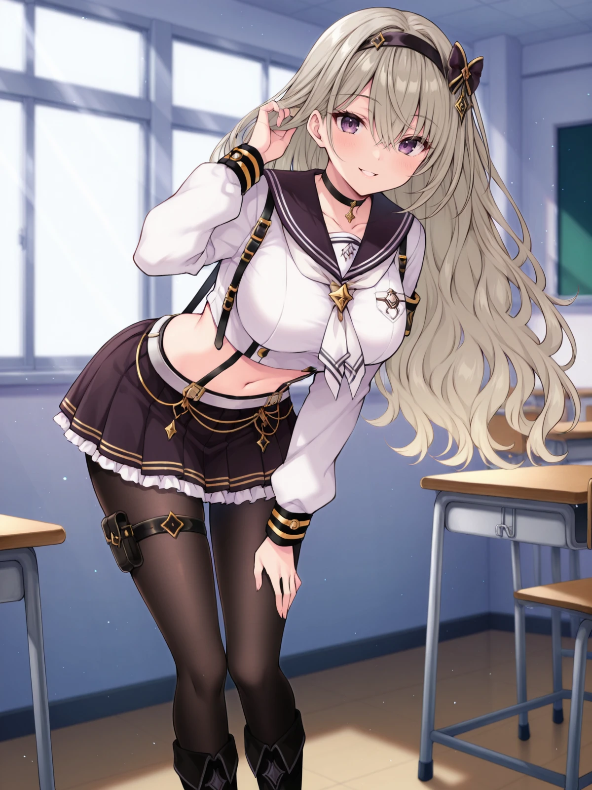 Ayane, 1girl, solo, long hair, large breasts, skirt, sword, suspenders, hairband, navel, full body, black pantyhose, purple eyes, choker, boots, thigh strap,