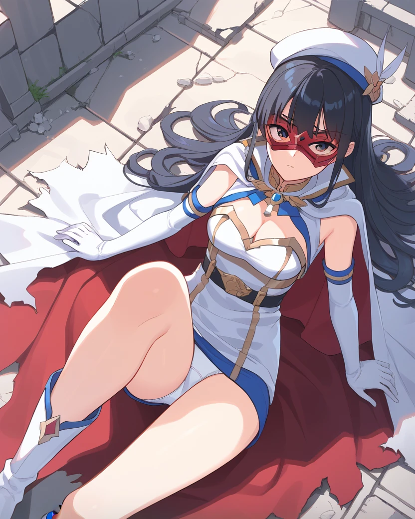 Trigger: mbFontaine,eye mask,long hair,hat,multicolored cape,elbow gloves,cleavage,belt,jewelry,("white vest" might need)