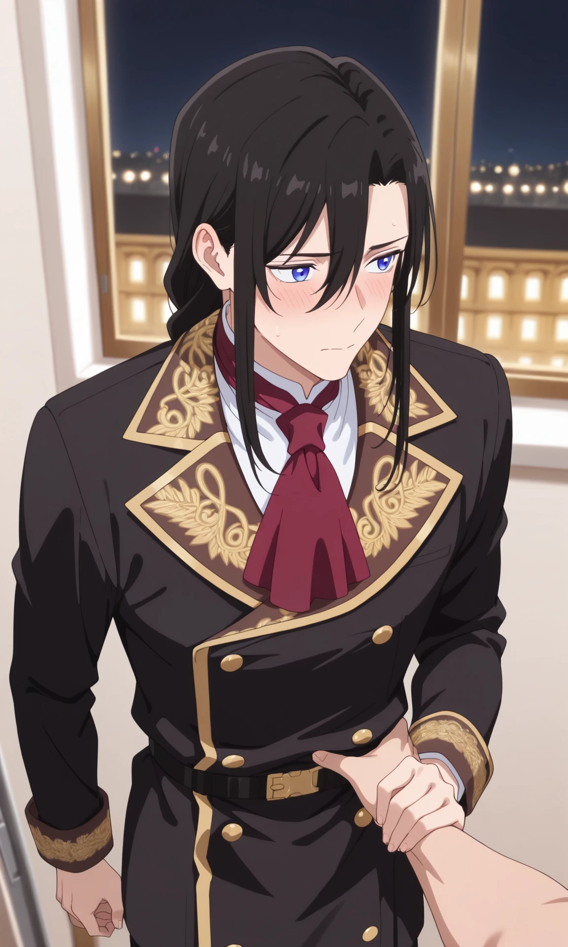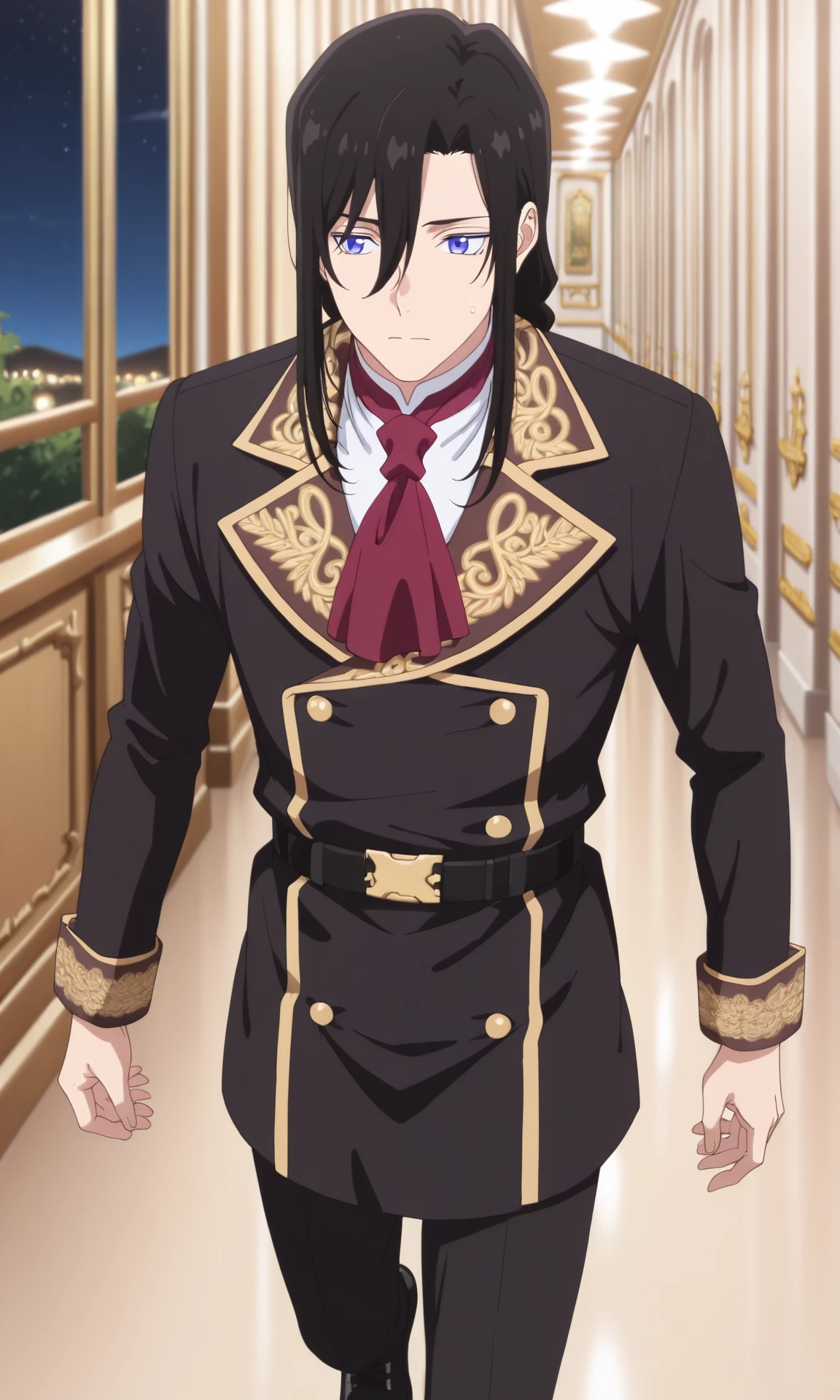 Adult outfit: military uniform,black double-breasted coat,gold embroidery along the lapels, cuffs and trim,white dress shirt under,crimson neck ribbon,black shoes and pants,black belt,