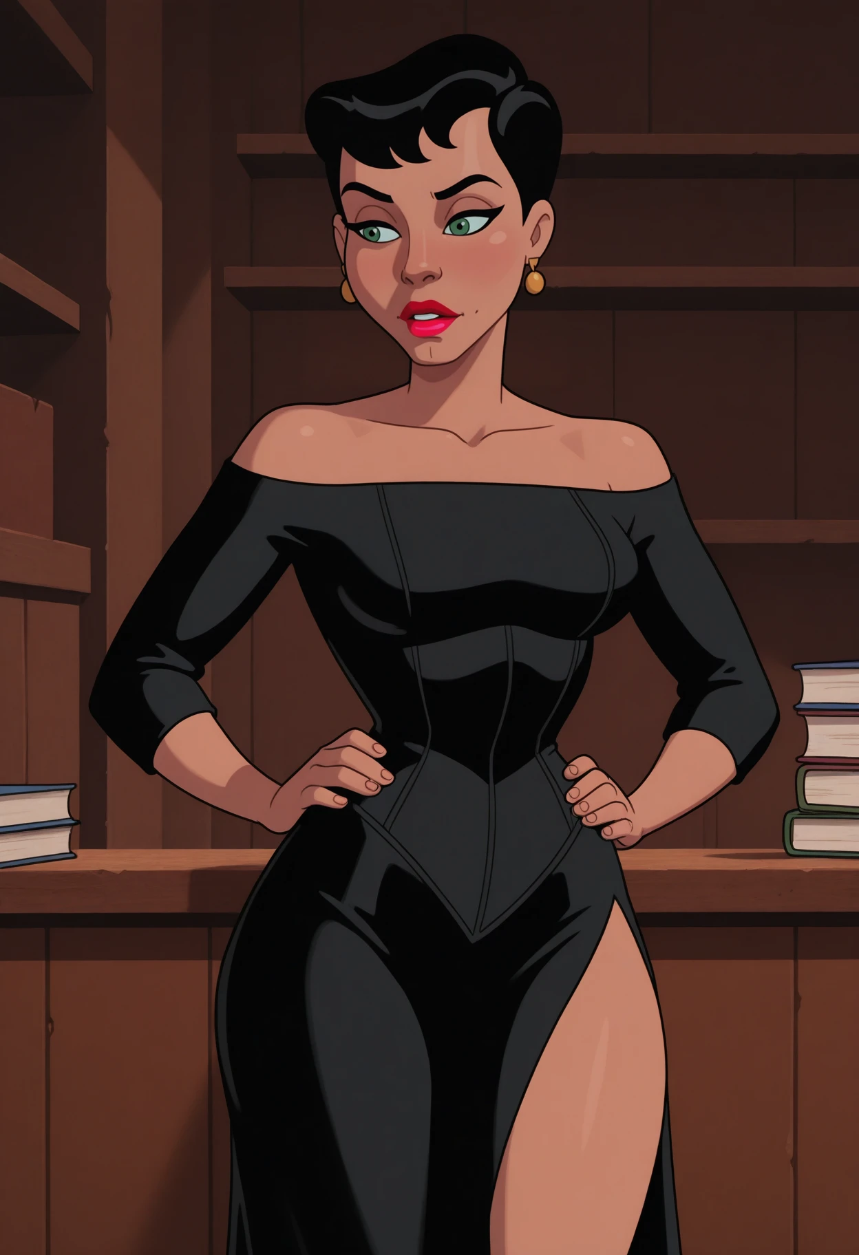 1girl, solo, green eyes, short hair, black hair, breasts, medium breasts, lipstick, red lips,You can support my work by following the link: https://boosty.to/nmackelie