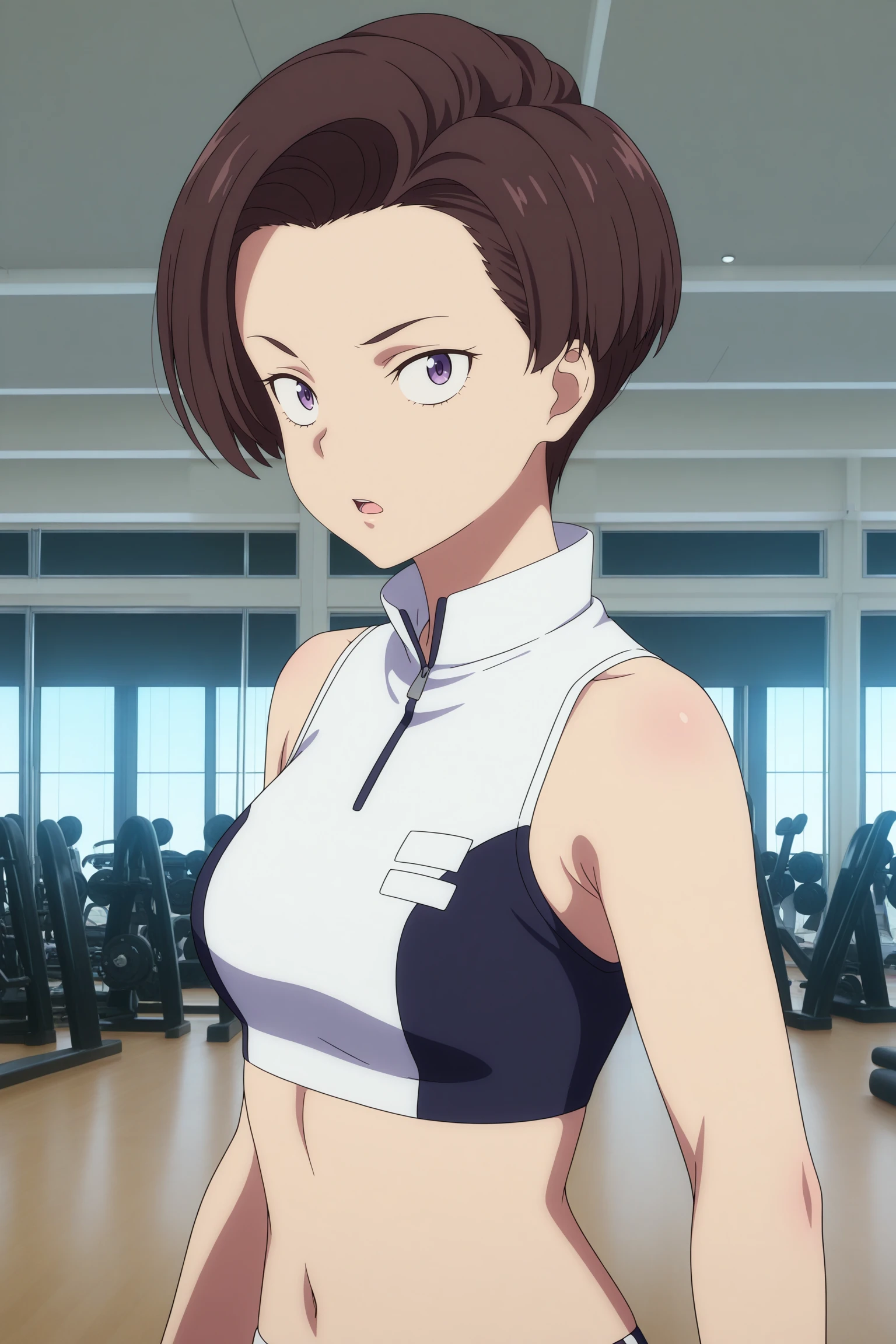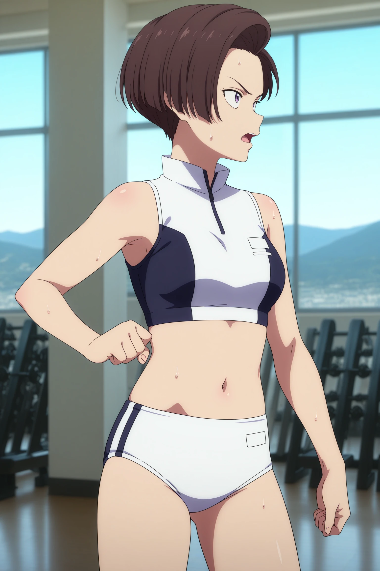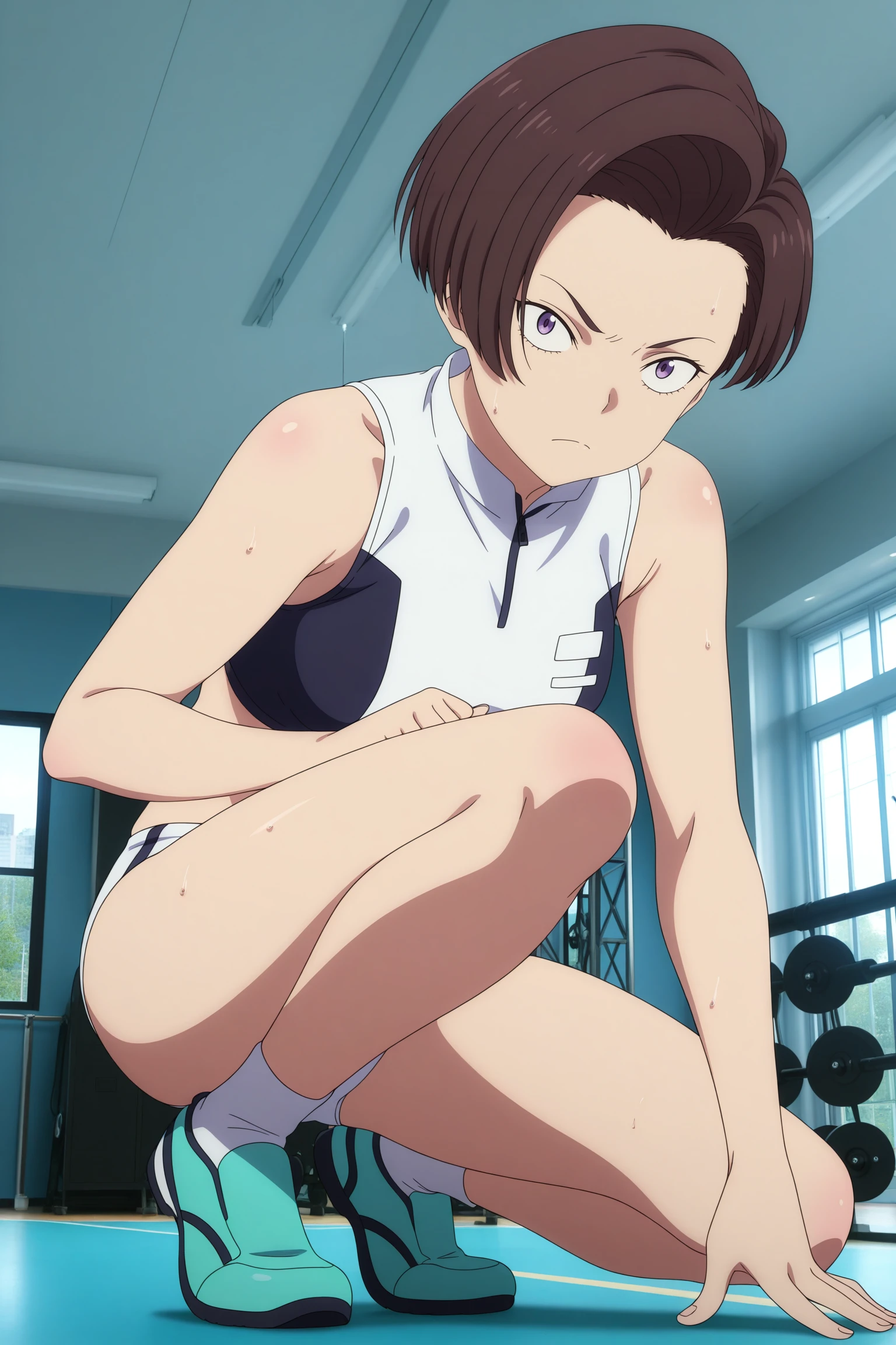harukawa fuki, short hair, brown hair, asymmetrical hair, parted hair, curtained hair, purple eyes, sanpaku, two-tone sports bra, white bra, black bra, high collar, zipper, white buruma, white socks, ankle socks, aqua shoesDescription