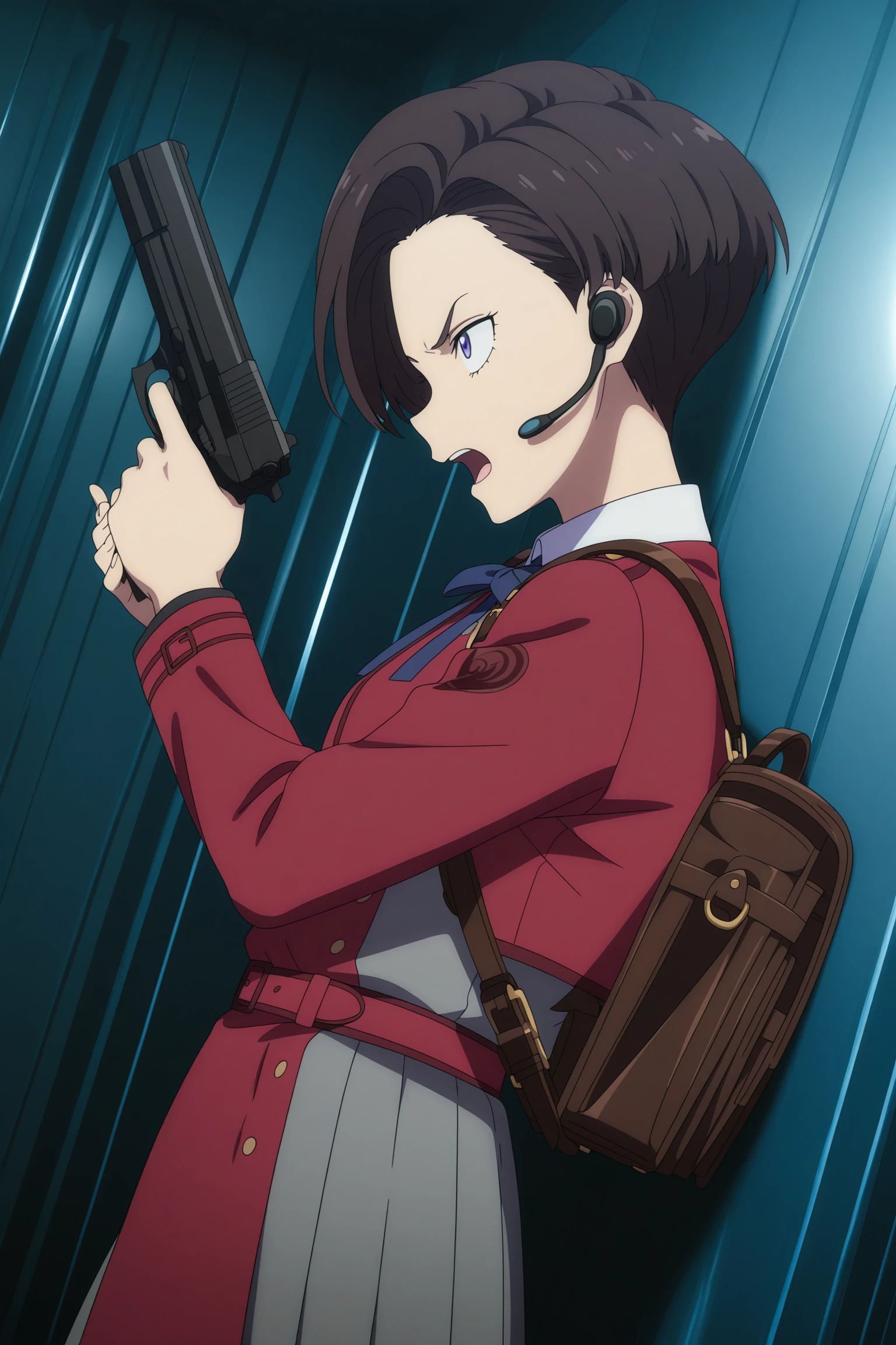 harukawa fuki, short hair, brown hair, asymmetrical hair, parted hair, curtained hair, purple eyes, sanpaku, long sleeves, two-tone dress, red dress, grey dress, blue ribbon, neck ribbon, red belt, backpack, brown bag, grey pantyhose, brown shoes, loafersGym Uniform