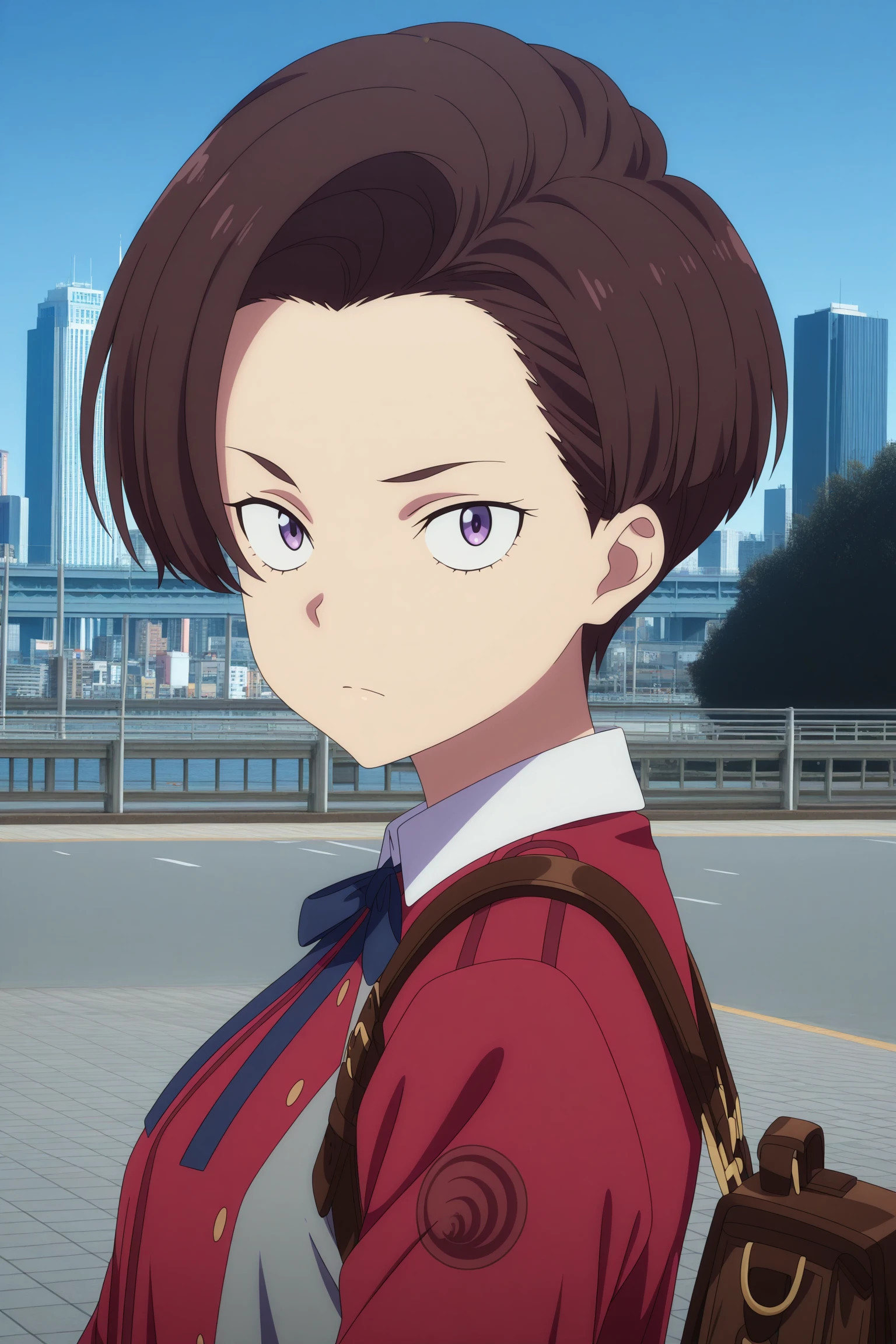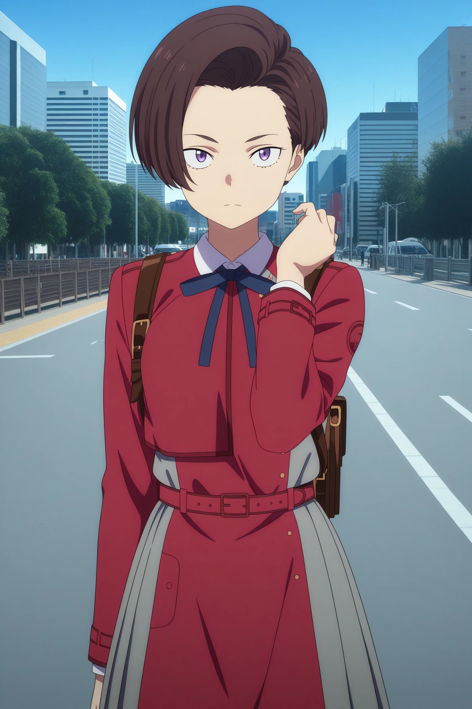 harukawa fuki, short hair, brown hair, asymmetrical hair, parted hair, curtained hair, purple eyes, sanpaku, long sleeves, two-tone dress, red dress, grey dress, blue ribbon, neck ribbon, red belt, backpack, brown bag, grey pantyhose, brown shoes, loafers