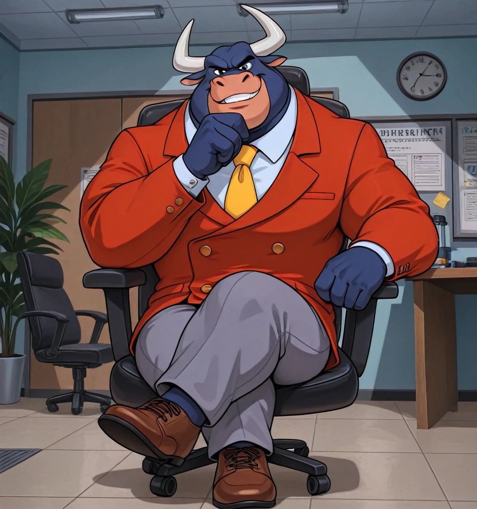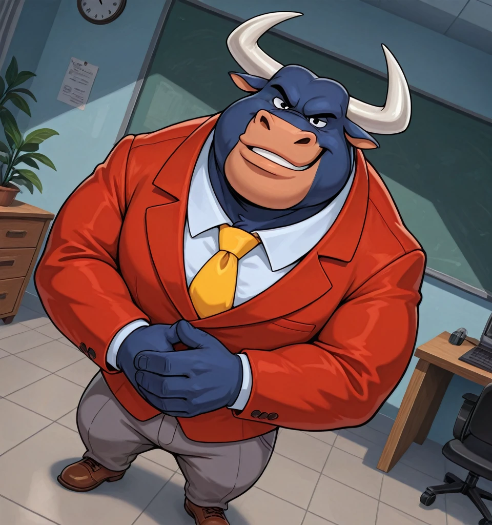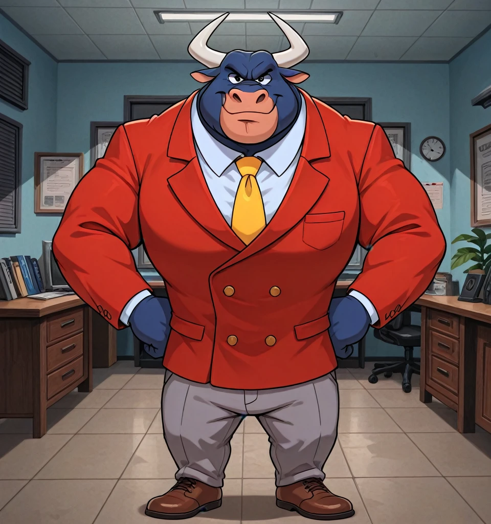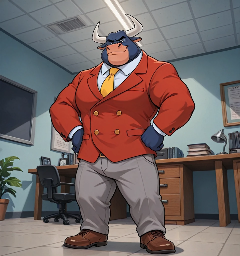 Taurus_Bulba, mature male, anthro, bull, black eyes, blue fur, burly, muscle, yellow necktie, red suit, gray pants, brown shoes,