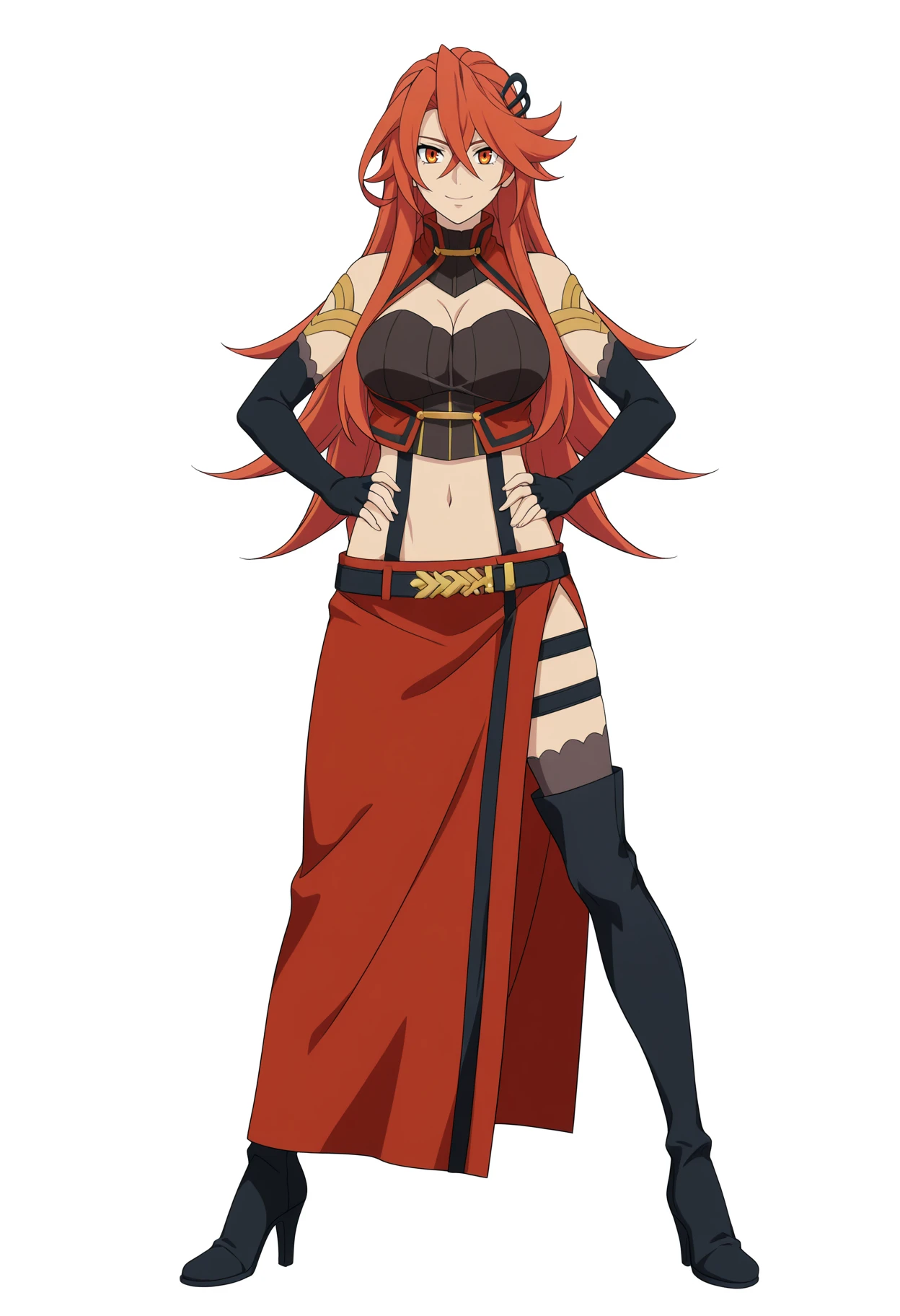 Basic outfit prompts : cleavage, ?????????????, crop top, black elbow gloves, red skirt, ???? shoulders, side slit, navel, midriff, thigh boots, fingerless gloves, high heel boots, thighhighs