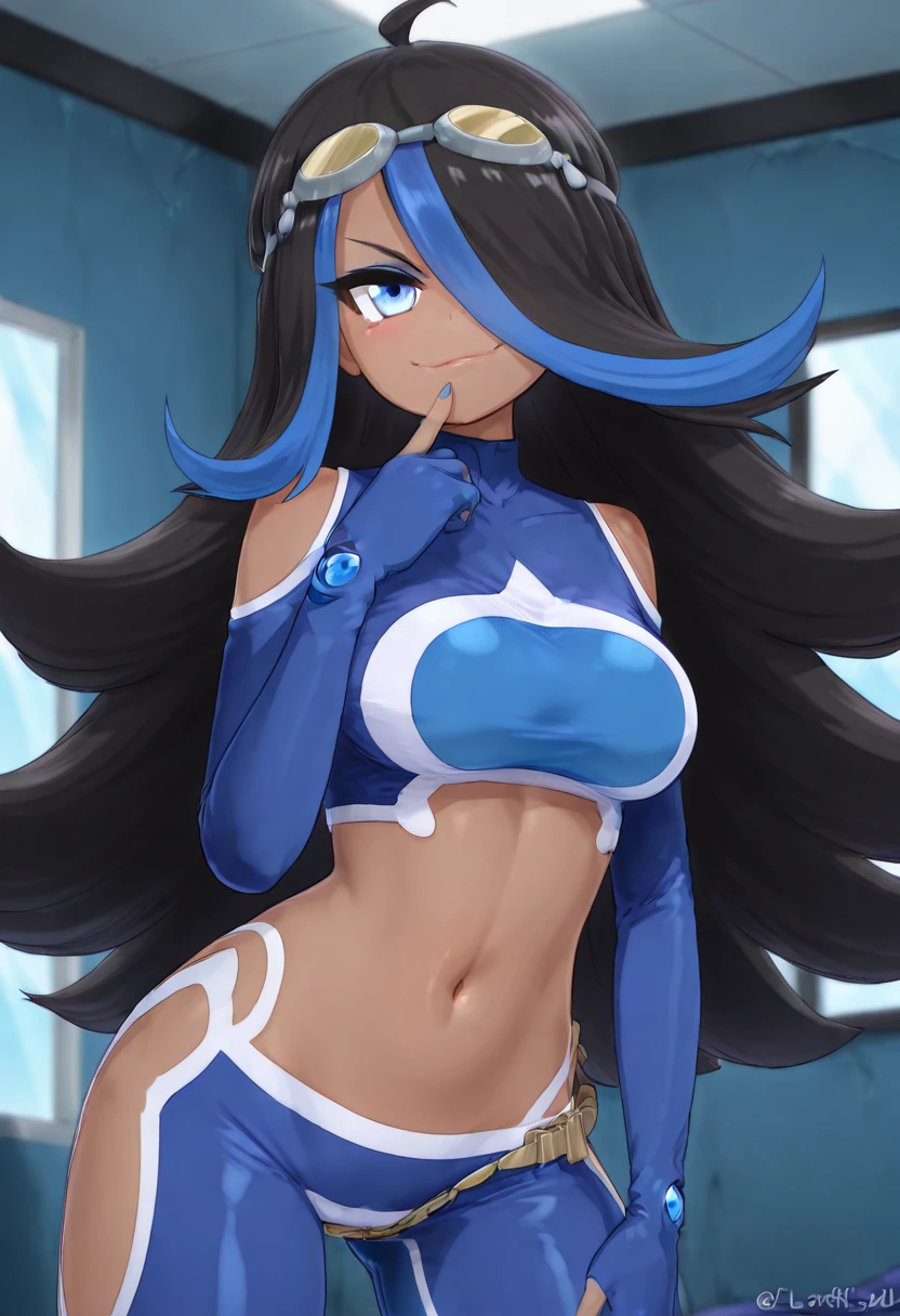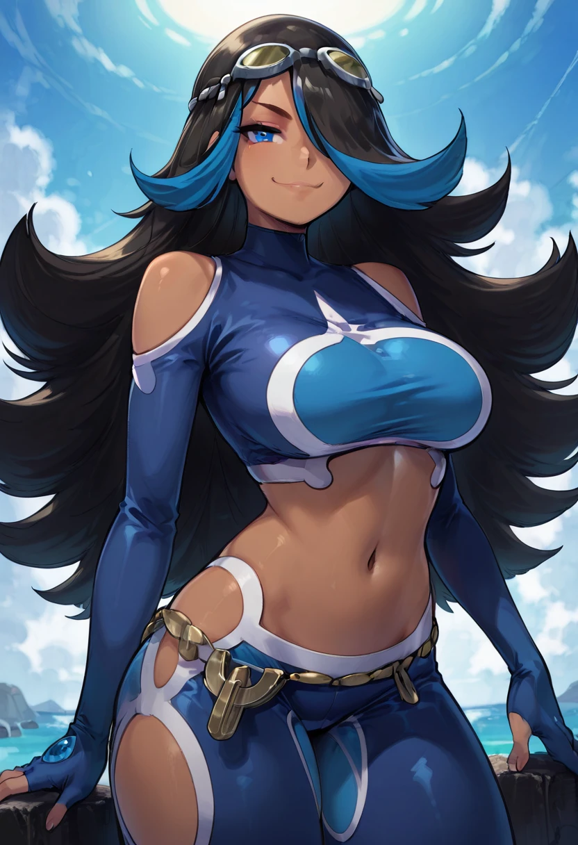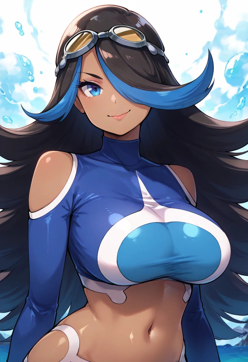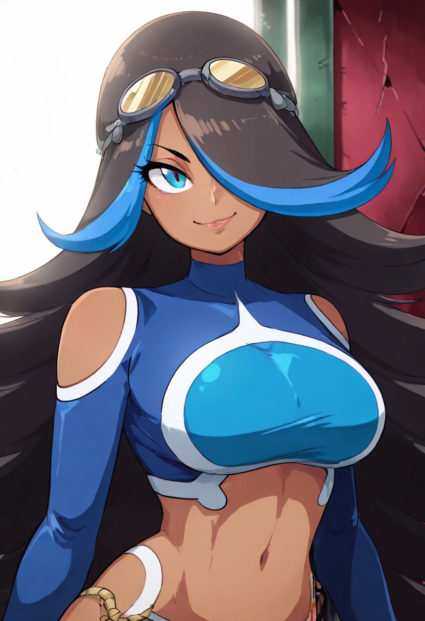 zzShelly, blue eyes, long hair, blue hair, multicolored hair, dark skin, black hair, two-tone hair, hair over one eye, goggles on head, crop top, midriff, streaked hair, shoulder cutout, navel,