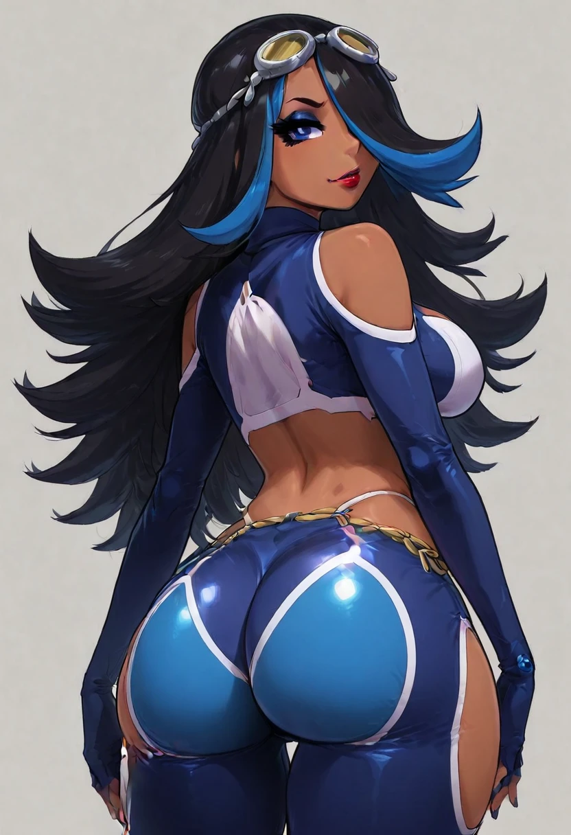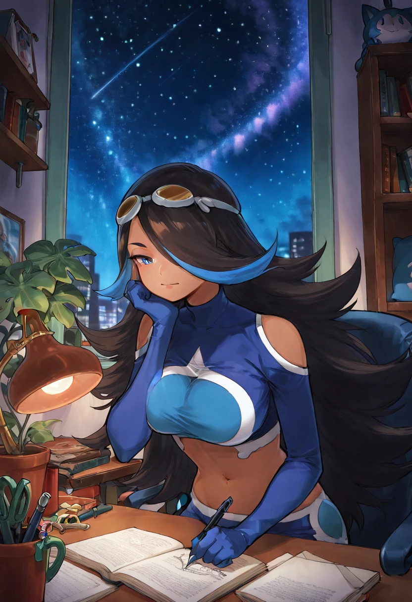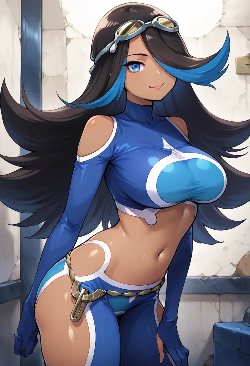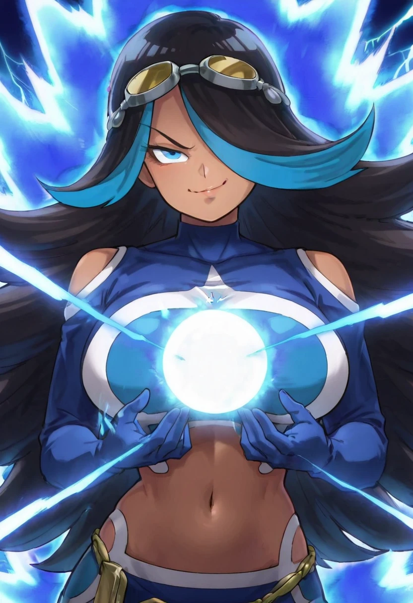 zzShelly, blue eyes, long hair, blue hair, multicolored hair, dark skin, black hair, two-tone hair, hair over one eye, goggles on head, crop top, midriff, streaked hair, shoulder cutout, navel,