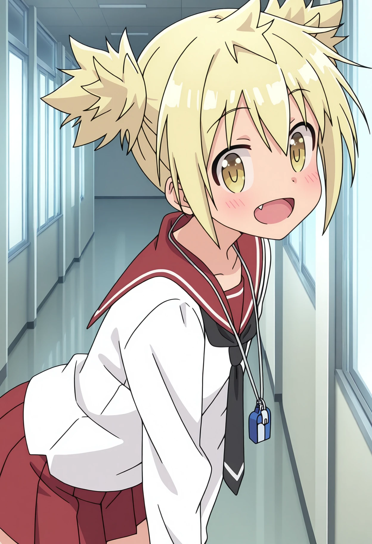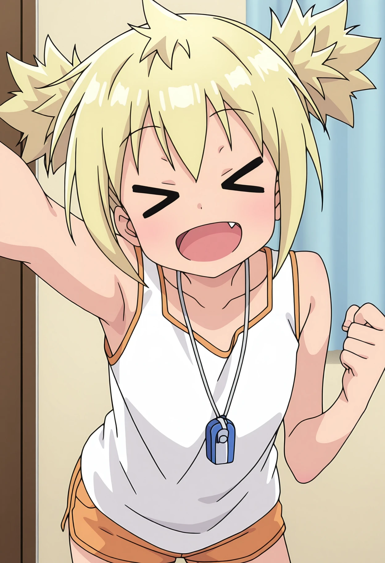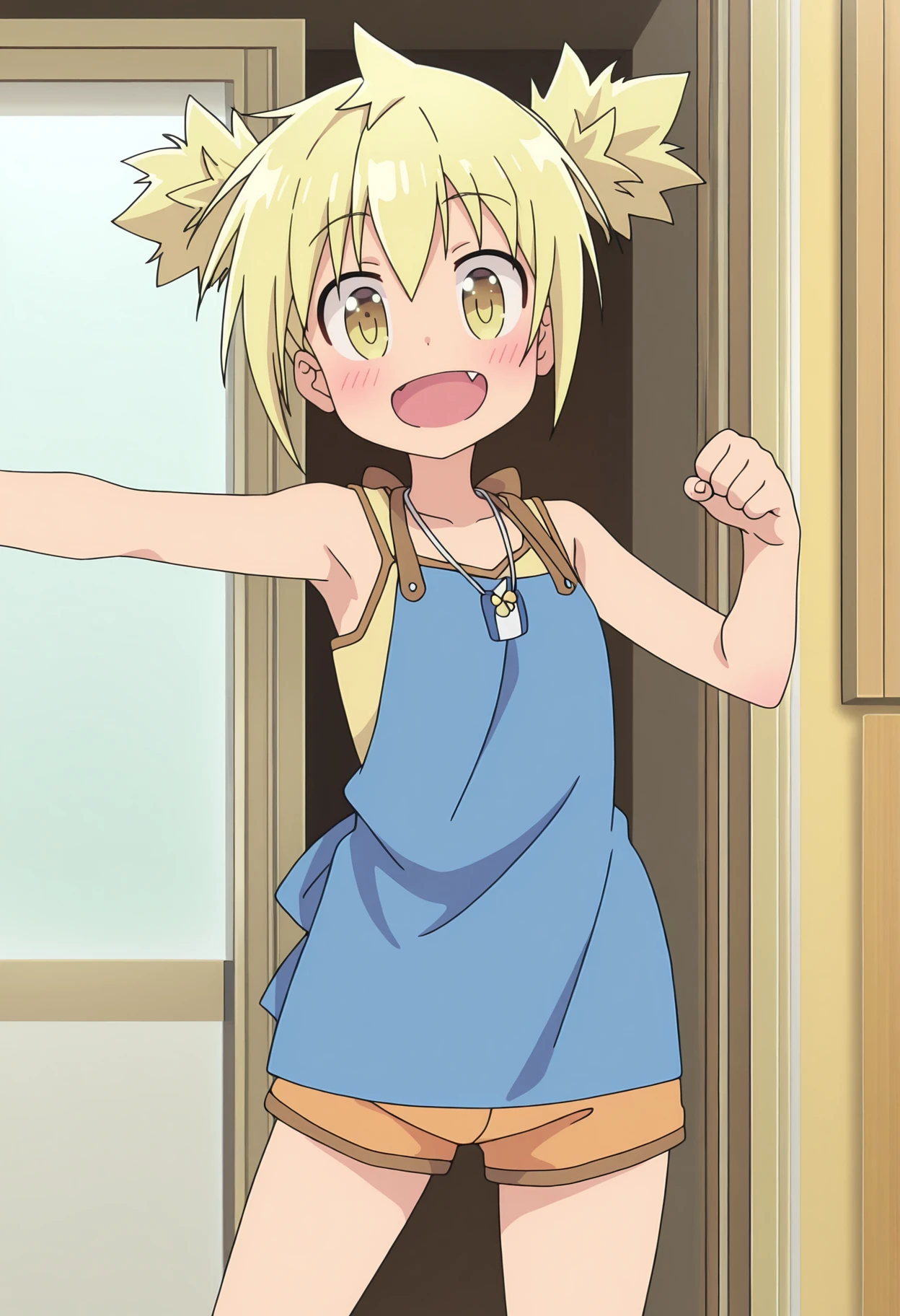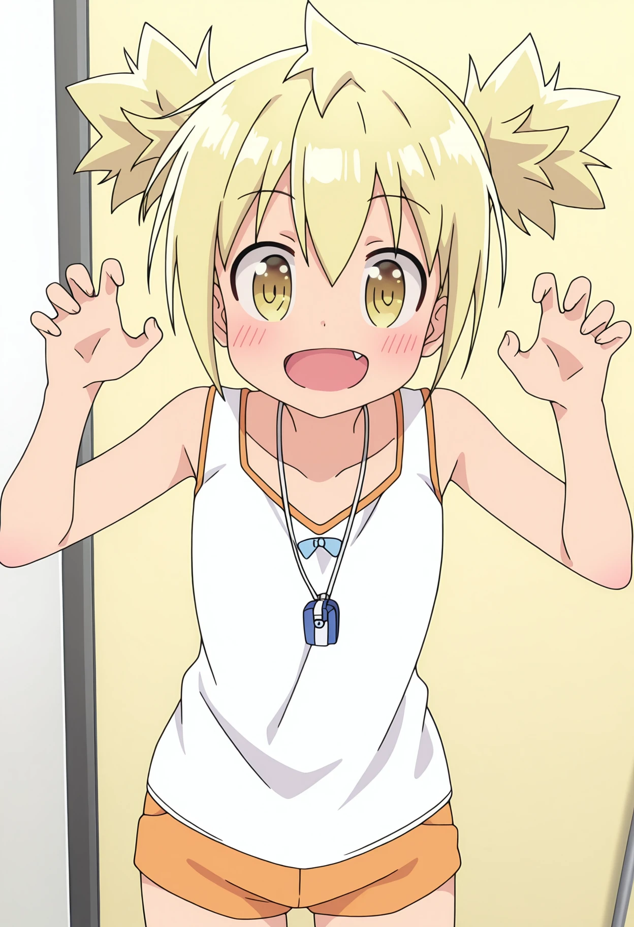tkymhana, blonde hair, short twintails, yellow eyes, fang,