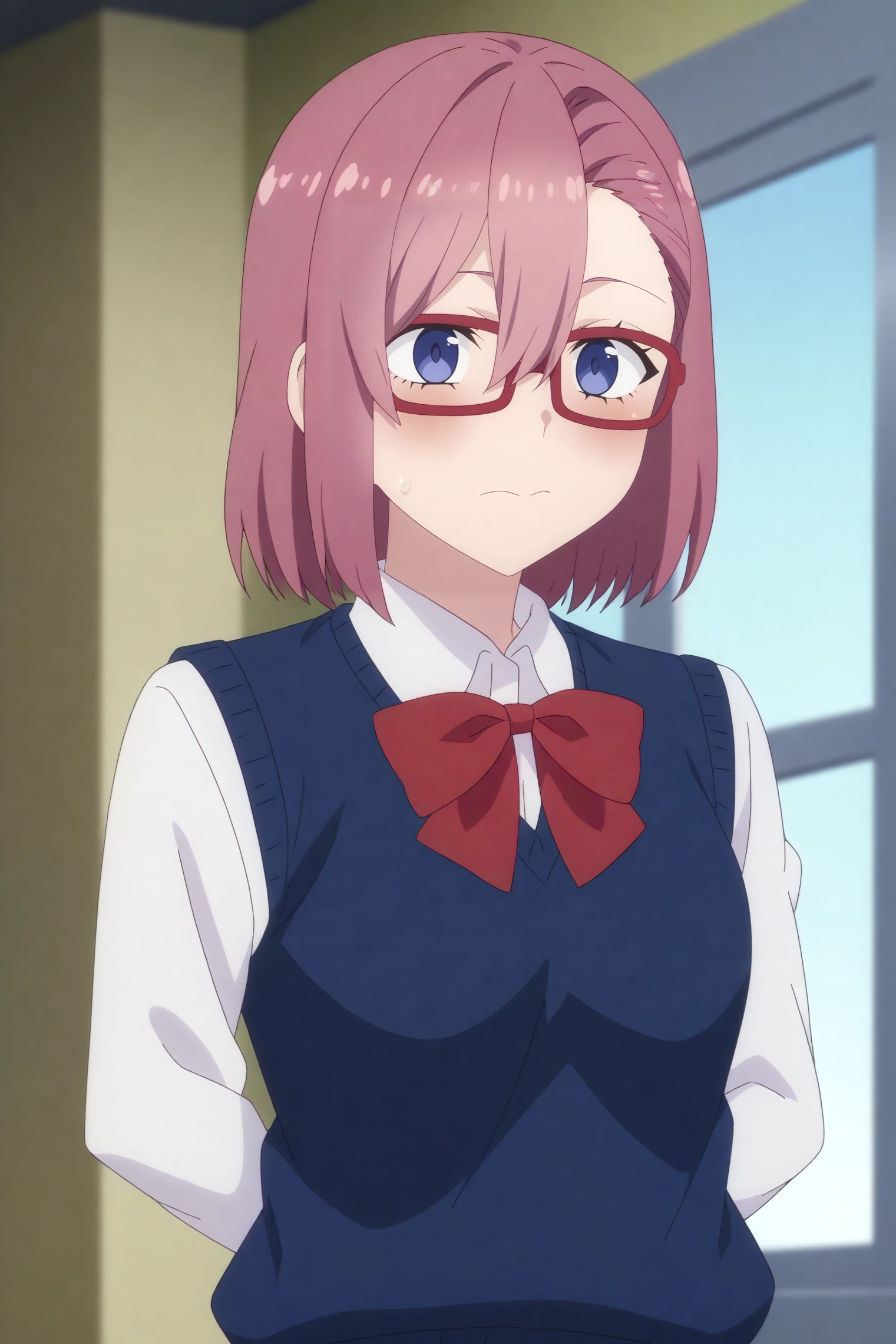 Triggers : mikari ririsa amano,1girl,solo,glasses,shirt,hair between eyes,ribbon,short hair,red bow,bow,smile,sweater vest