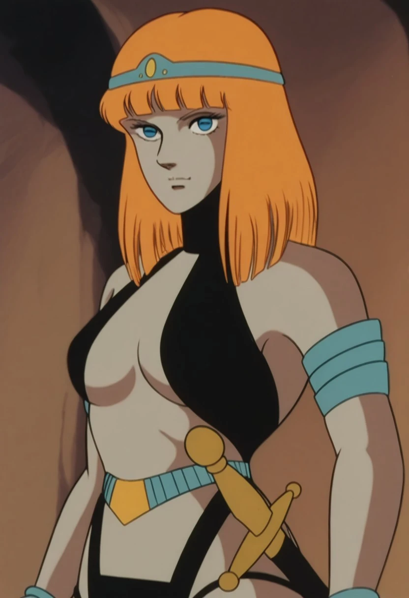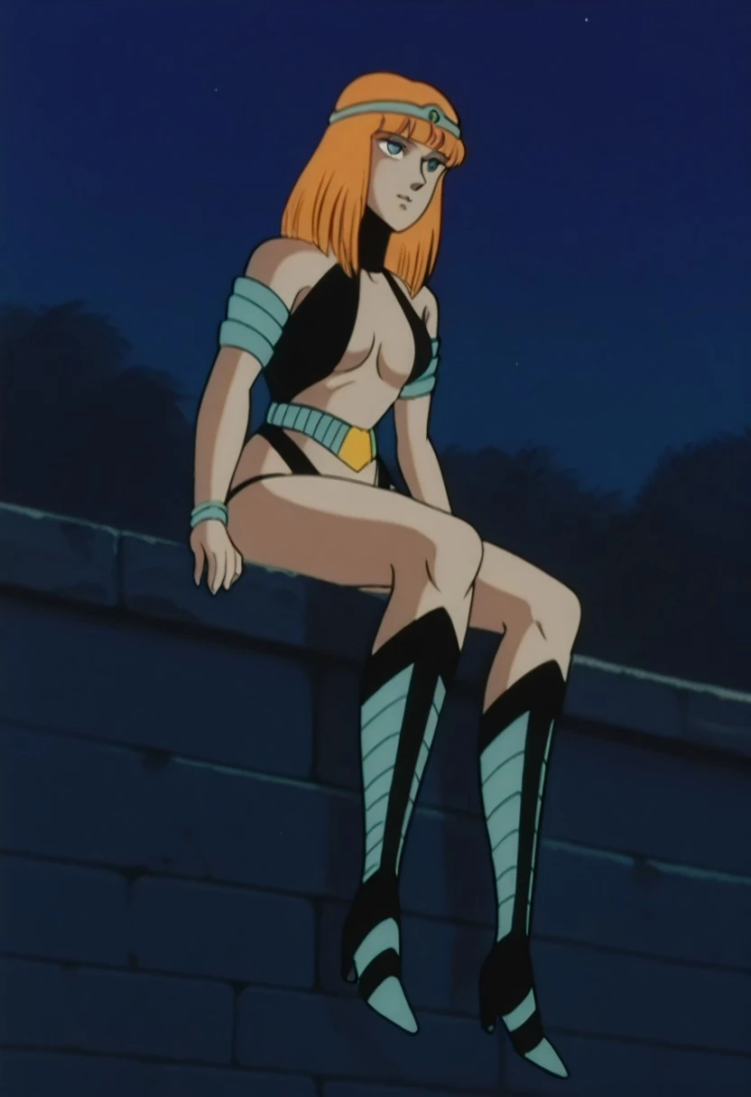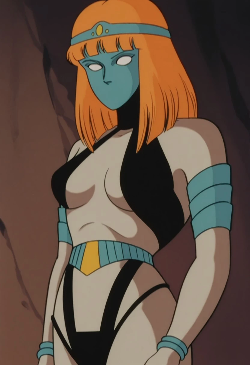 shmnmzg3r, blue eyes, horizontal pupils, black leotard, clothing cutout, circlet, halterneck, armlet, bracelet, belt, high heel boots, knee boots, retro artstyle, anime screencap