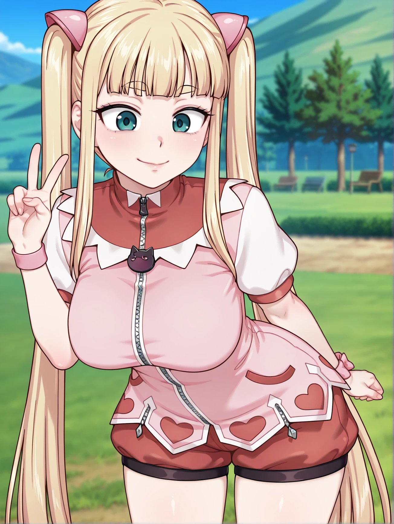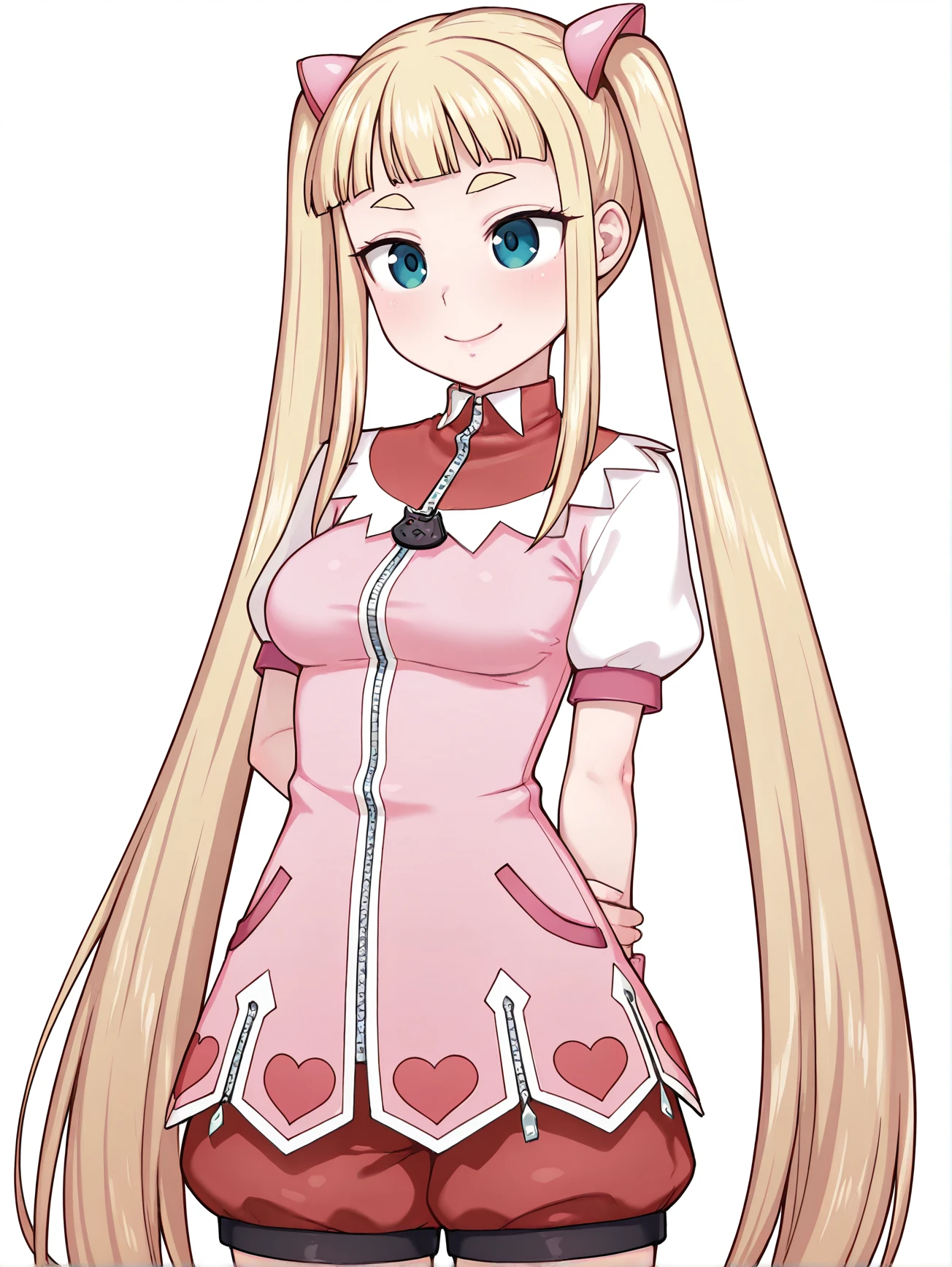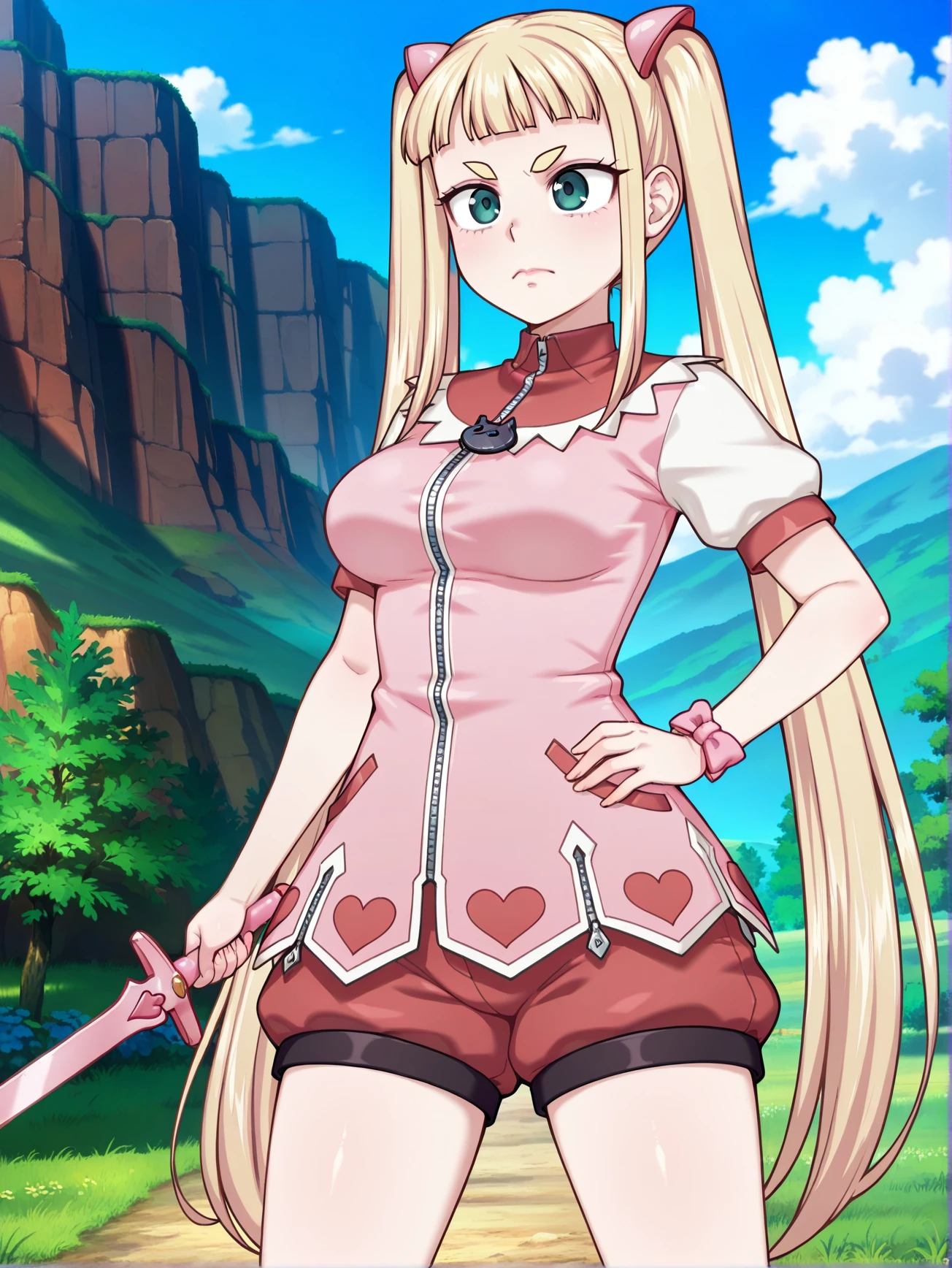 konoha \(magical girl konoha\), magical girl outfit, cat-shaped zipper pull, pink wristband, red puffy shorts, black frilly socks, red mary janes (If needed add eyes/hair color)