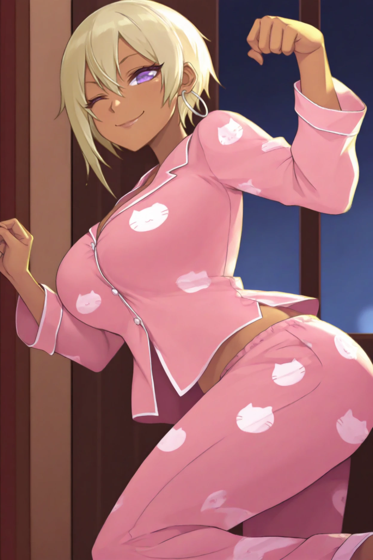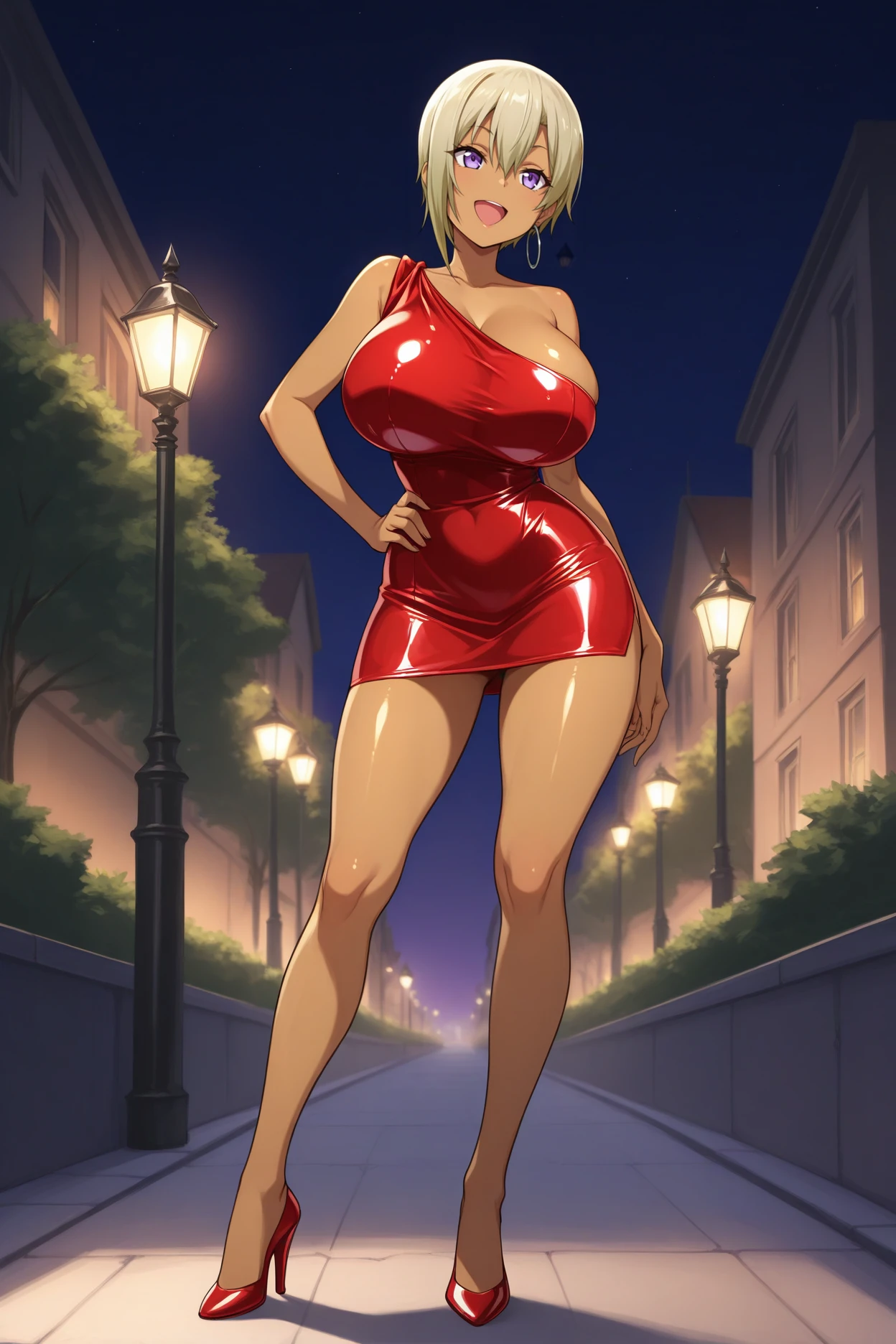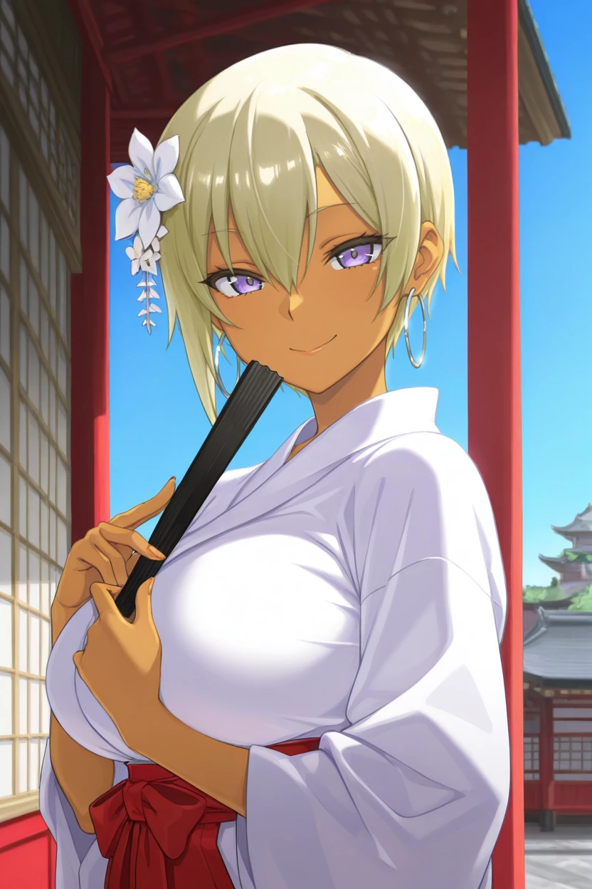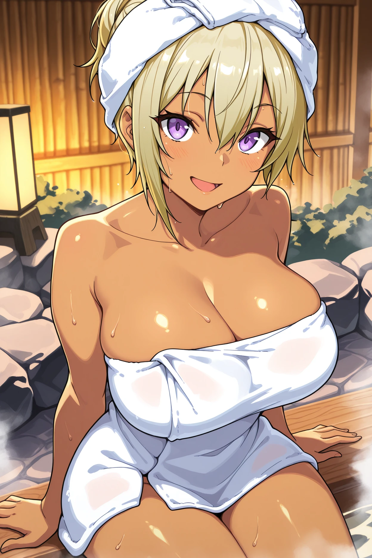 rhnj, dark-skinned female, blonde hair, short hair, hair between eyes, purple eyes, big breasts