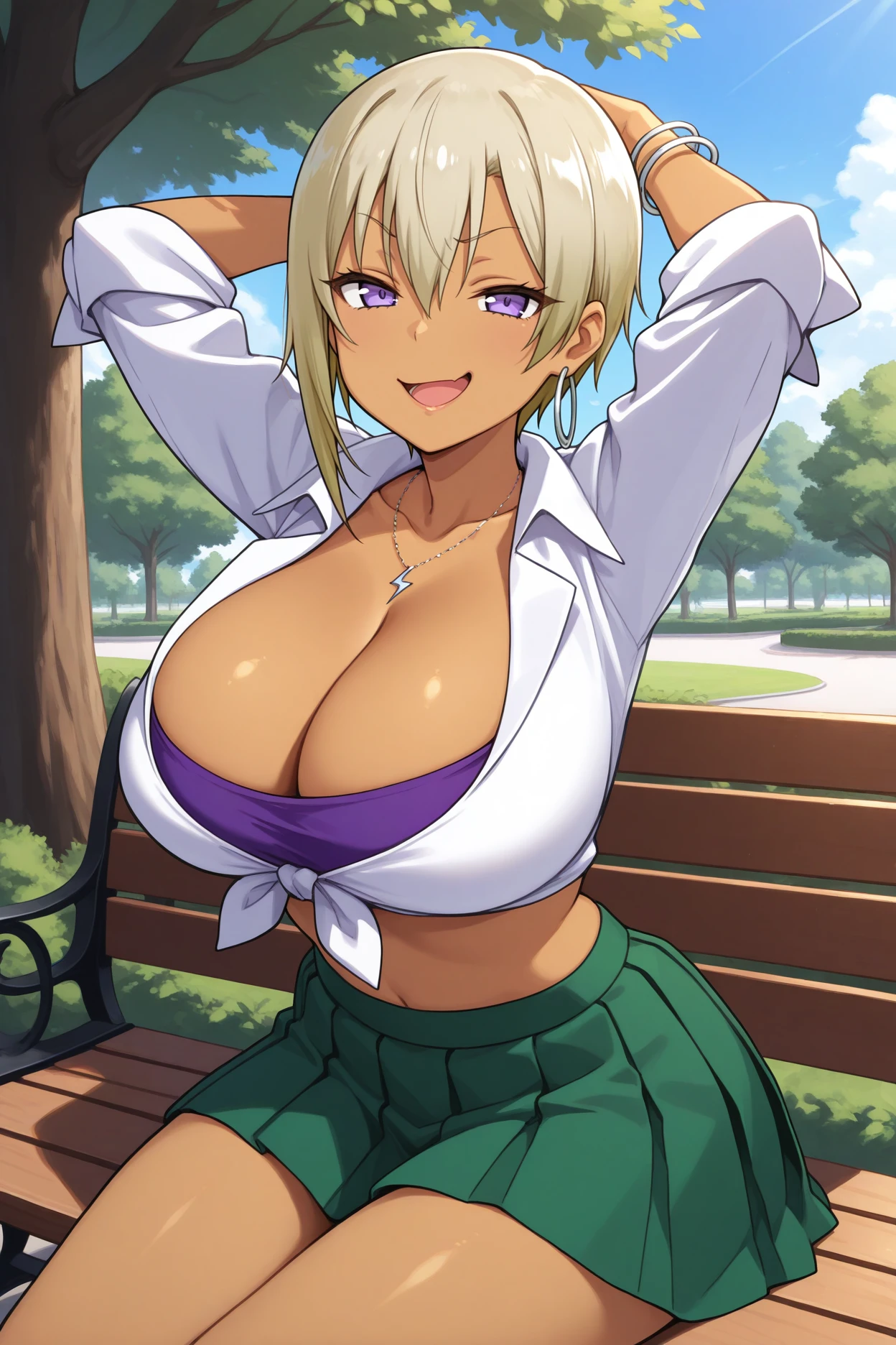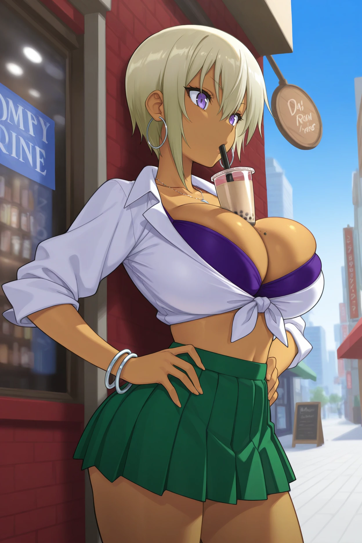 Add "hoop earrings, necklace, white shirt, tied shirt, cleavage, purple bra/purple crop top, sleeves rolled up, midriff, green skirt, miniskirt, pleated skirt, bracelet, black socks, loafers" for her typical look.