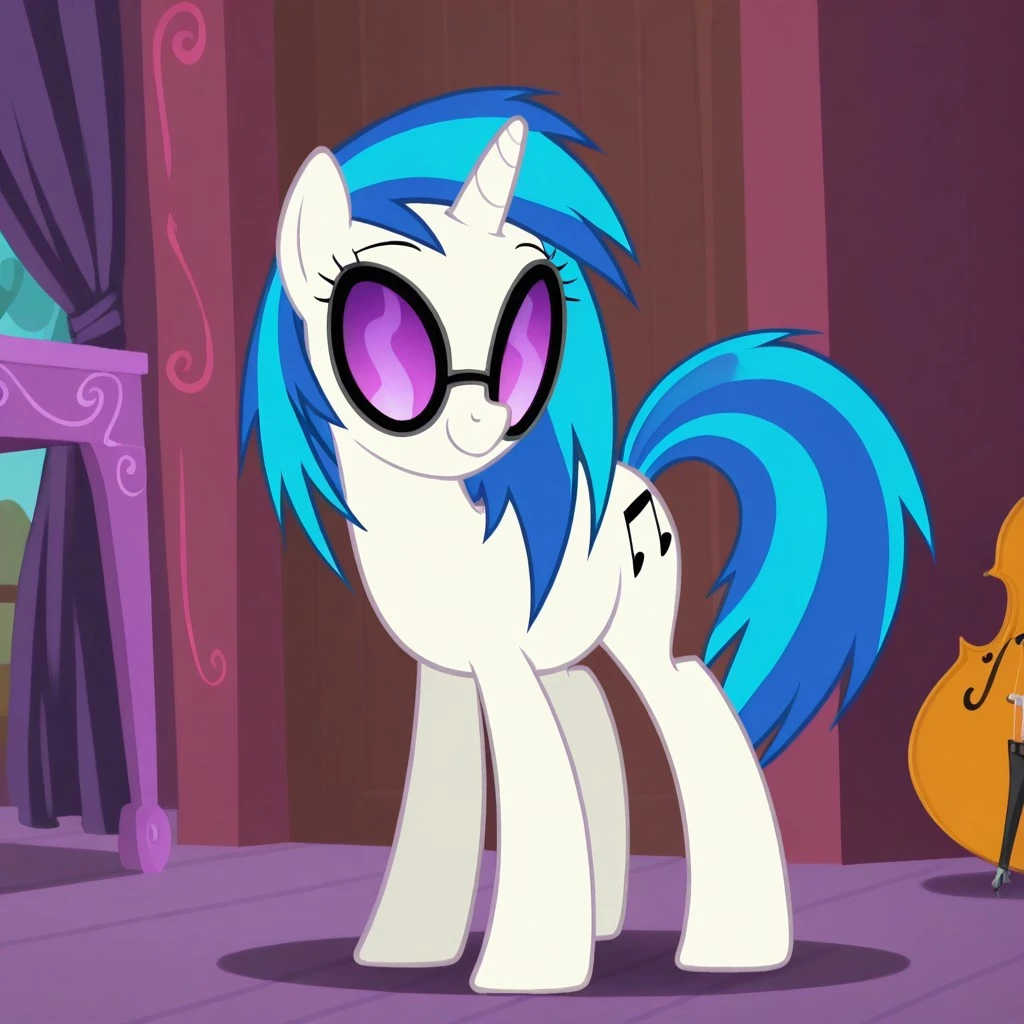 vinylscratch, pony, white body, blue hair, purple glasses, eyelashes, headphones, horn, unicorn, horse, 2D, flat colors, female, cartoon, hooves, music note, tattoo, blue tail,