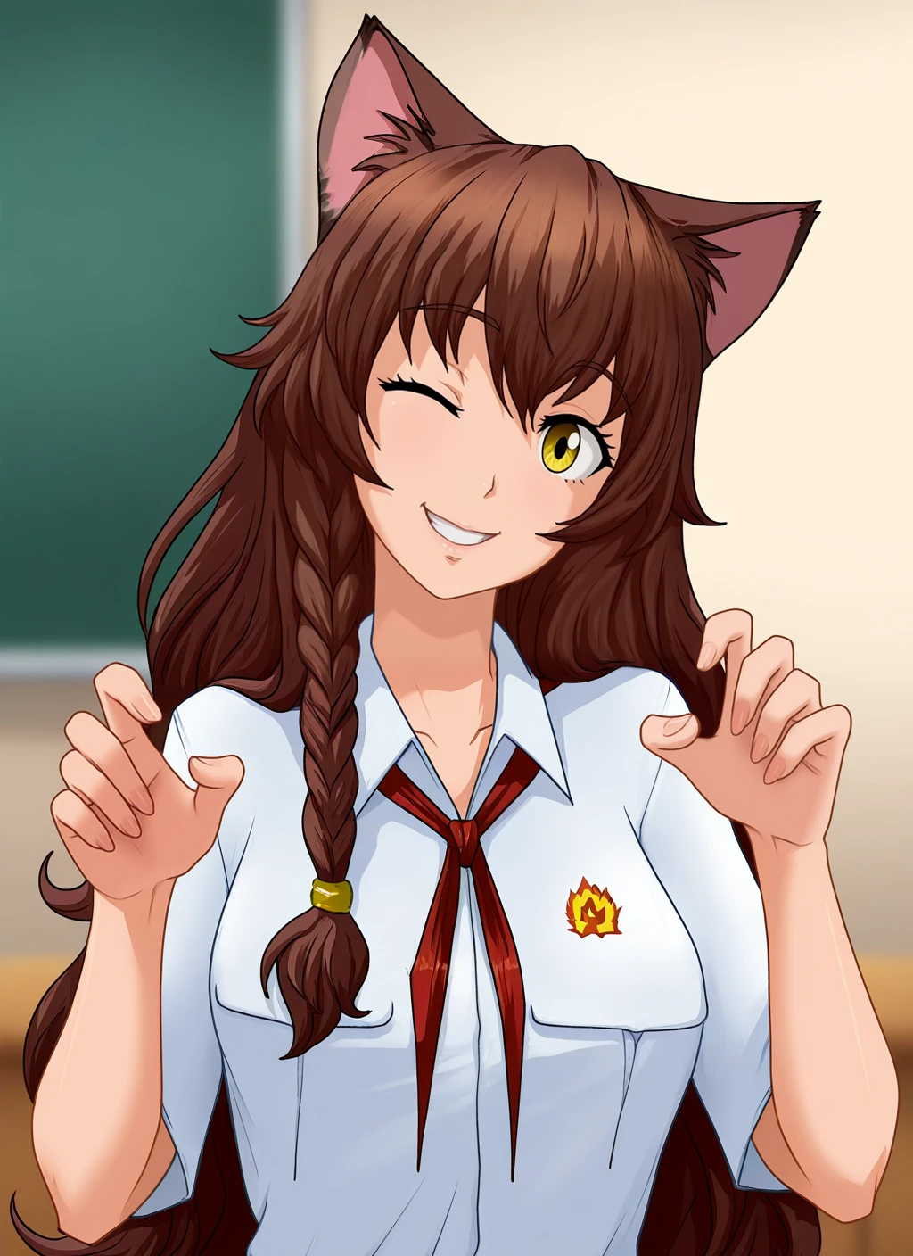 uluv, yellow eyes, brown hair, long hair, cat ears, side braid