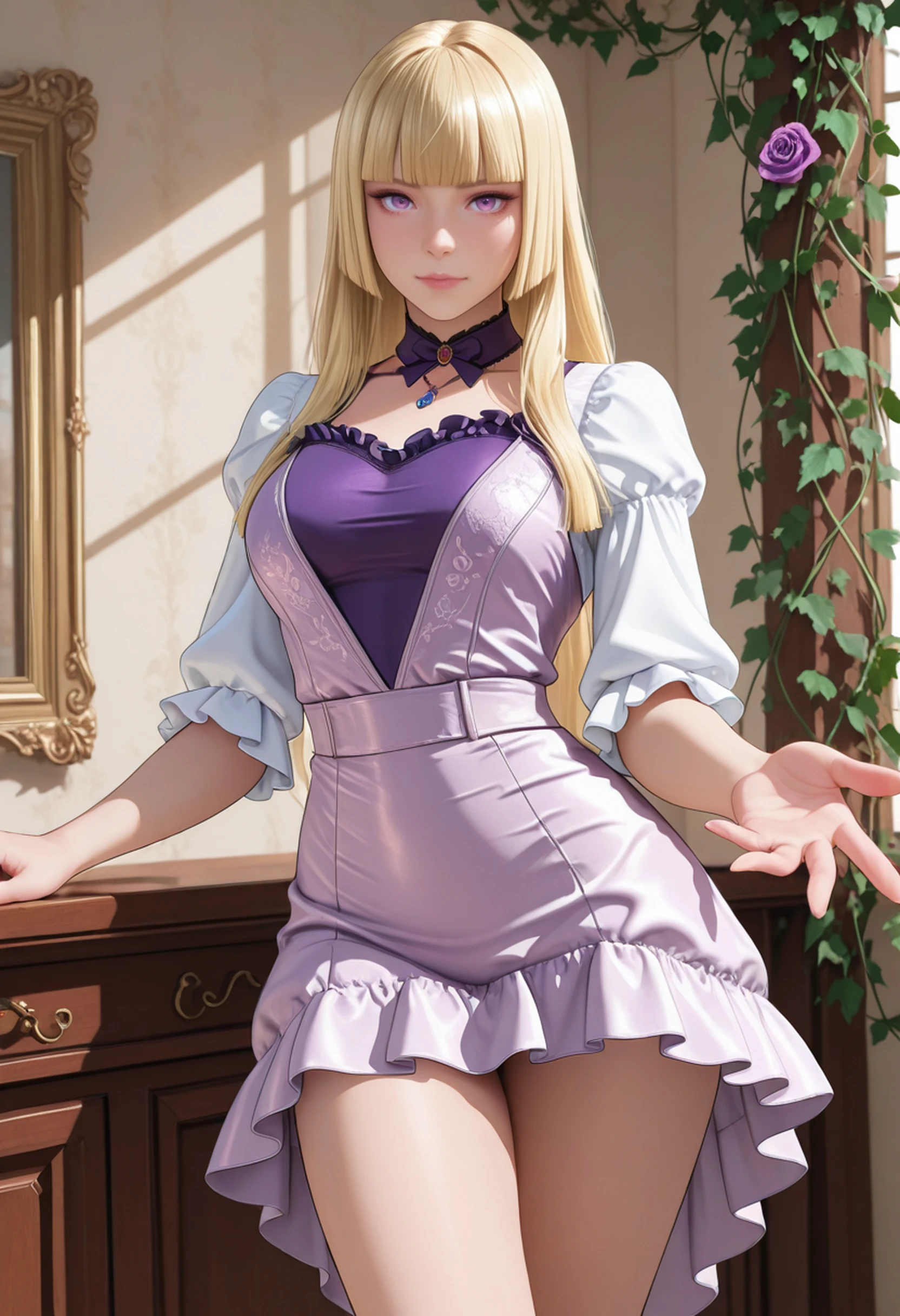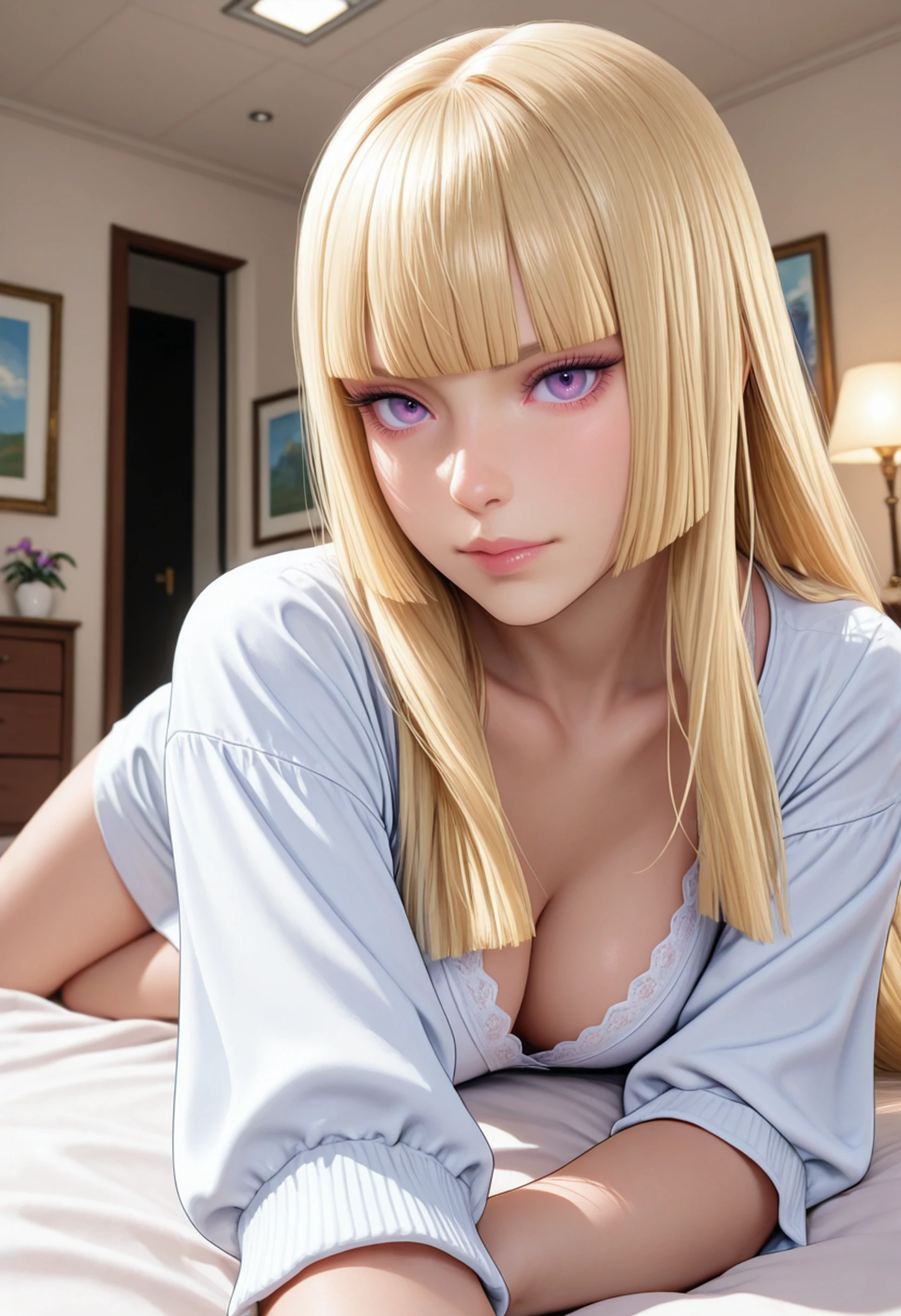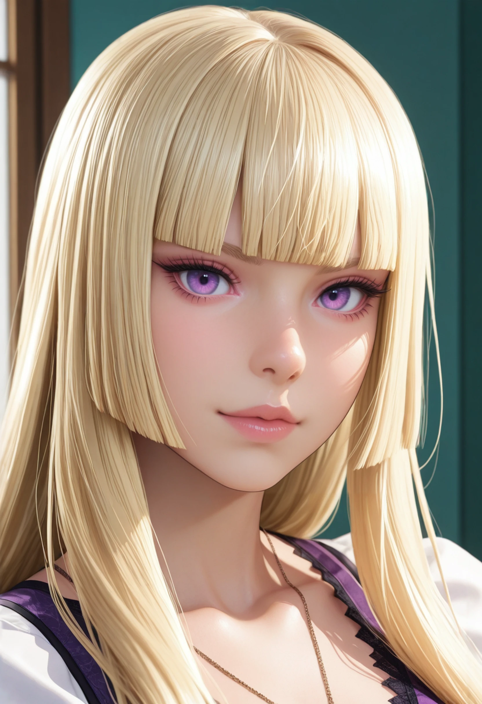T8Lili, 1girl, blonde hair, long hair, blunt bangs, purple eyes