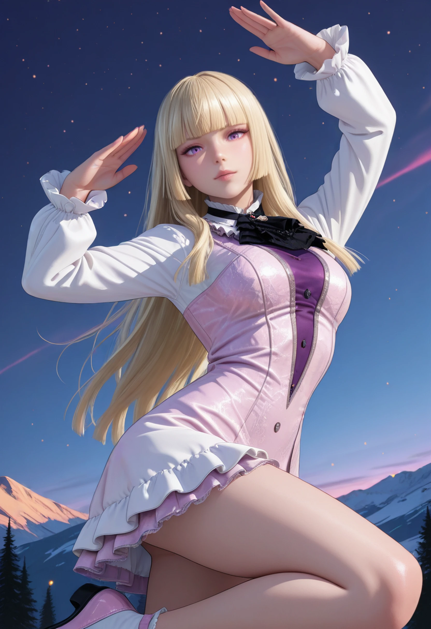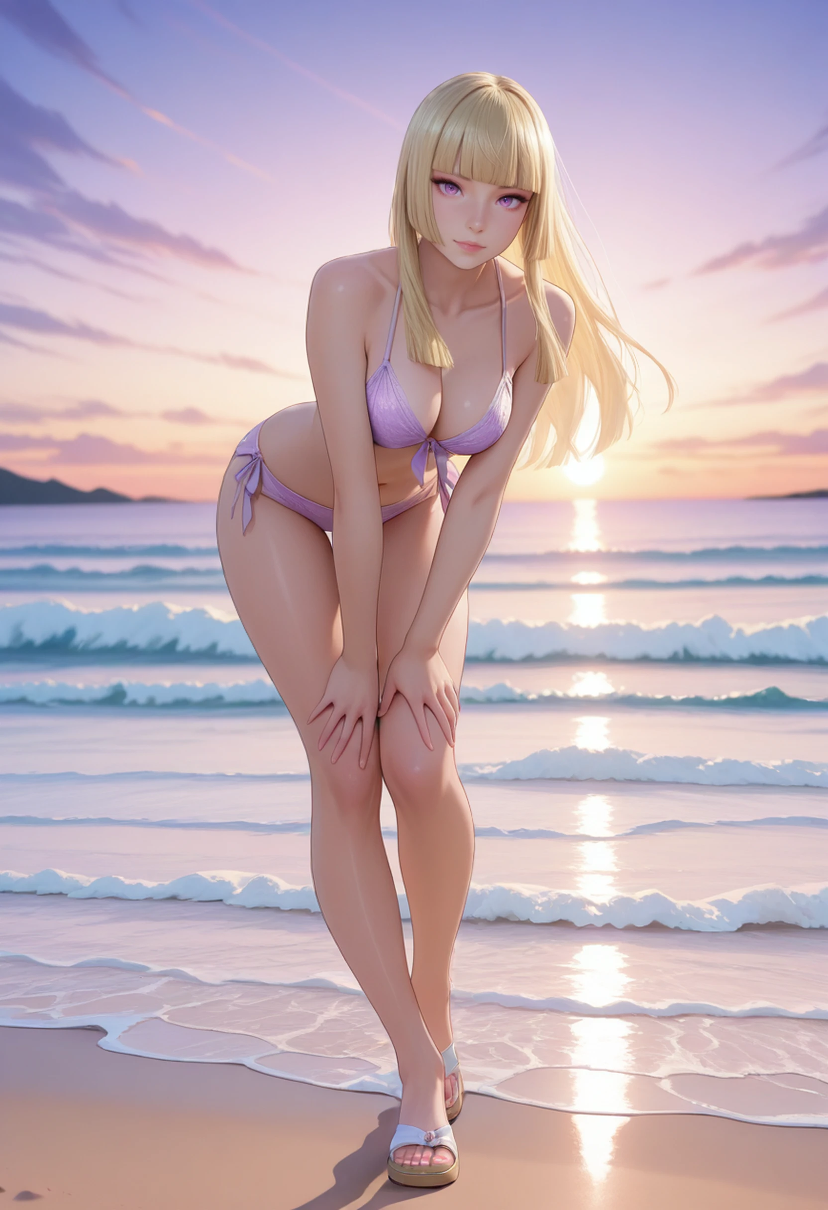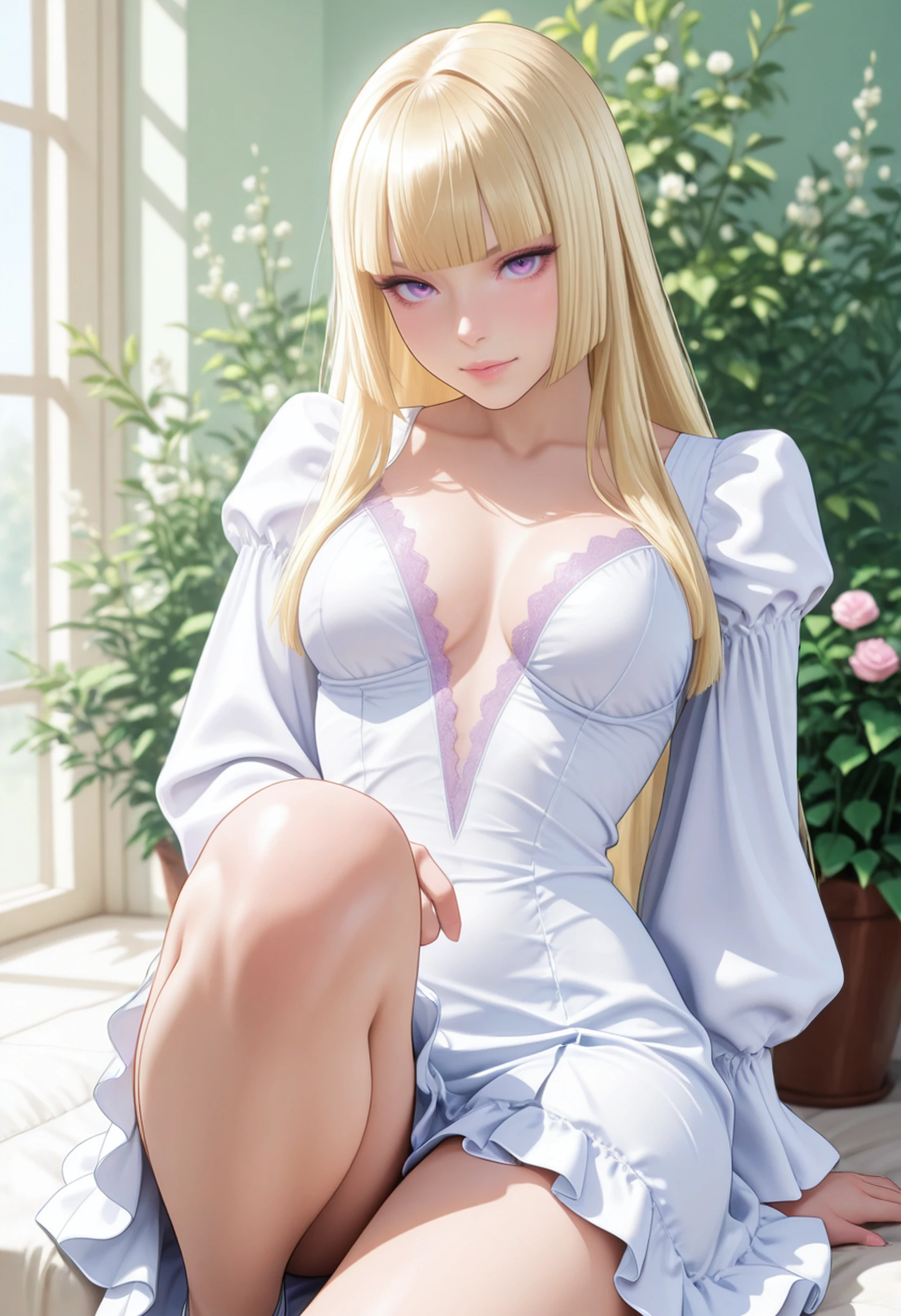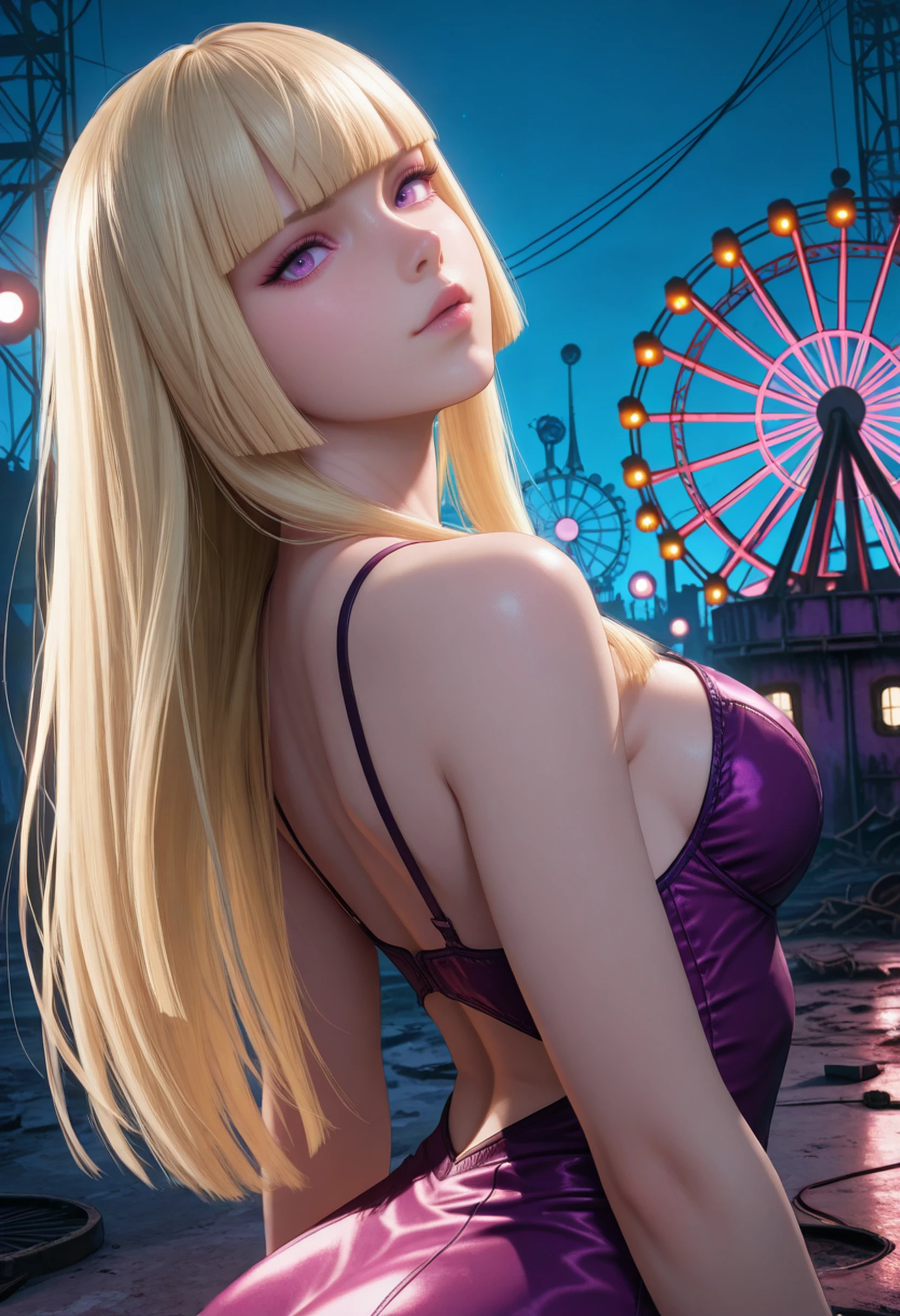 T8Lili, 1girl, blonde hair, long hair, blunt bangs, purple eyes