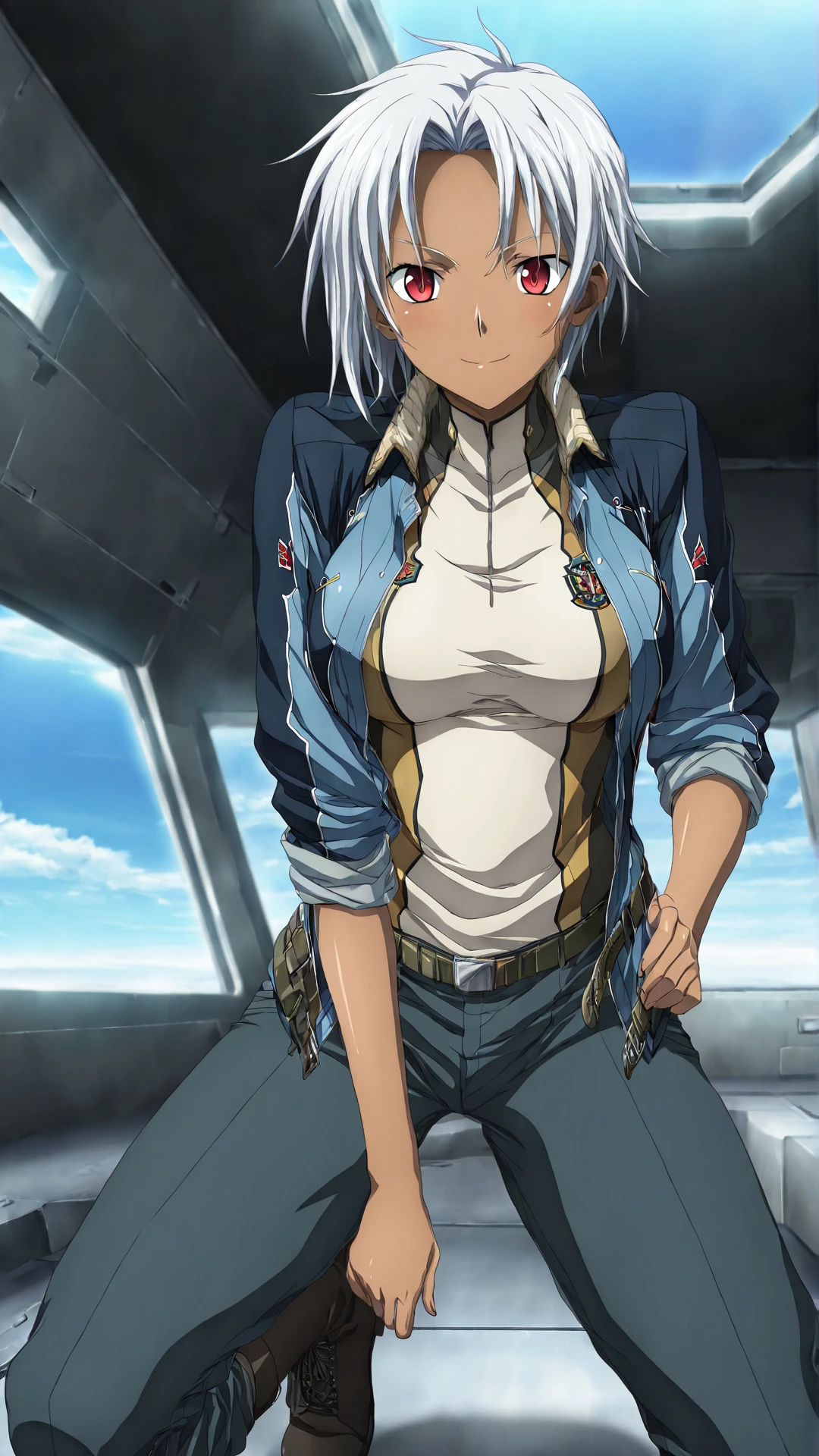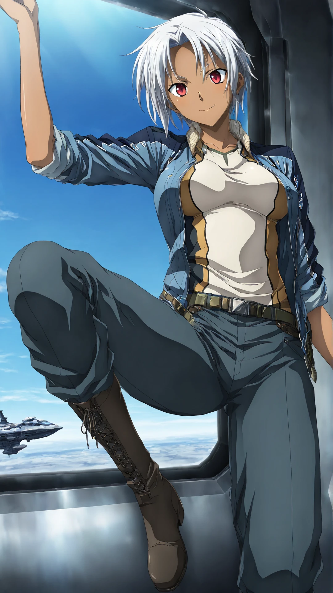 shizel-steinbrecher, dark skin, boots, short hair, jacket, pants, dark-skinned female, sleeves rolled up, belt, red eyes, white hair, uniform