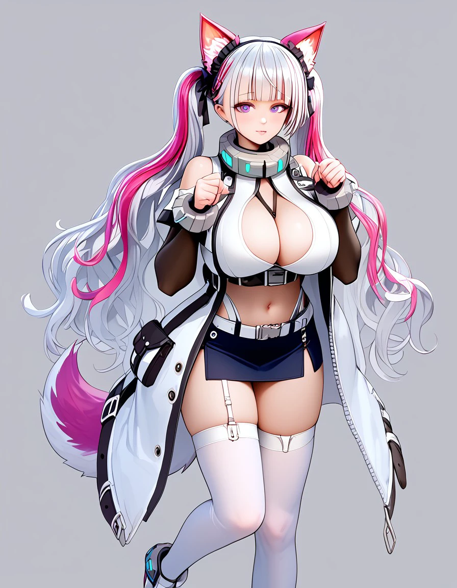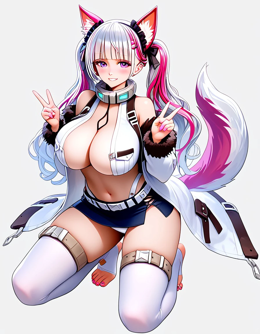 Orca Puppy, Eternity: et@inu, white_jacket, white_jacket_front_opening, barefoot, cleavage, collar, long_hair, microskirt, navel, thighhighs, toeless_legwear, toes, transparent_background, wolf_ears, wolf_girl, wolf_tail, purple eyes,