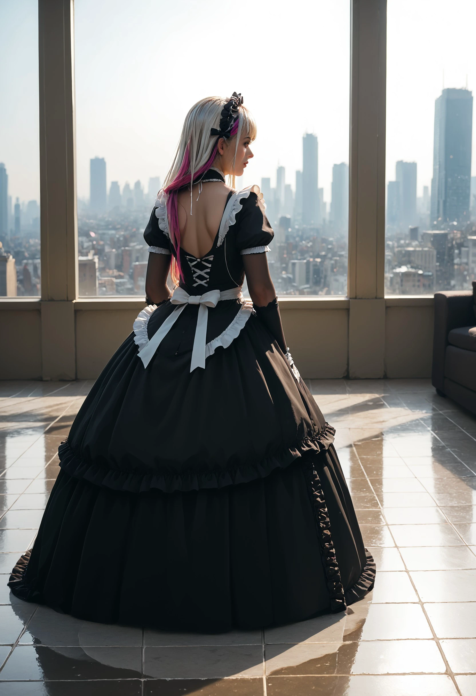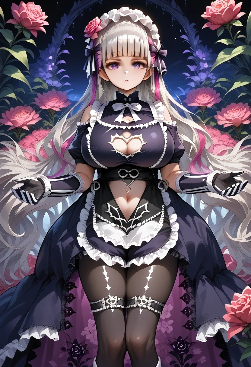 Base: et_bas3, black_gloves, full bodysuit, elbow_gloves, floral_print, ruffled clothes, funeral_veil, goth_fashion, hair_ornament, high_heel_boots, maid headdress, navel cutout, see-through_apron, shoulder cutout, showgirl skirt slingshot dress, thigh strap,