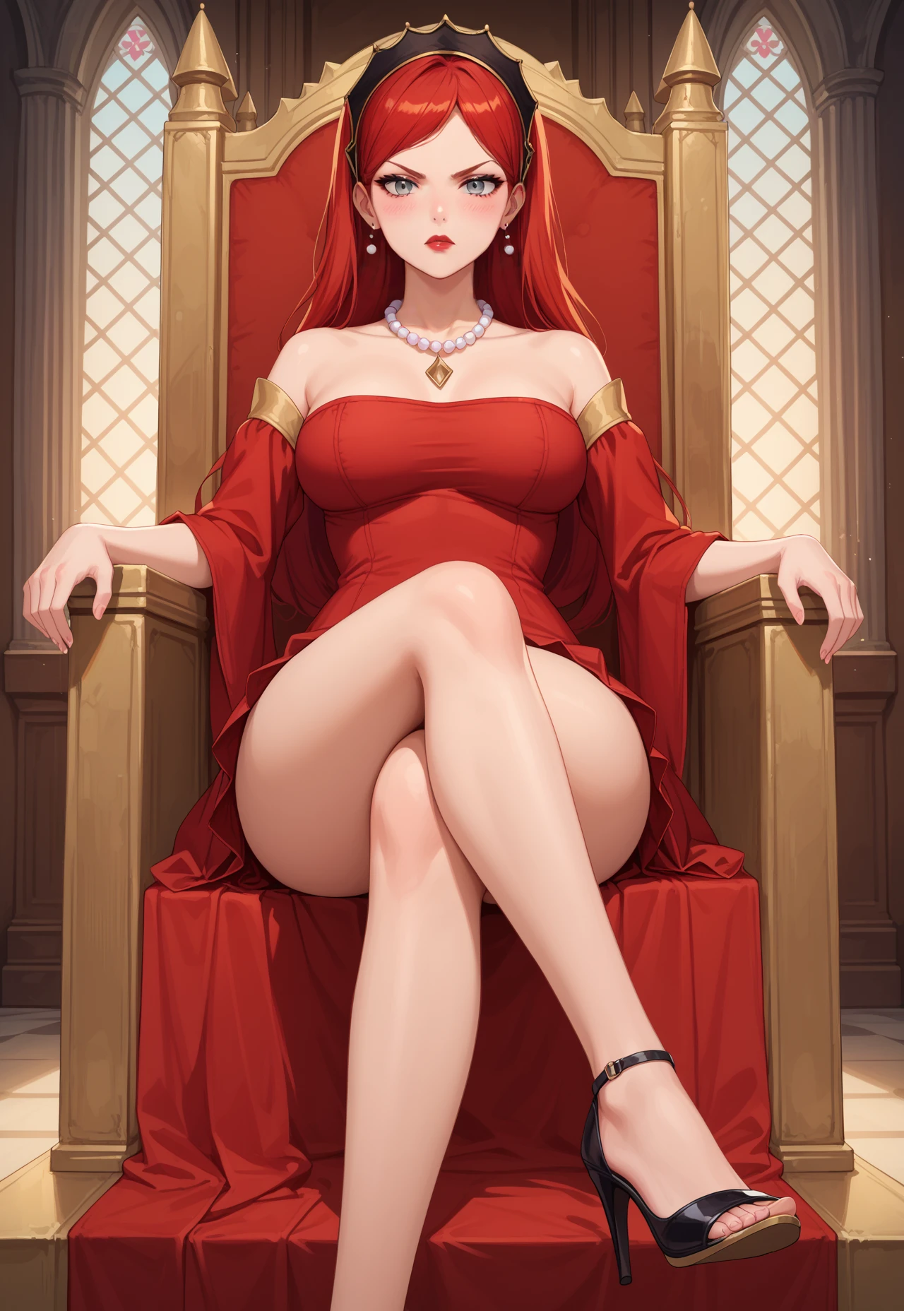 Hilda Boreas Greyrat, long hair, red hair, grey eyes, large breasts, black headband,