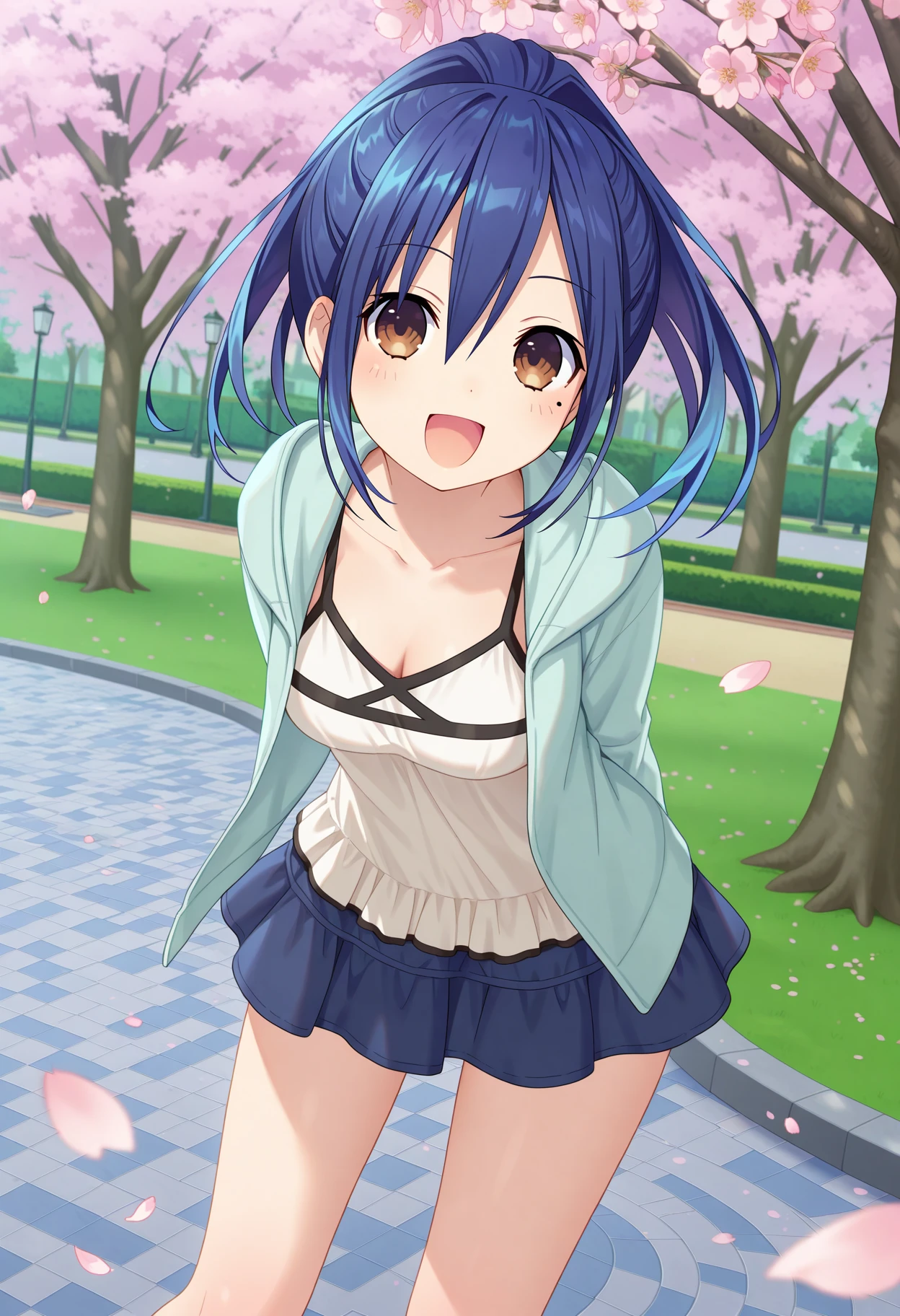 aamana, long hair, blue hair, ponytail, brown eyes, mole under eye, white camisole, hooded jacket, blue jacket, long sleeves, blue skirt