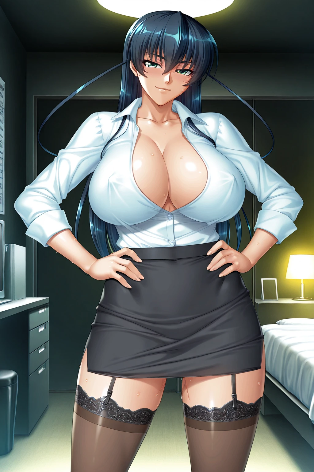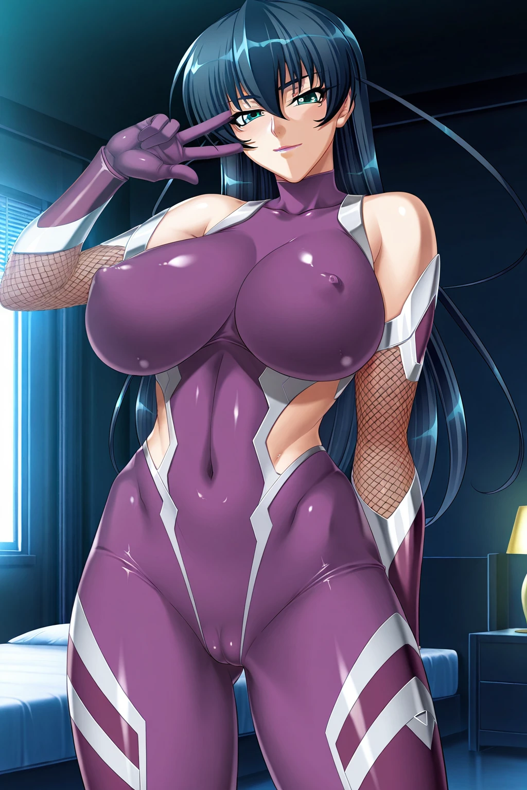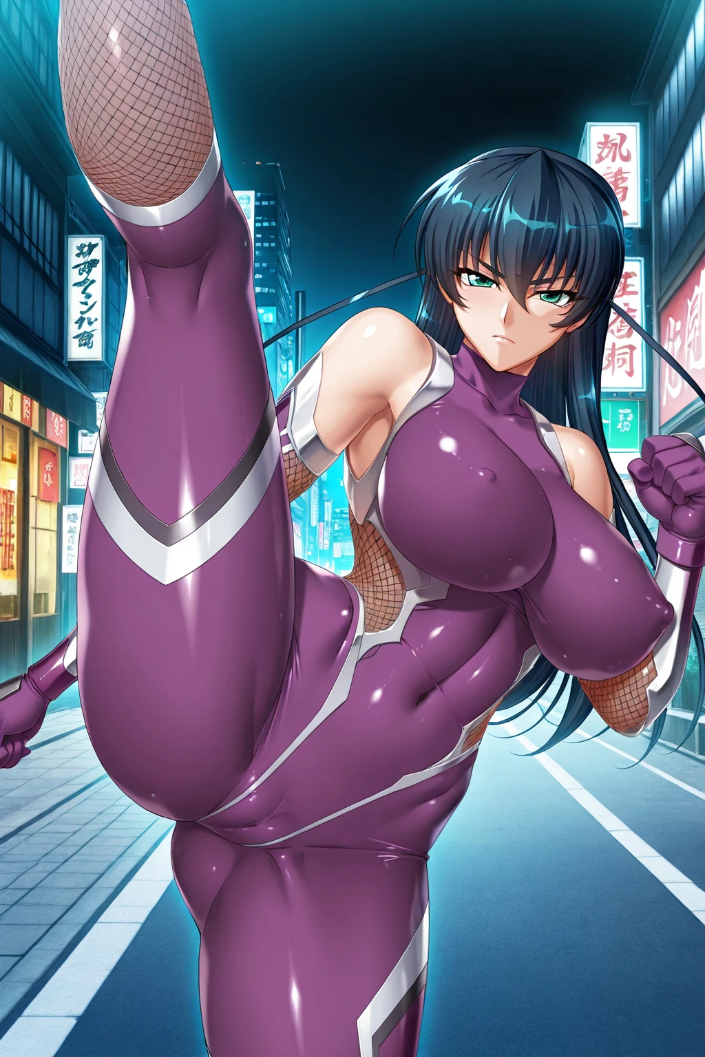 Asagi Igawa, long hair, large breasts, black hair, gloves, bare shoulders, green eyes, blue hair, elbow gloves, makeup, turtleneck, fishnets, skin tight, shiny clothes, impossible clothes, ninja, purple bodysuit, impossible bodysuit, high heels